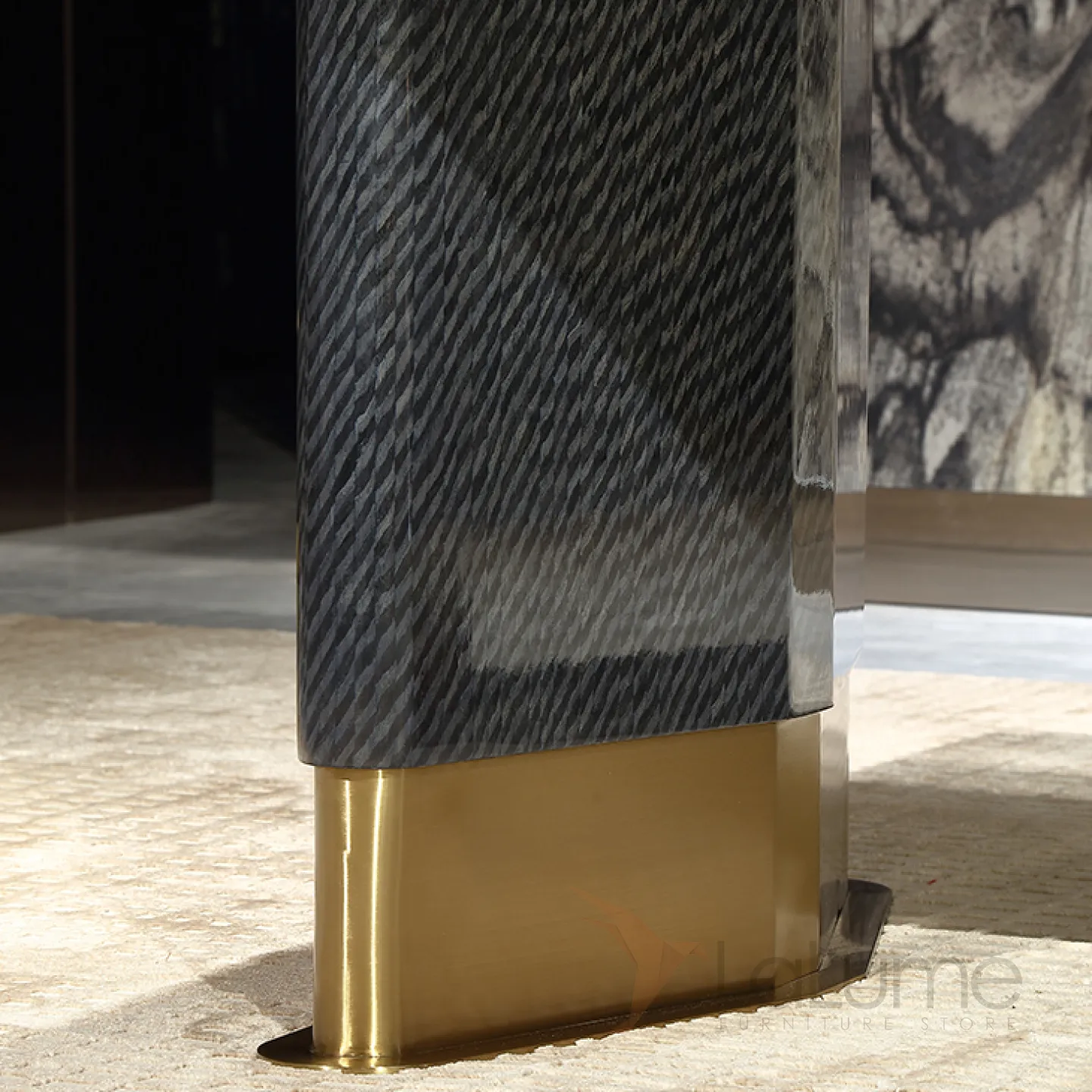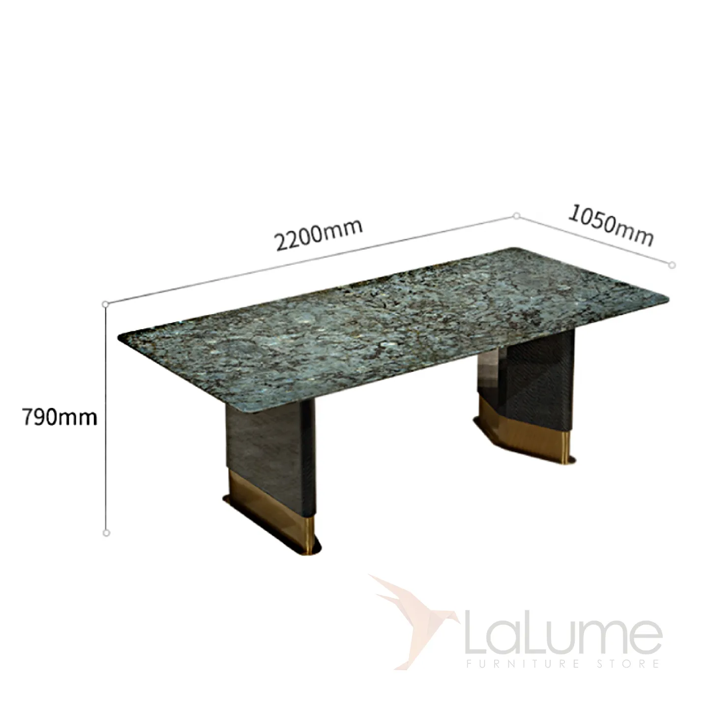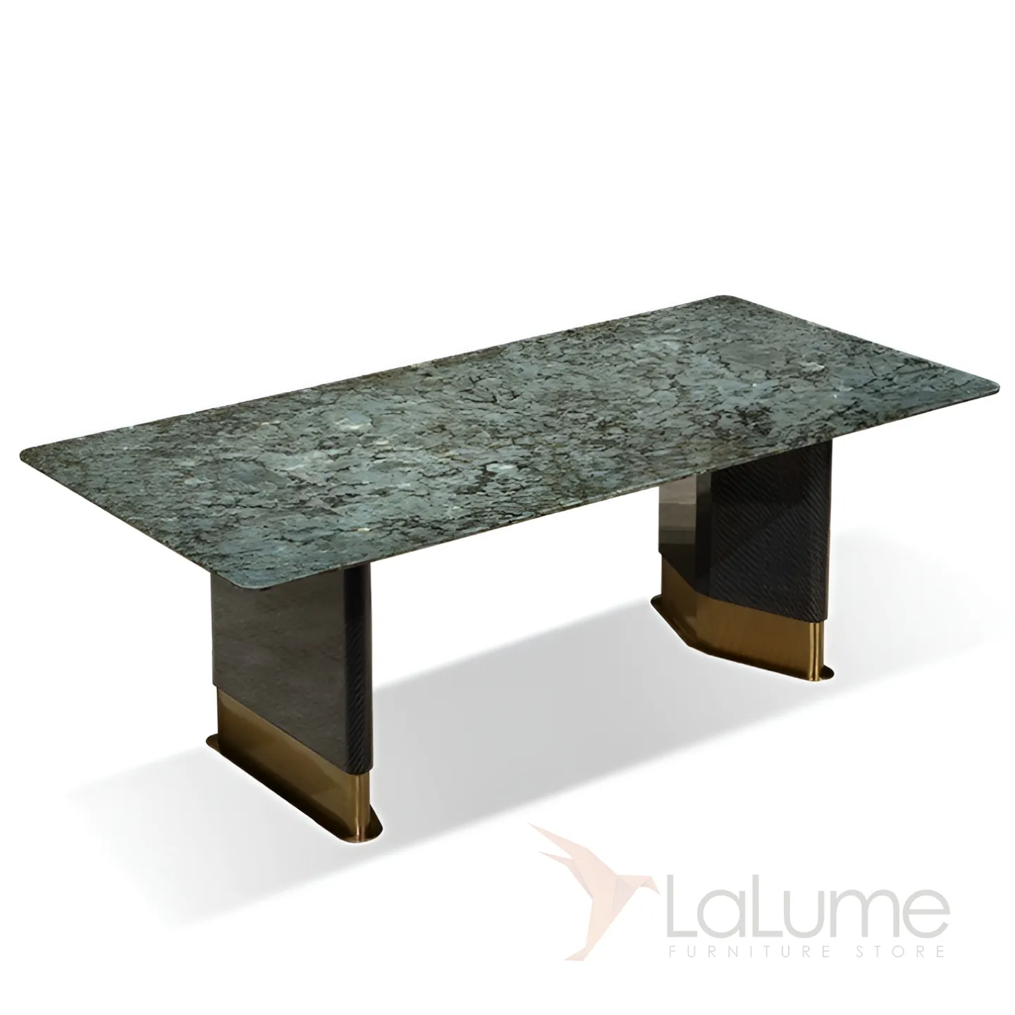 Большой обеденный стол с неповторимой столешницей из бразильского мрамора небесно-изумрудного оттенка, украшенной блестящими вкраплениями, созданными самой природой. Ножка из матовой латуни с золотым оттенком и основание из красного дерева придают столу изысканность и грациозность. За этим столом могут разместиться до 8 человек.