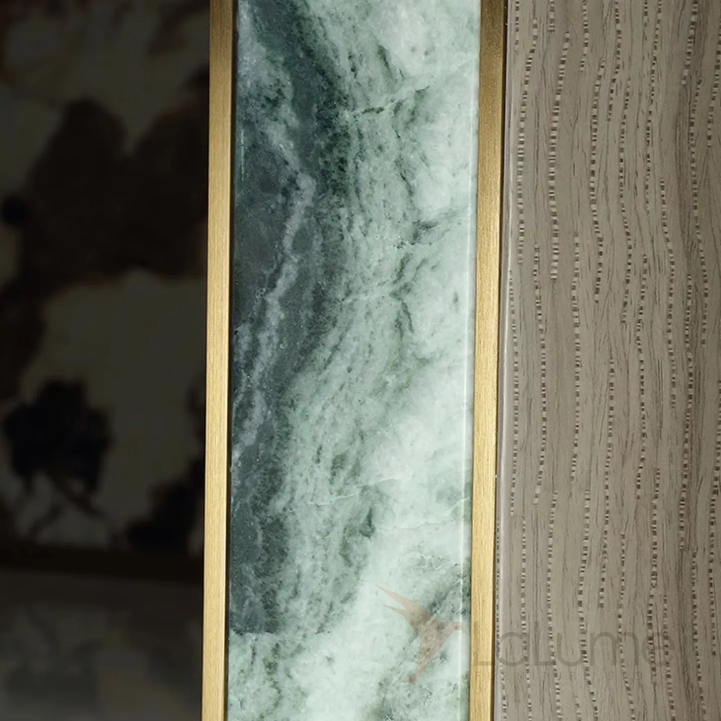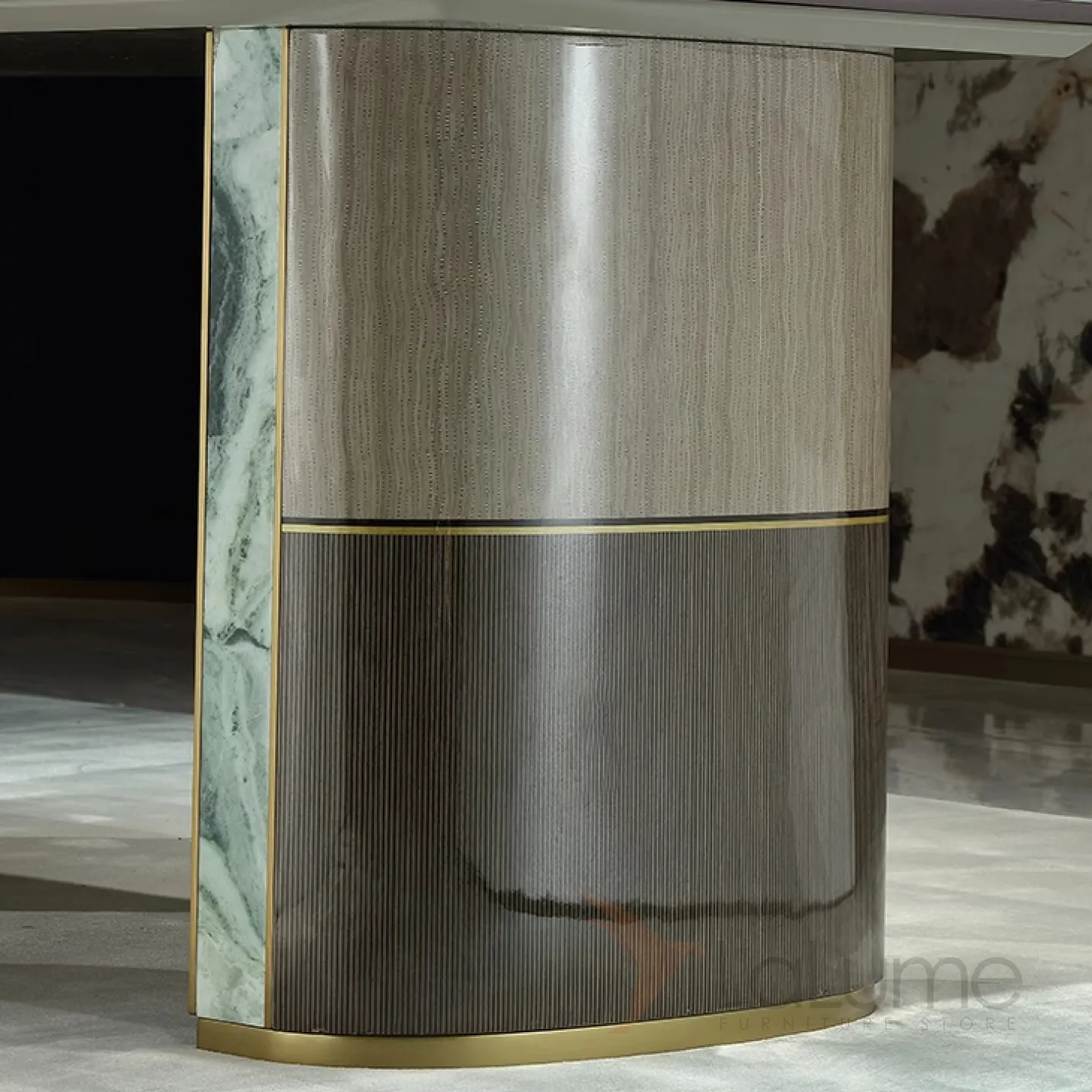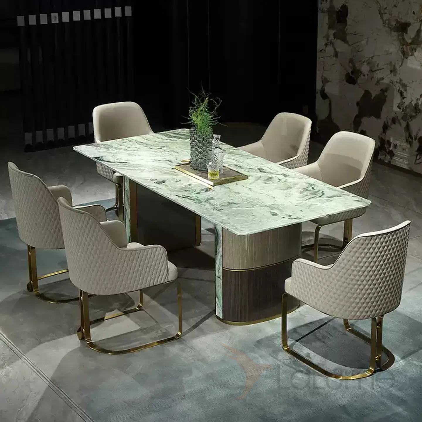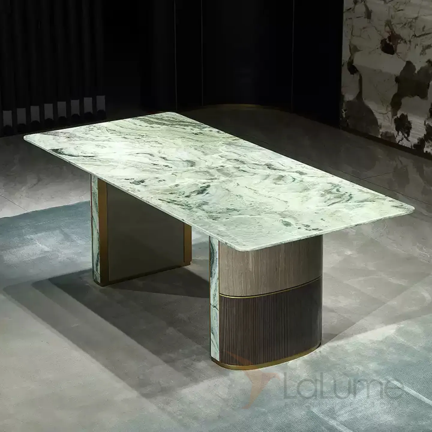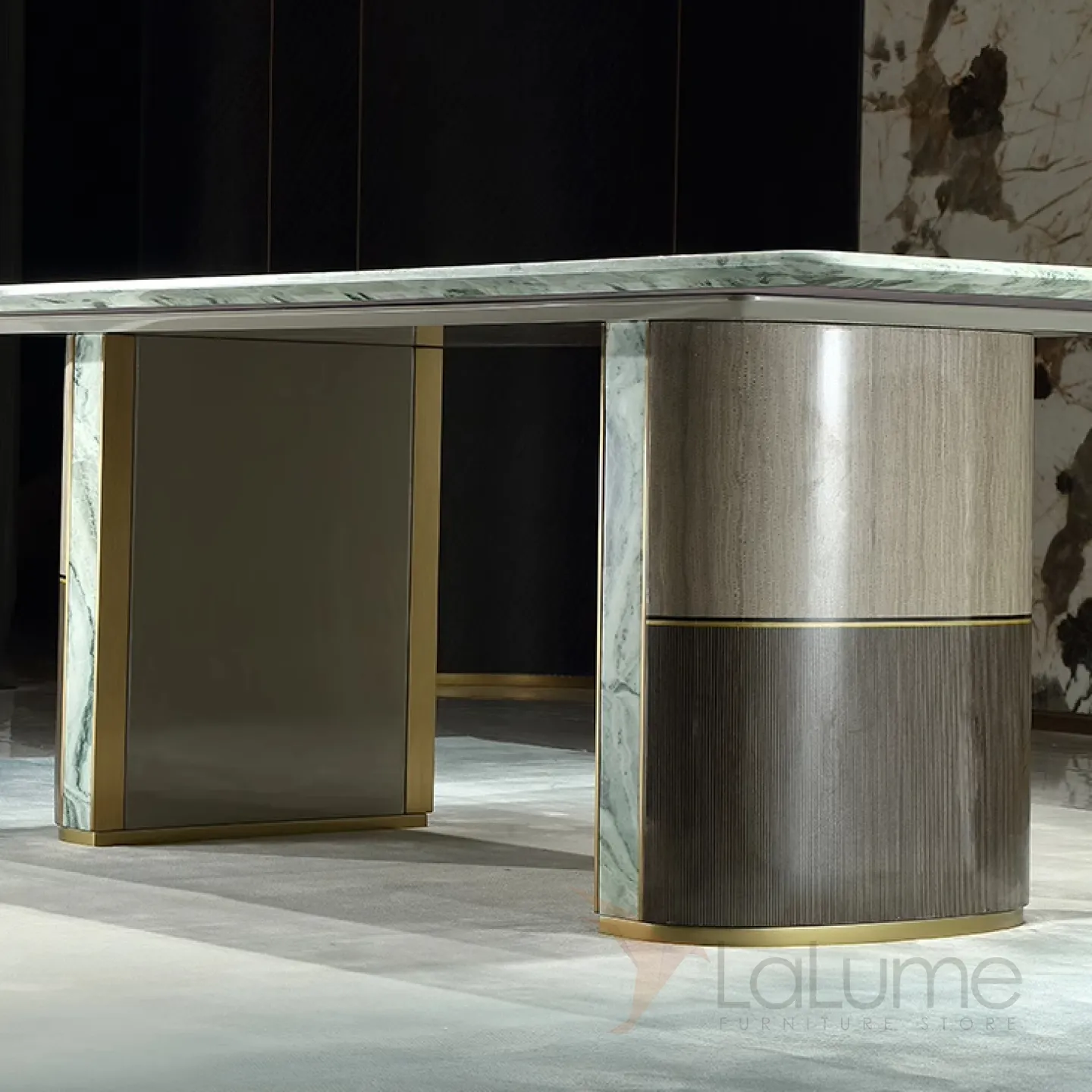 Большой обеденный стол с уникальной столешницей из натурального мрамора зелёного цвета. Его ножки, выполненные из матовой латуни с золотым оттенком, основание из красного дерева и мраморные подставки придают столу изысканность и грациозность. Этот стол способен вместить до восьми человек.