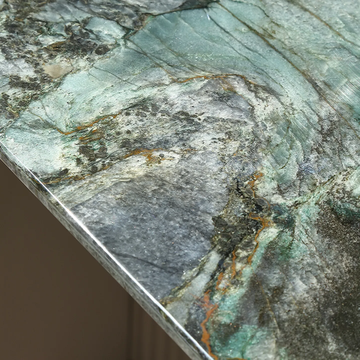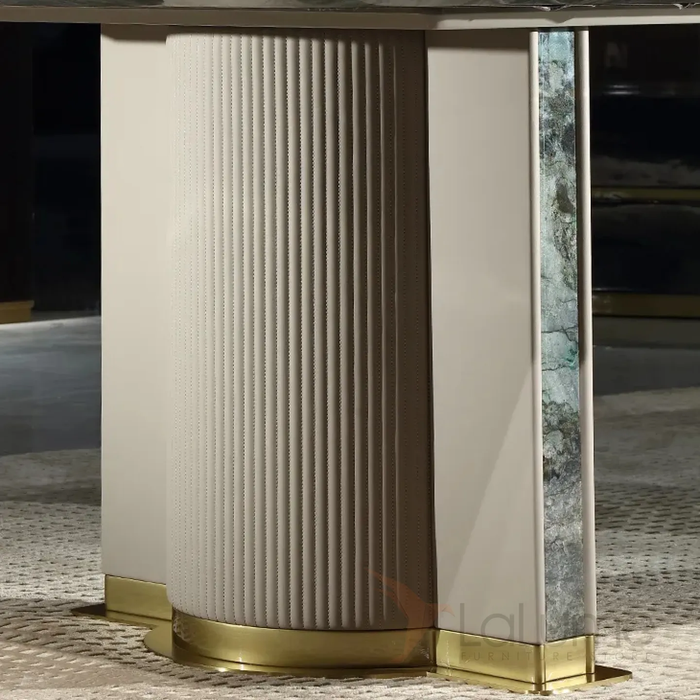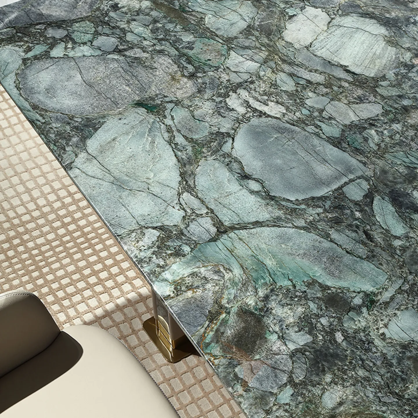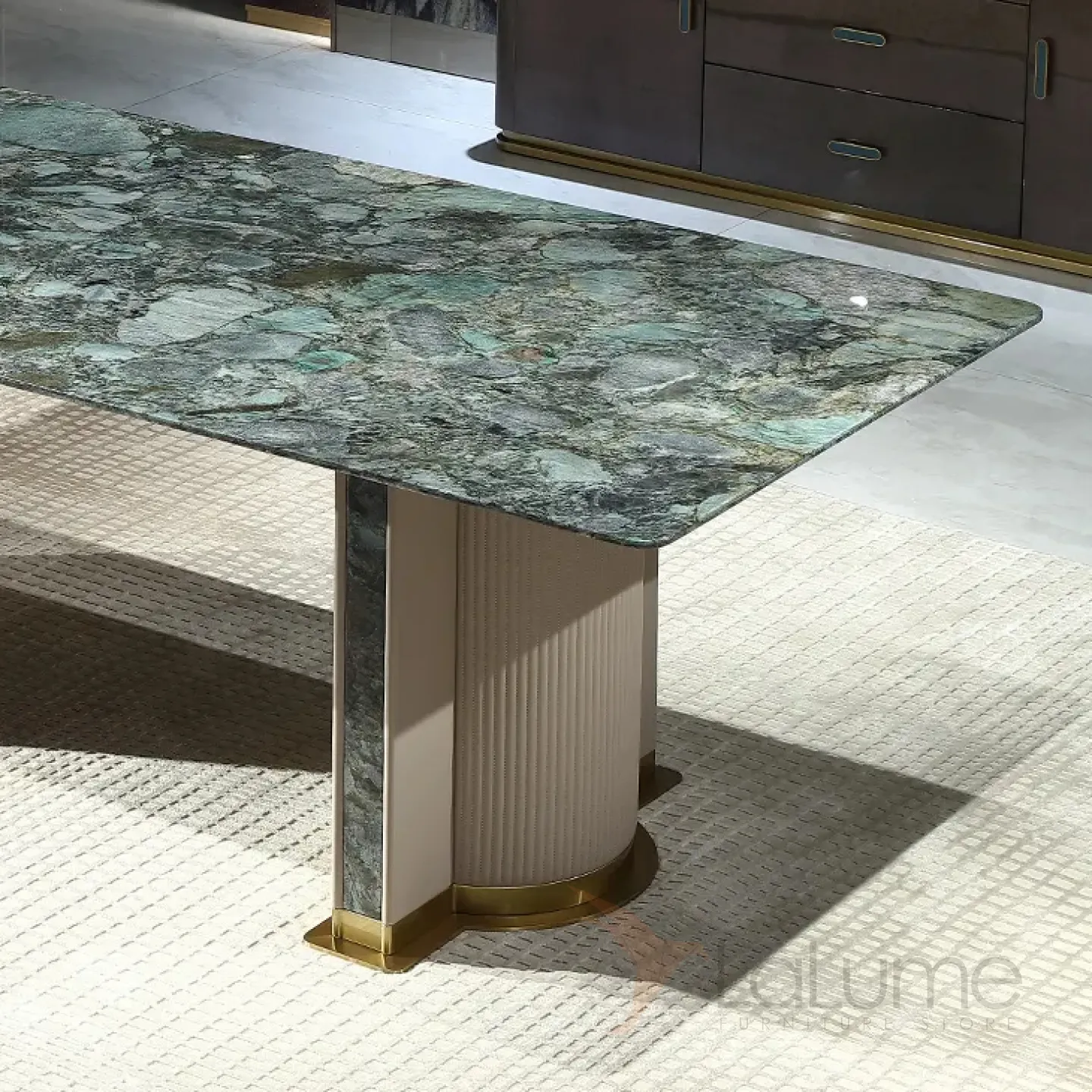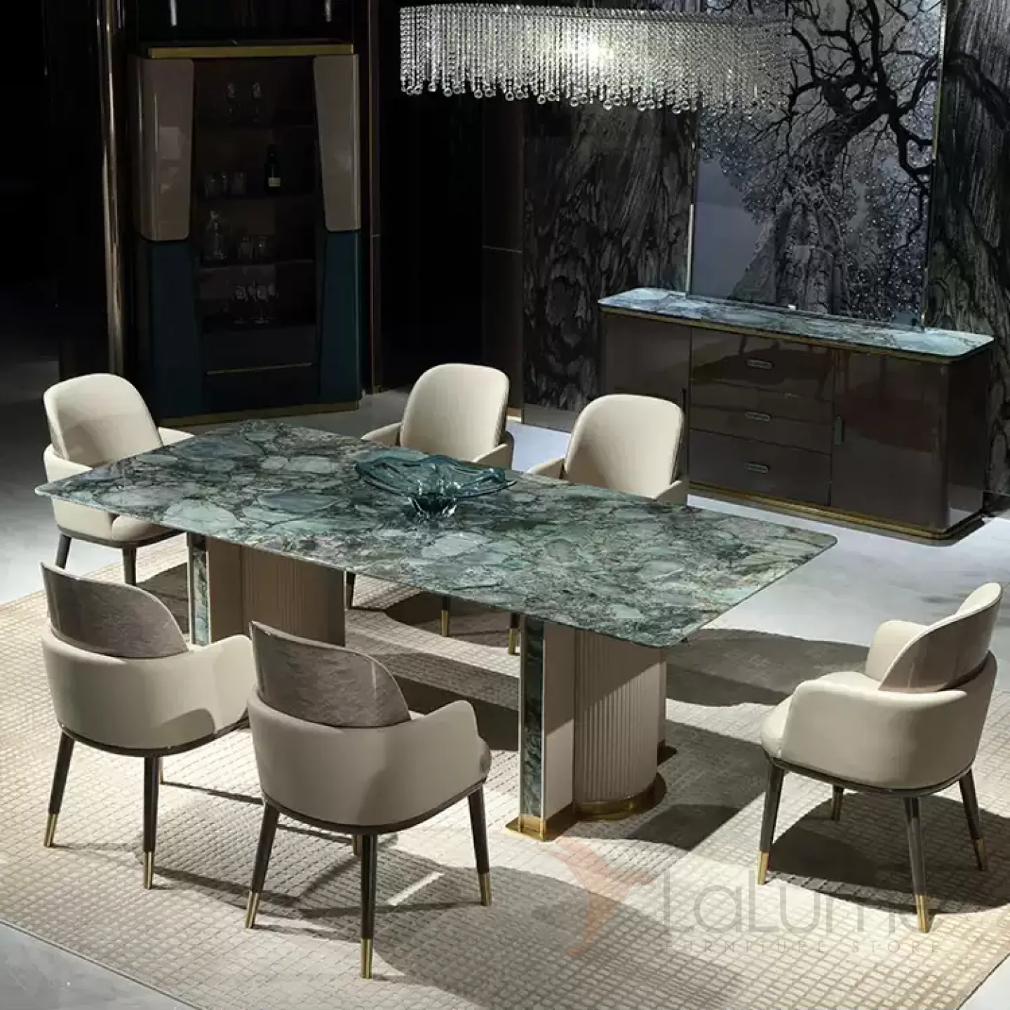 Изысканный обеденный стол в классическом стиле, с зеленой мраморной столешницей и каркасом из красного дерева, украшенным мрамором, текстилем и латунью, станет настоящим украшением вашего интерьера.