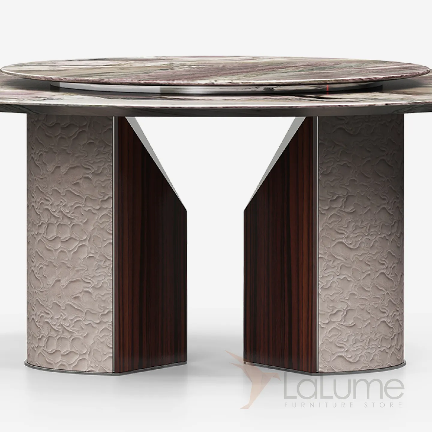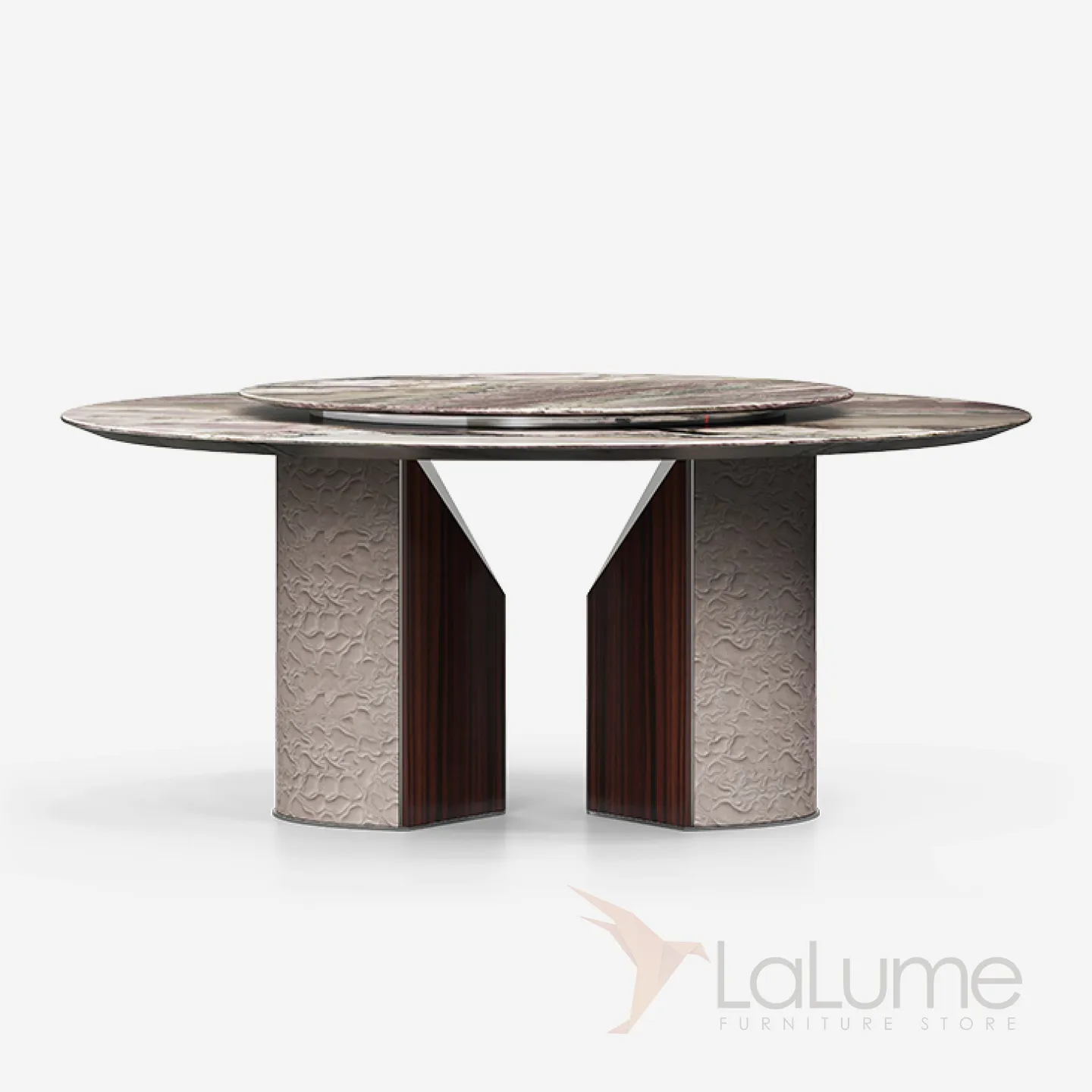 Элегантный стол из натурального дерева, мрамора и металла. Поворотный механизм позволяет легко менять угол обзора. За столом могут сесть до десяти человек, в зависимости от размера столешницы.