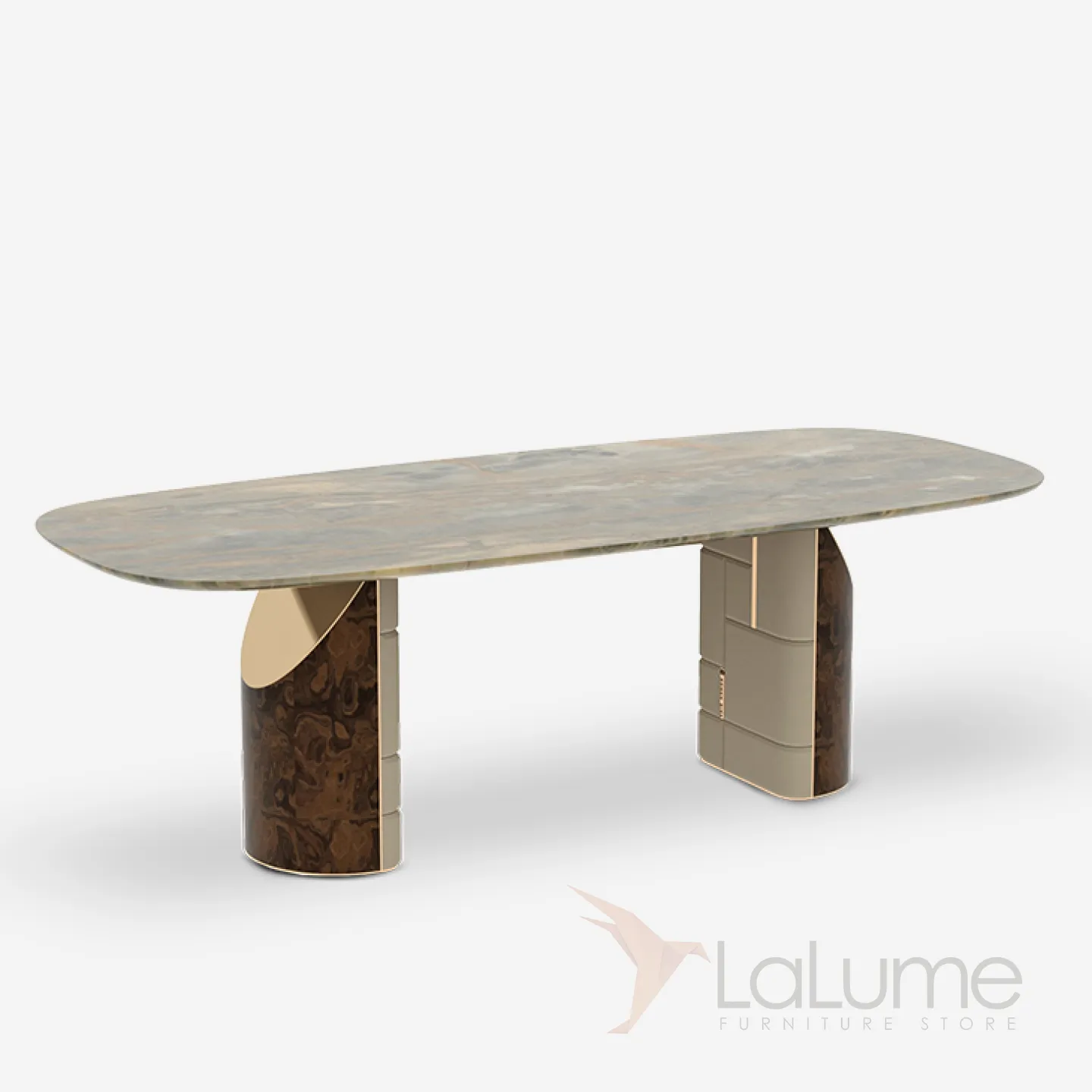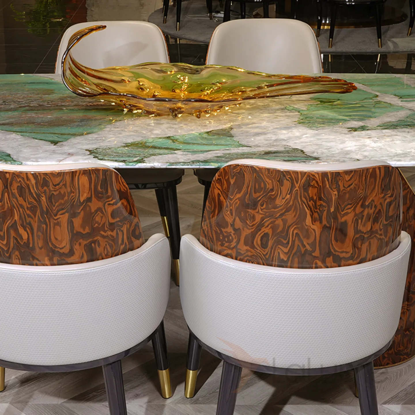 Изящный стол из дерева, зелёно-белого бразильского мрамора и металла. Ножки с уникальной формой и несколькими текстурами шпона. Вмещает до десяти гостей, в зависимости от длины столешницы.