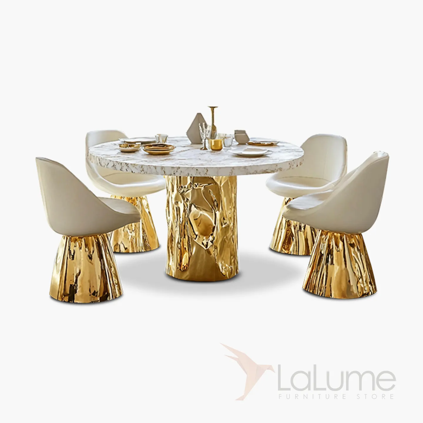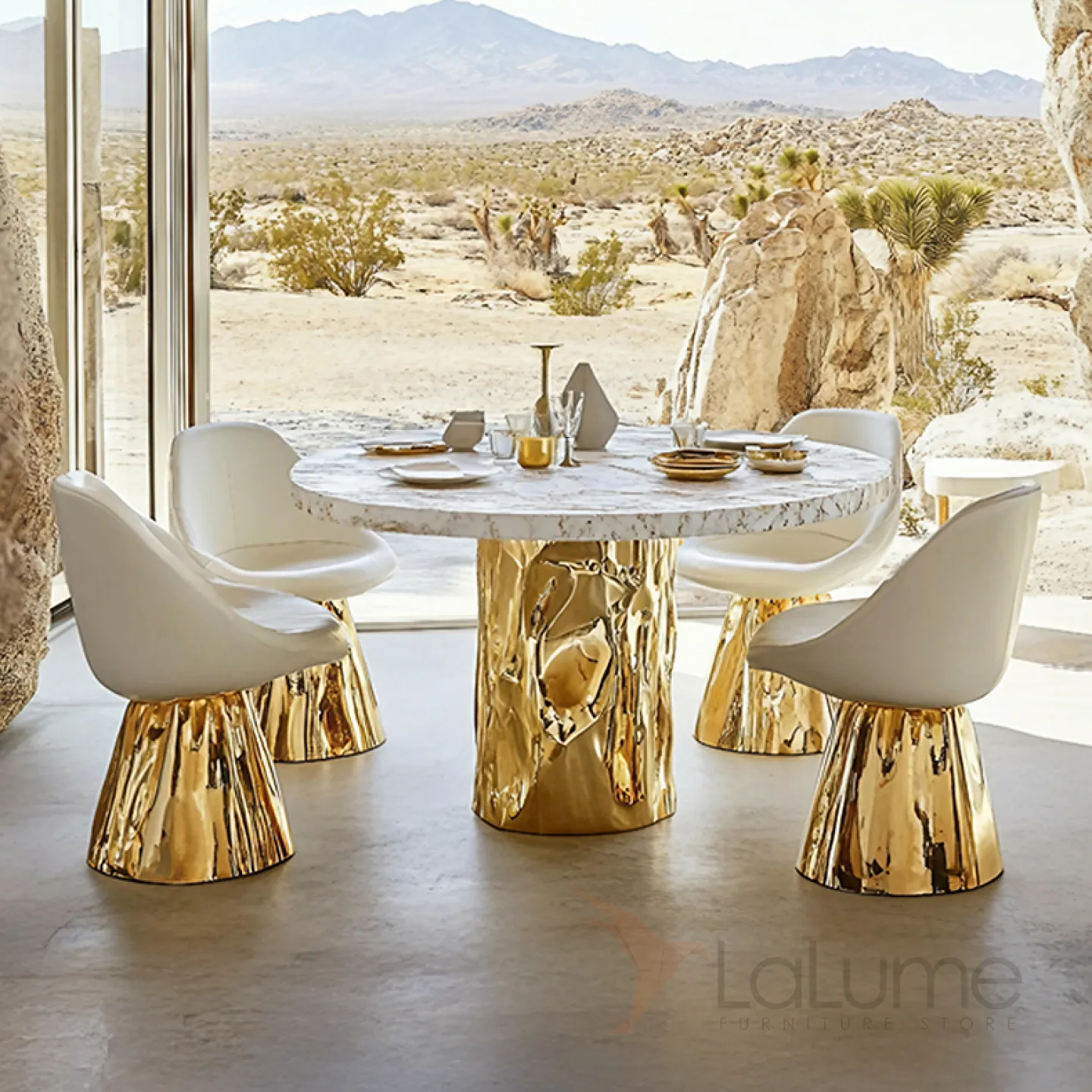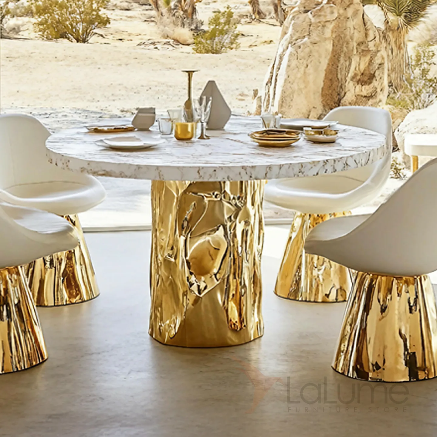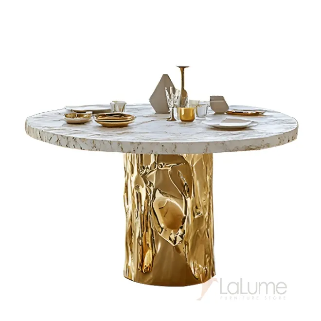 Стол с уникальным дизайном и фактурой преобразит любое пространство. Его основание из прочного сплава ASA покрыто специальным золотым составом. Поверхность стола изготовлена из натурального мрамора.