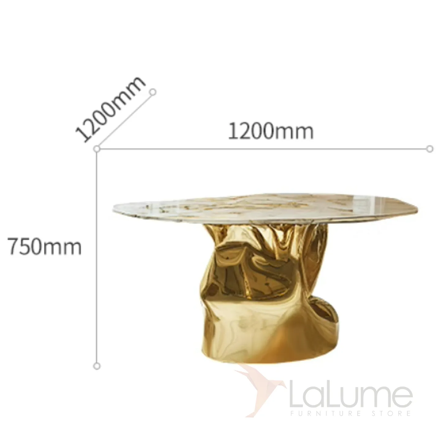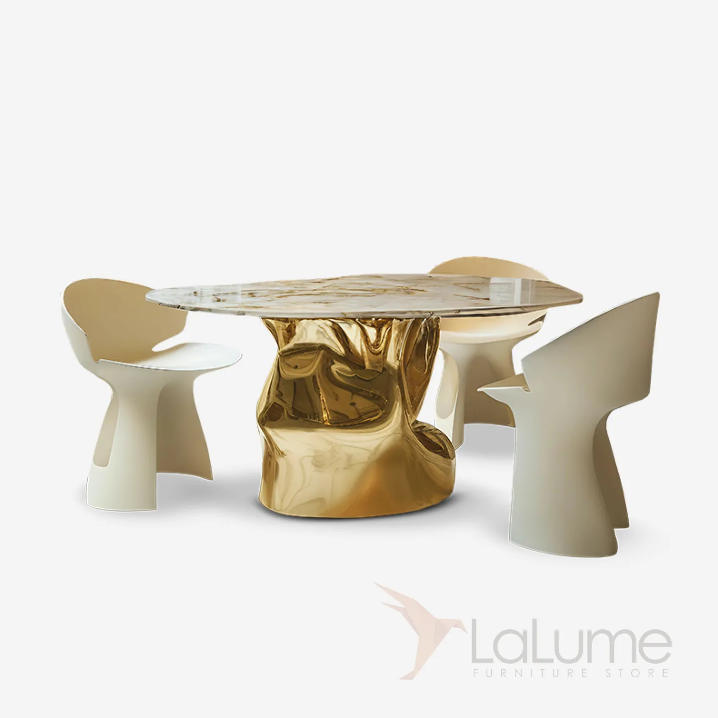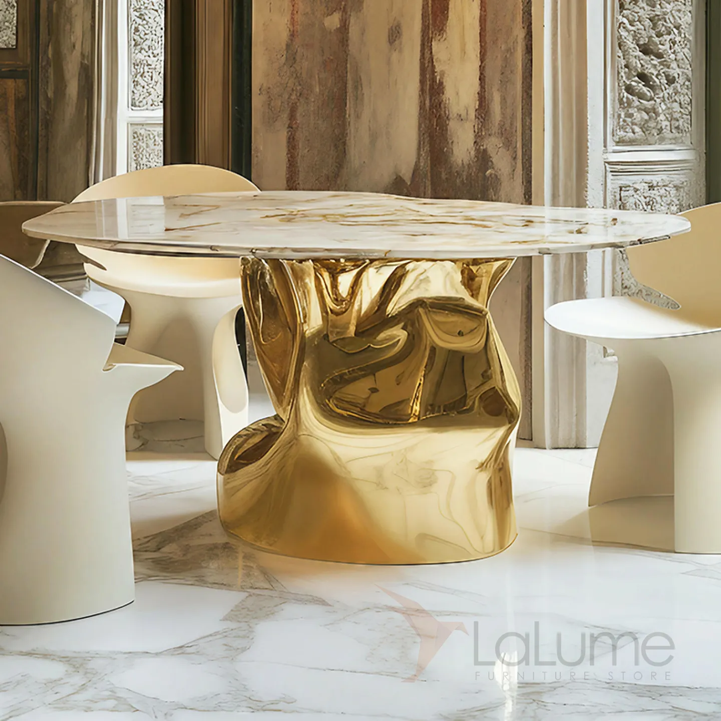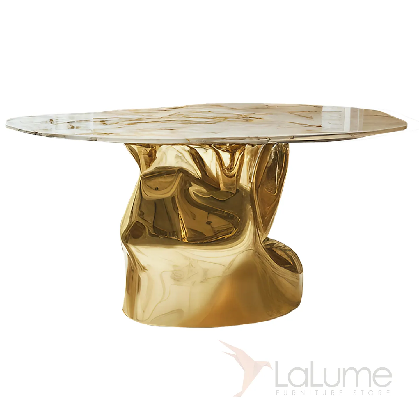 Стол с уникальным дизайном и фактурой преобразит любое пространство. Его основание из прочного сплава ASA покрыто специальным золотым составом. Поверхность стола изготовлена из натурального мрамора.