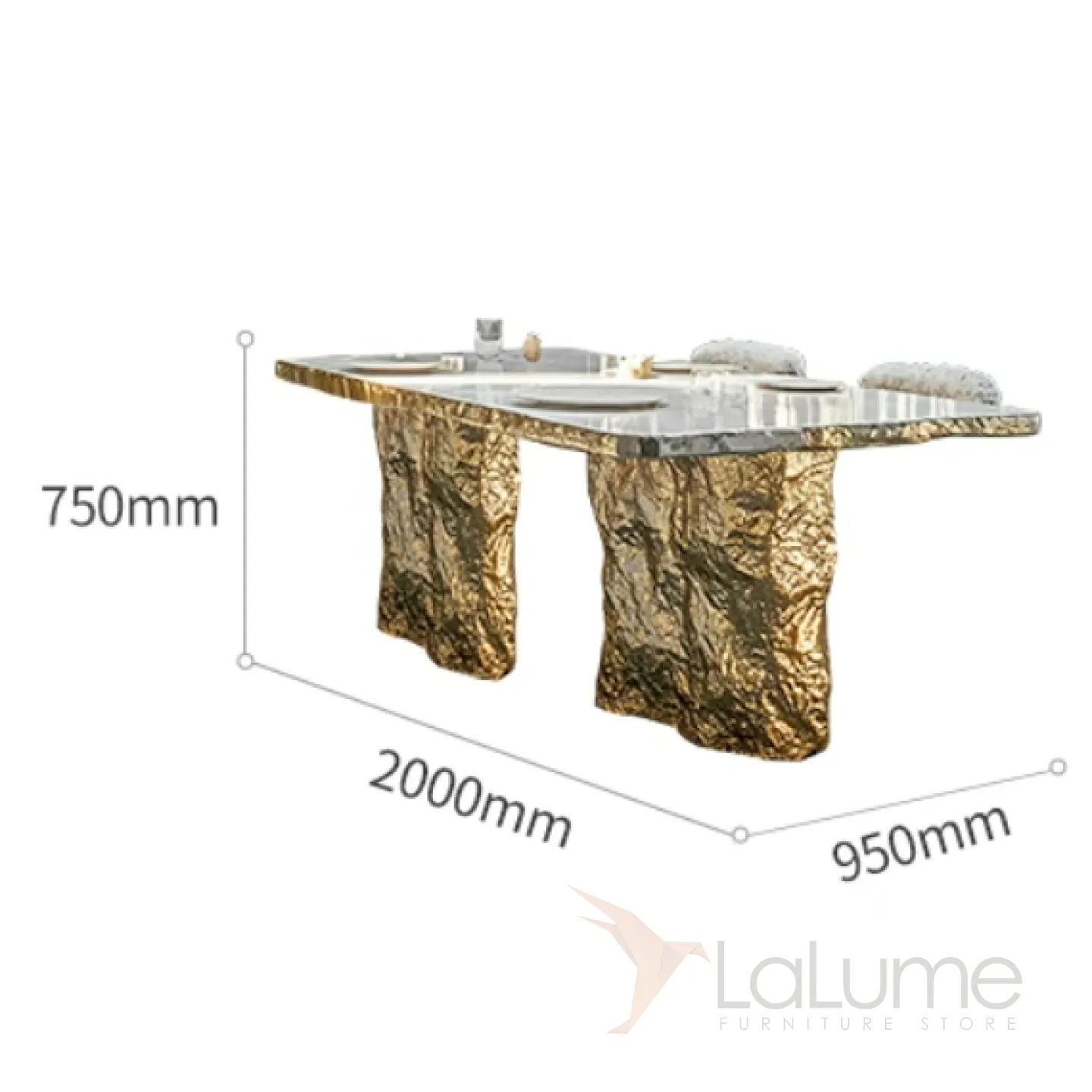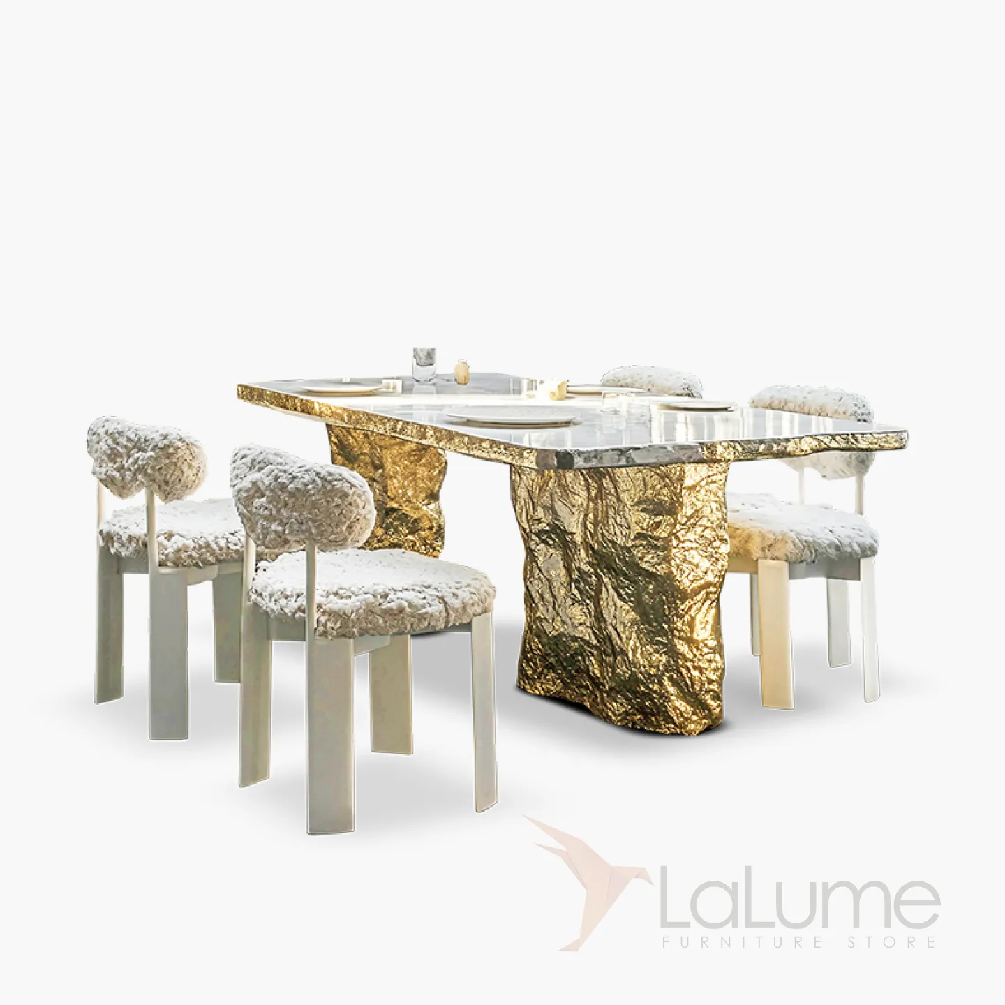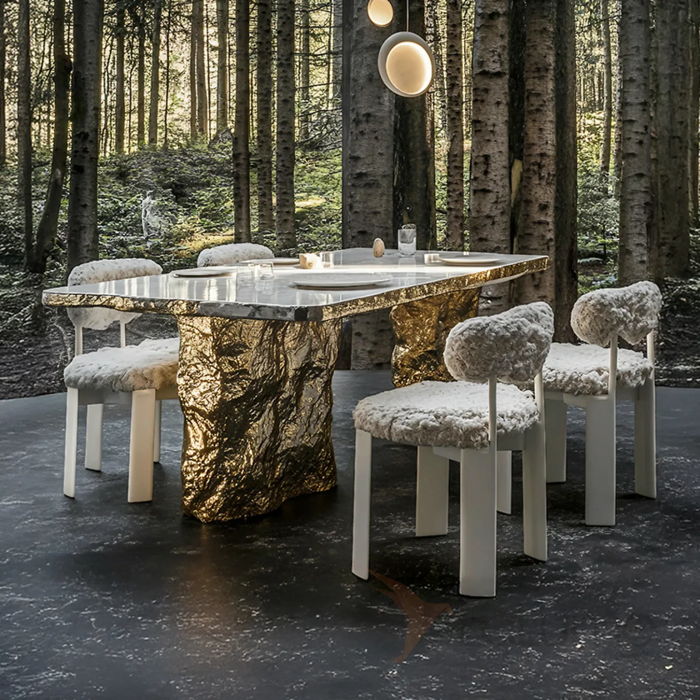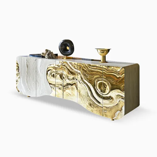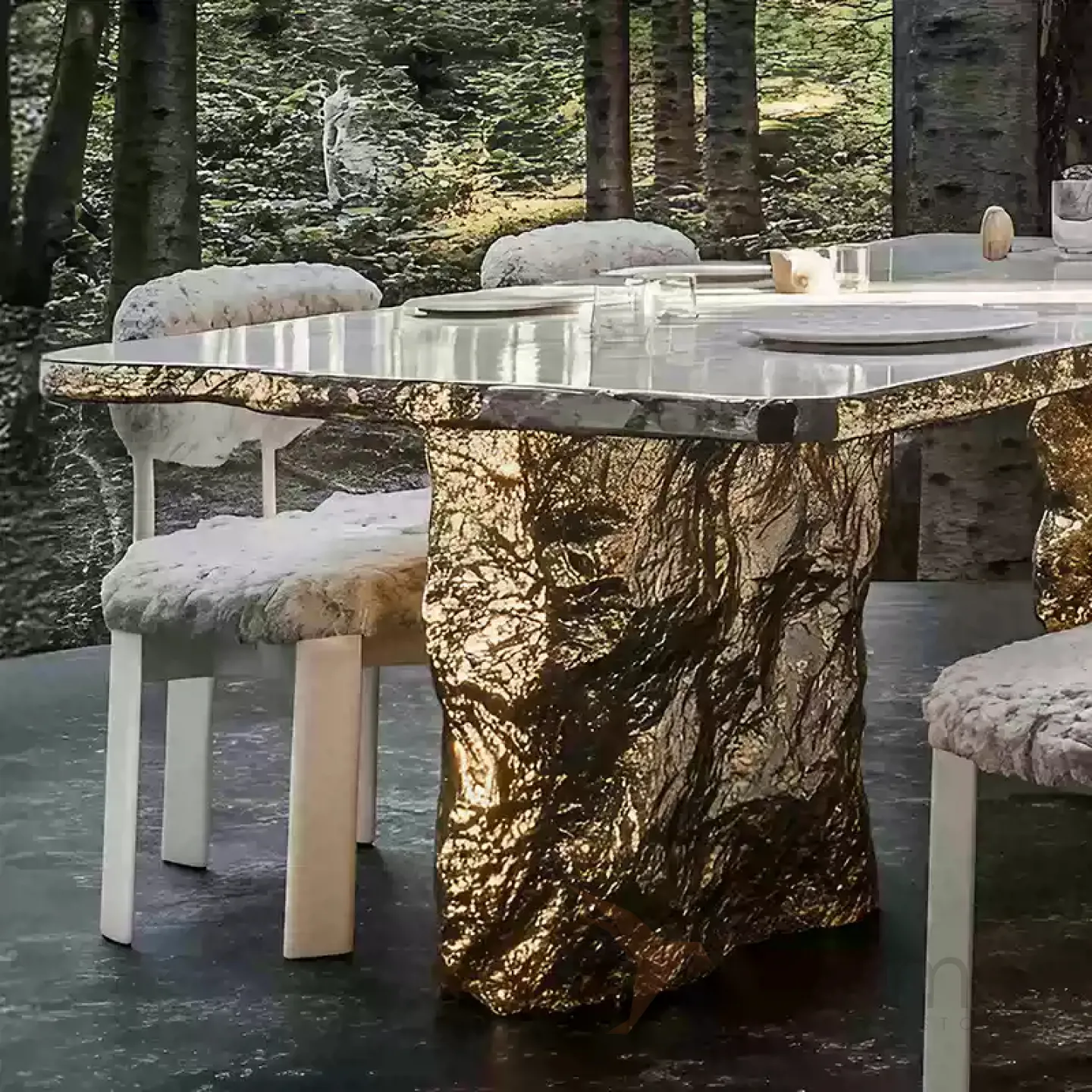 Оригинальный стол с изысканным дизайном и текстурой станет украшением любого интерьера. Прочная основа из сплава ASA покрыта золотым составом, а столешница выполнена из натурального мрамора. За ним с комфортом могут разместиться до десяти человек.