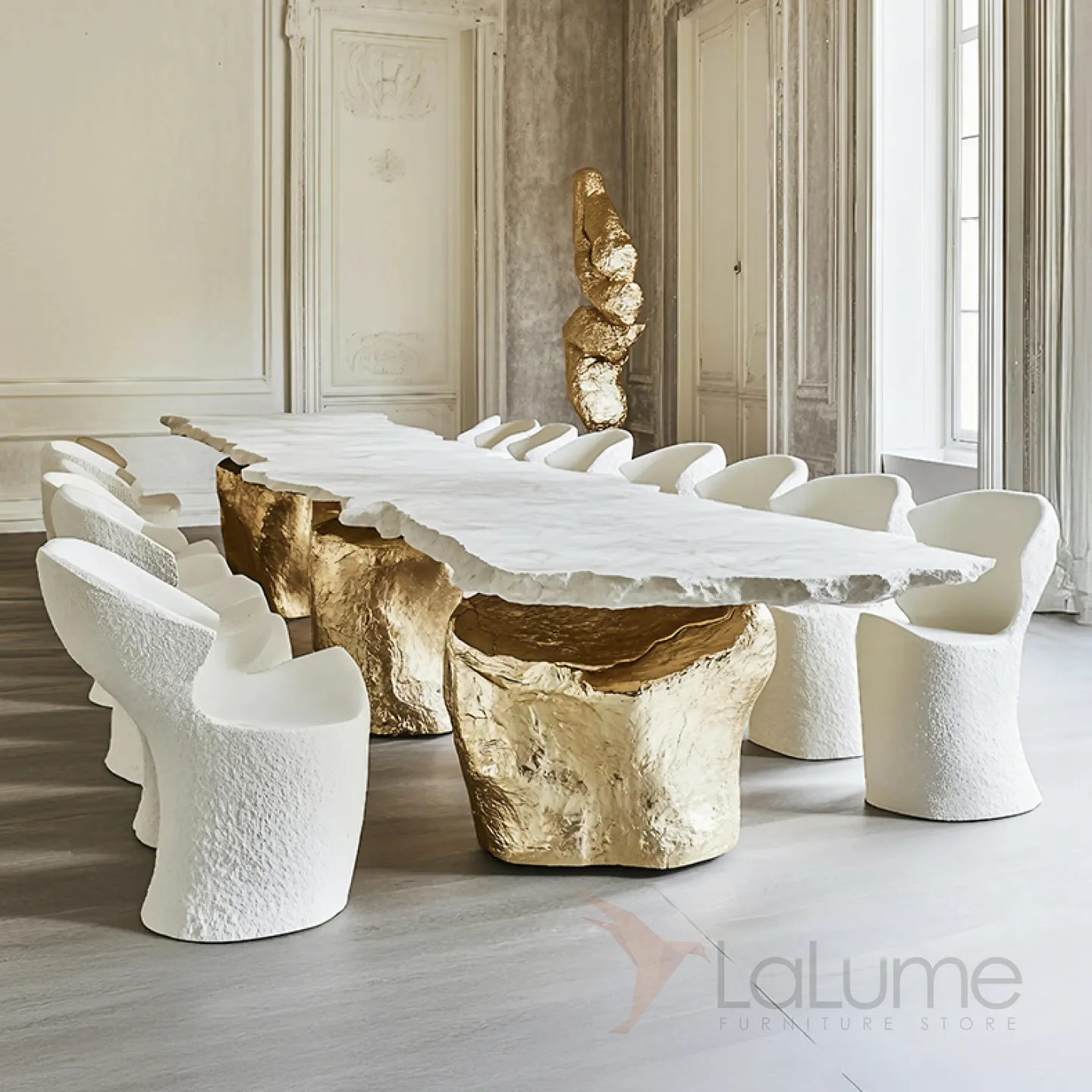 Стол с оригинальным дизайном и приятной текстурой станет ярким акцентом в любом интерьере. Прочная основа из сплава ASA с золотым покрытием и столешница из натуральной древесины создают гармоничный образ. За ним удобно разместятся до восьми человек.