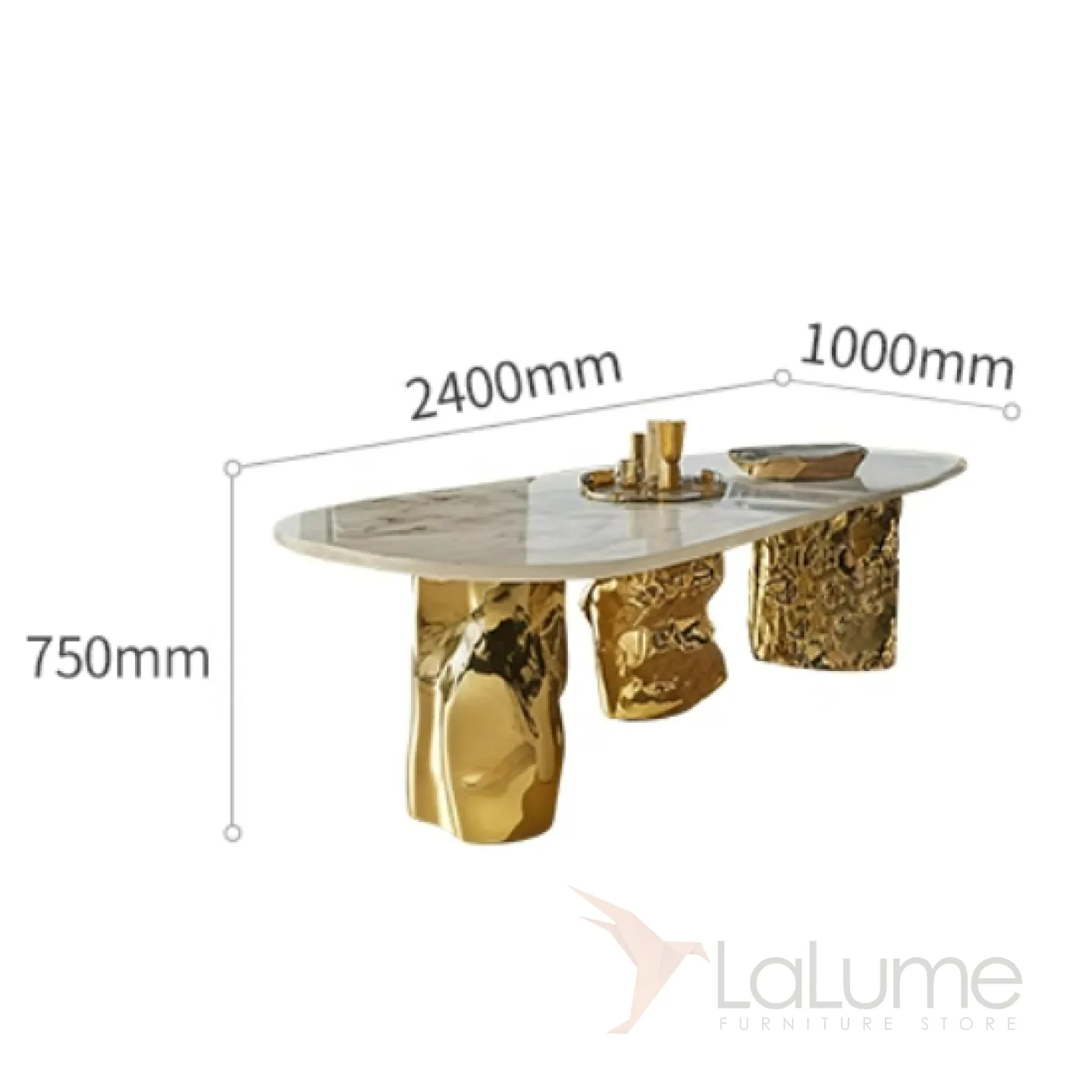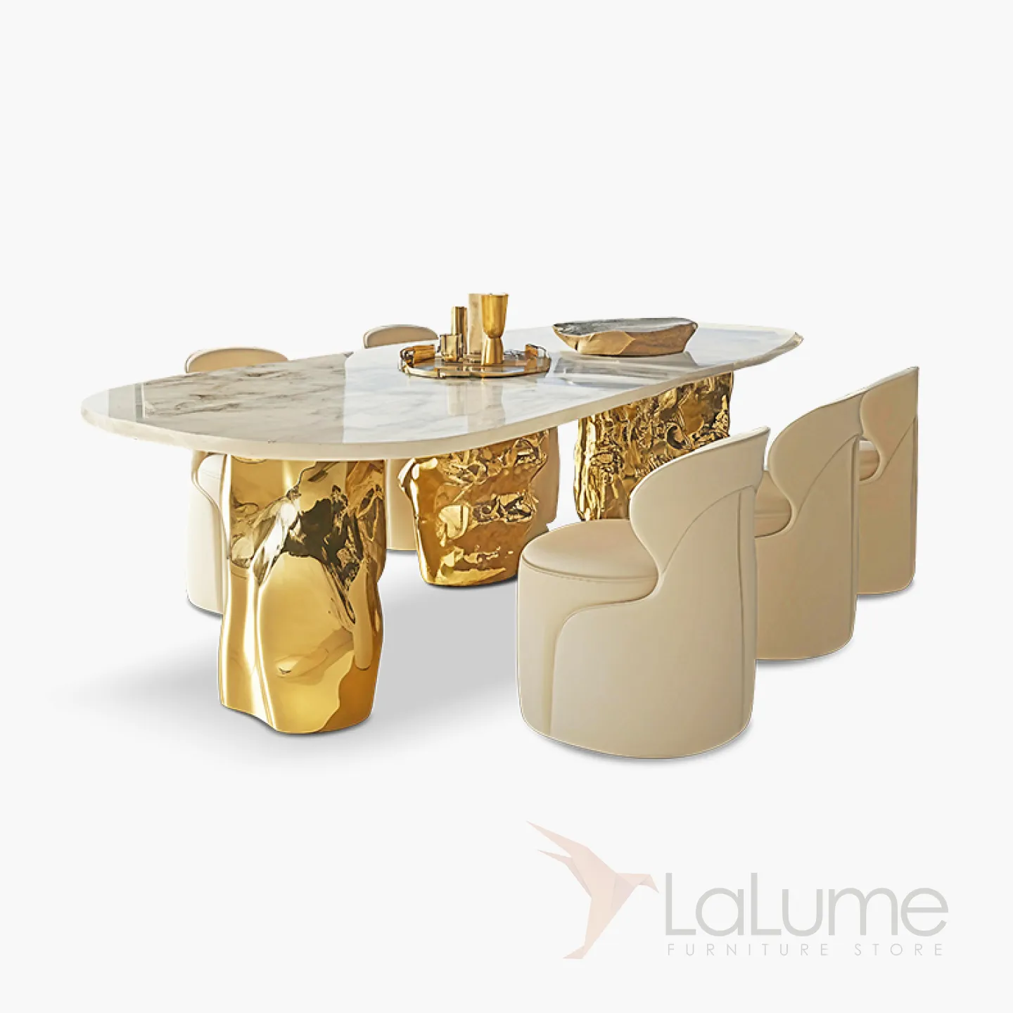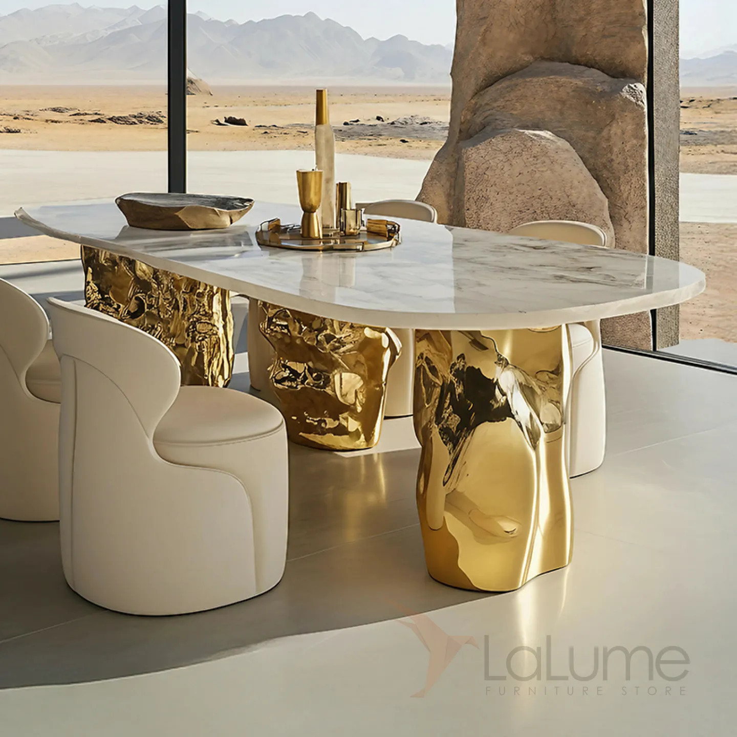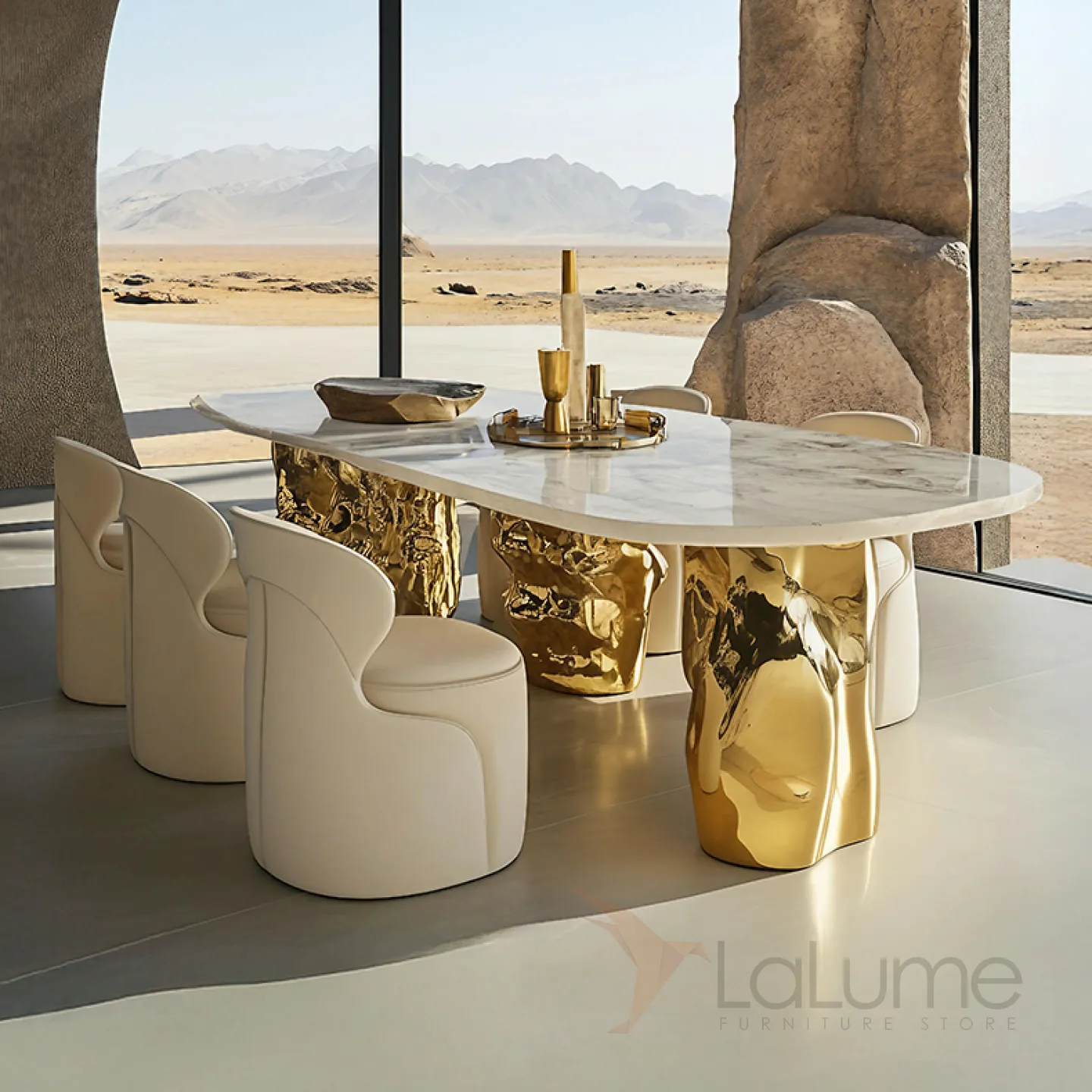 Стол с уникальным дизайном и приятной текстурой станет эффектным акцентом в любом интерьере. Прочная основа из золотого сплава ASA и столешница из натурального мрамора гармонично сочетаются, создавая стильный образ. За ним с комфортом могут разместиться до десяти человек.