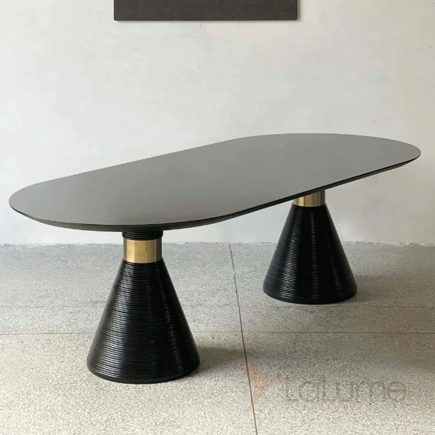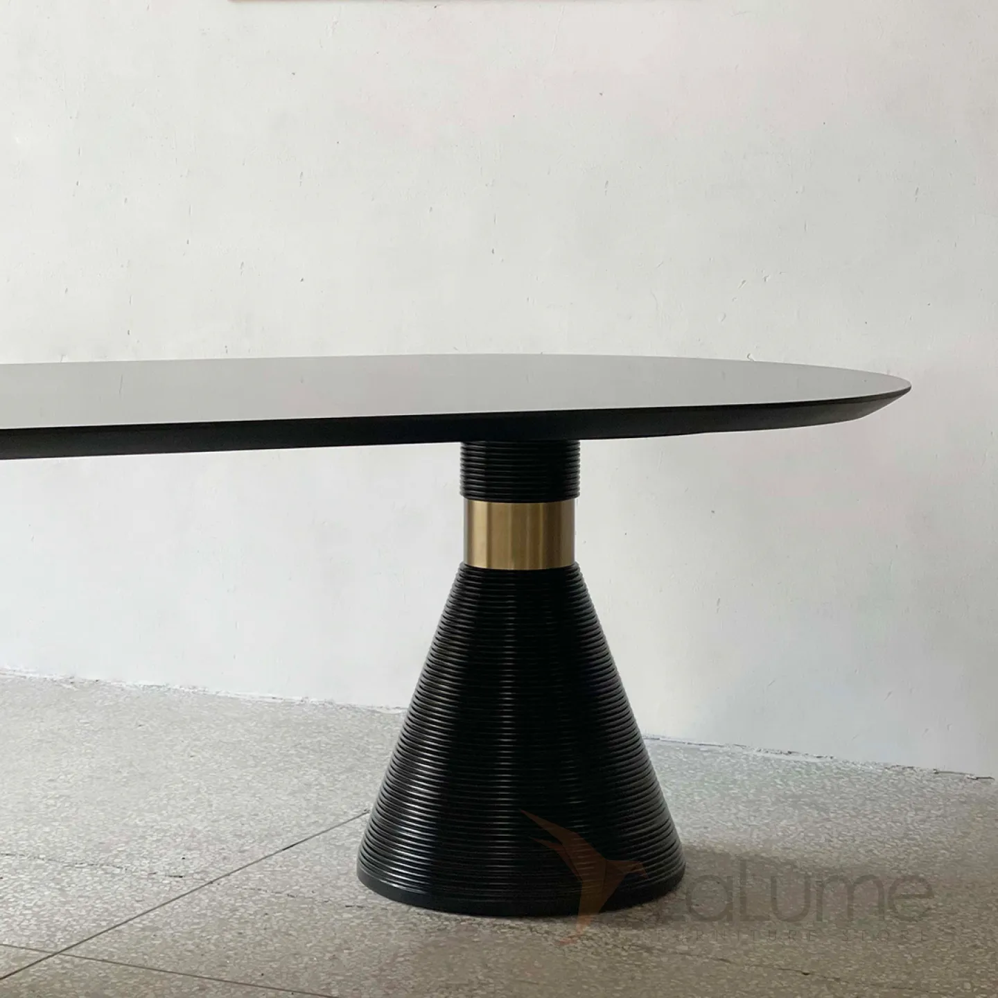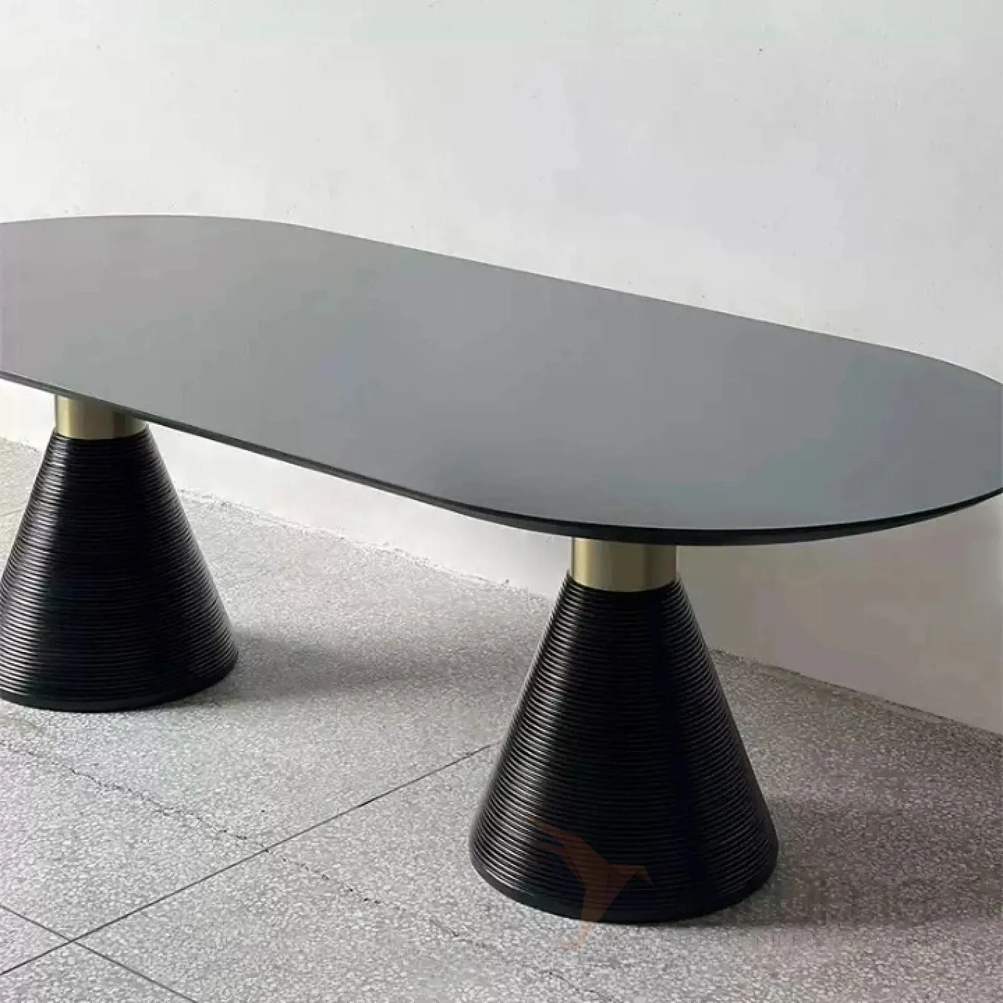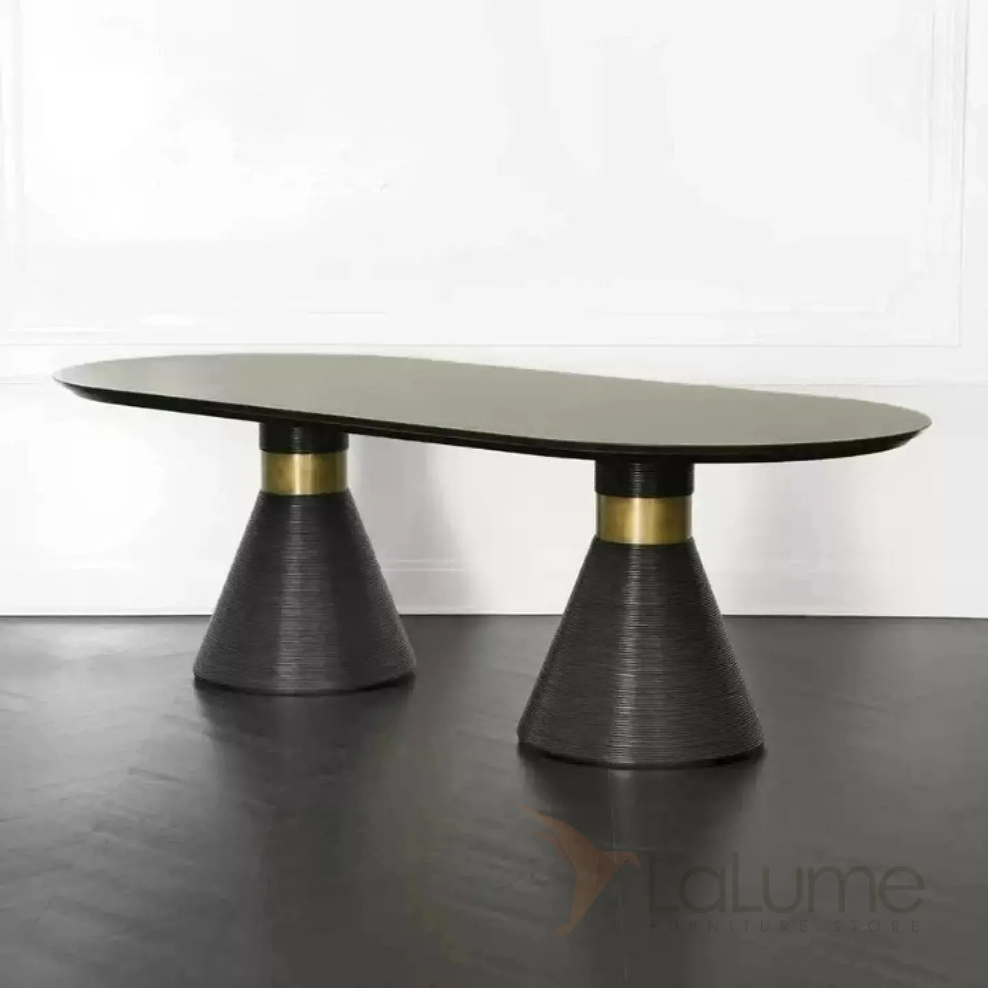 Обеденный стол из натурального дерева и шпона с элементами из нержавеющей стали. Ножки необычной формы, напоминающие конусы. Стол доступен в двух цветовых вариантах: белом и чёрном, что позволяет подобрать его под любой интерьер.