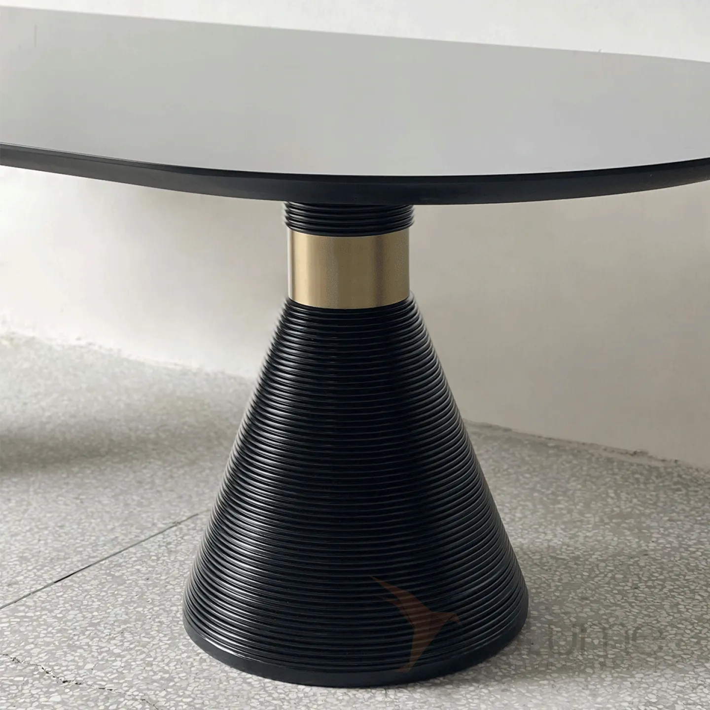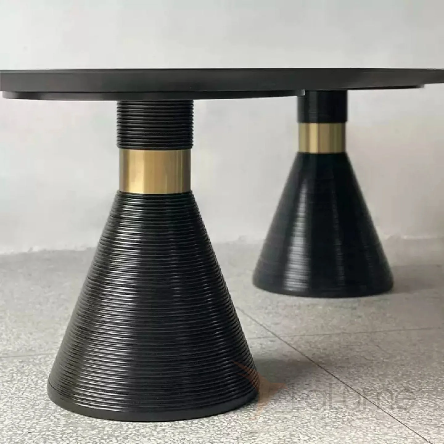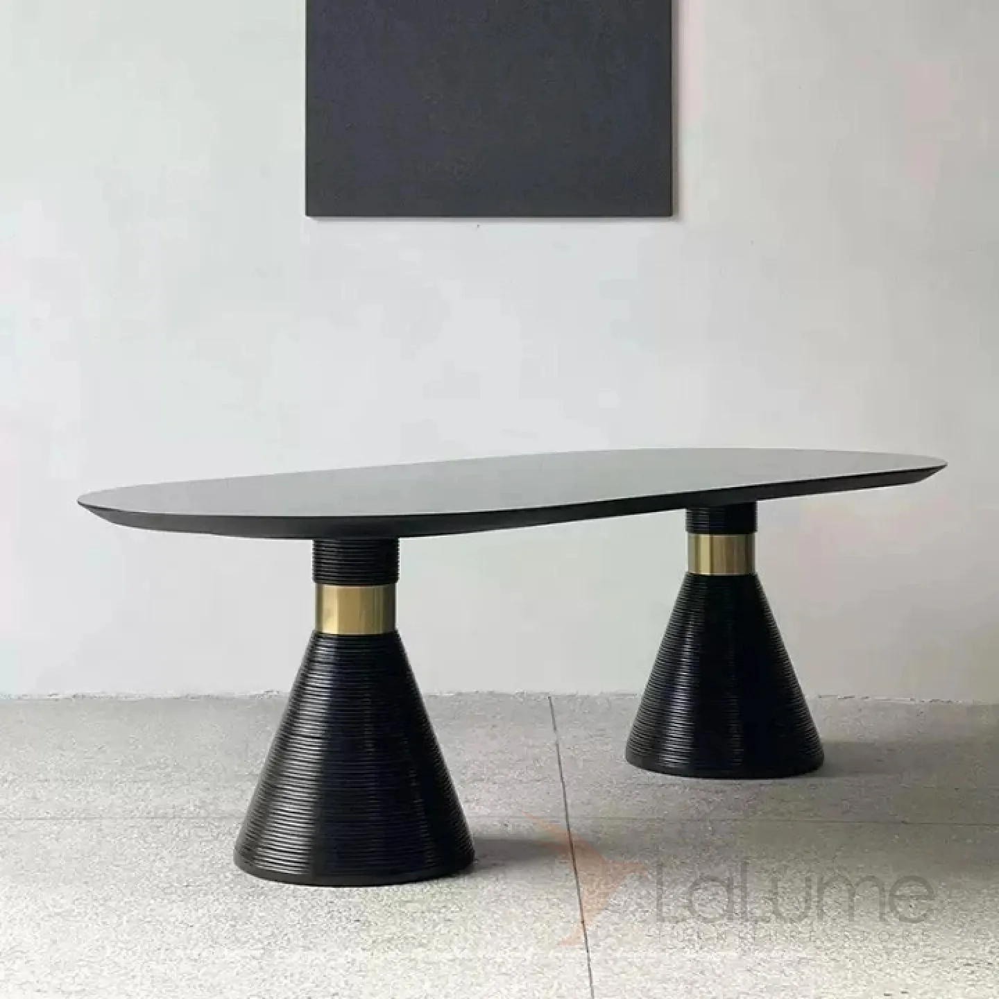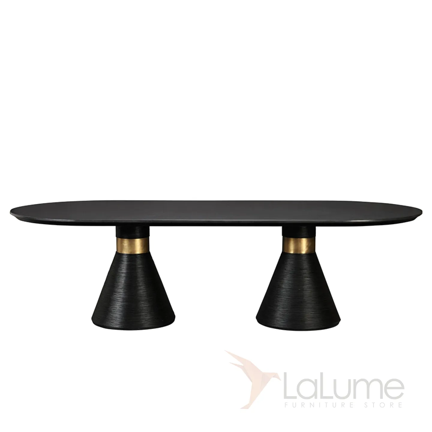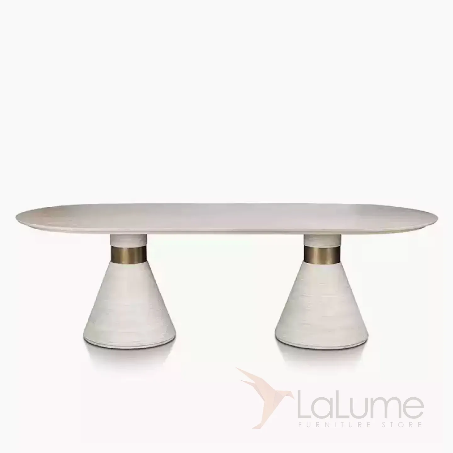 Обеденный стол из натурального дерева и шпона с элементами из нержавеющей стали. Ножки необычной формы, напоминающие конусы. Стол доступен в двух цветовых вариантах: белом и чёрном, что позволяет подобрать его под любой интерьер.