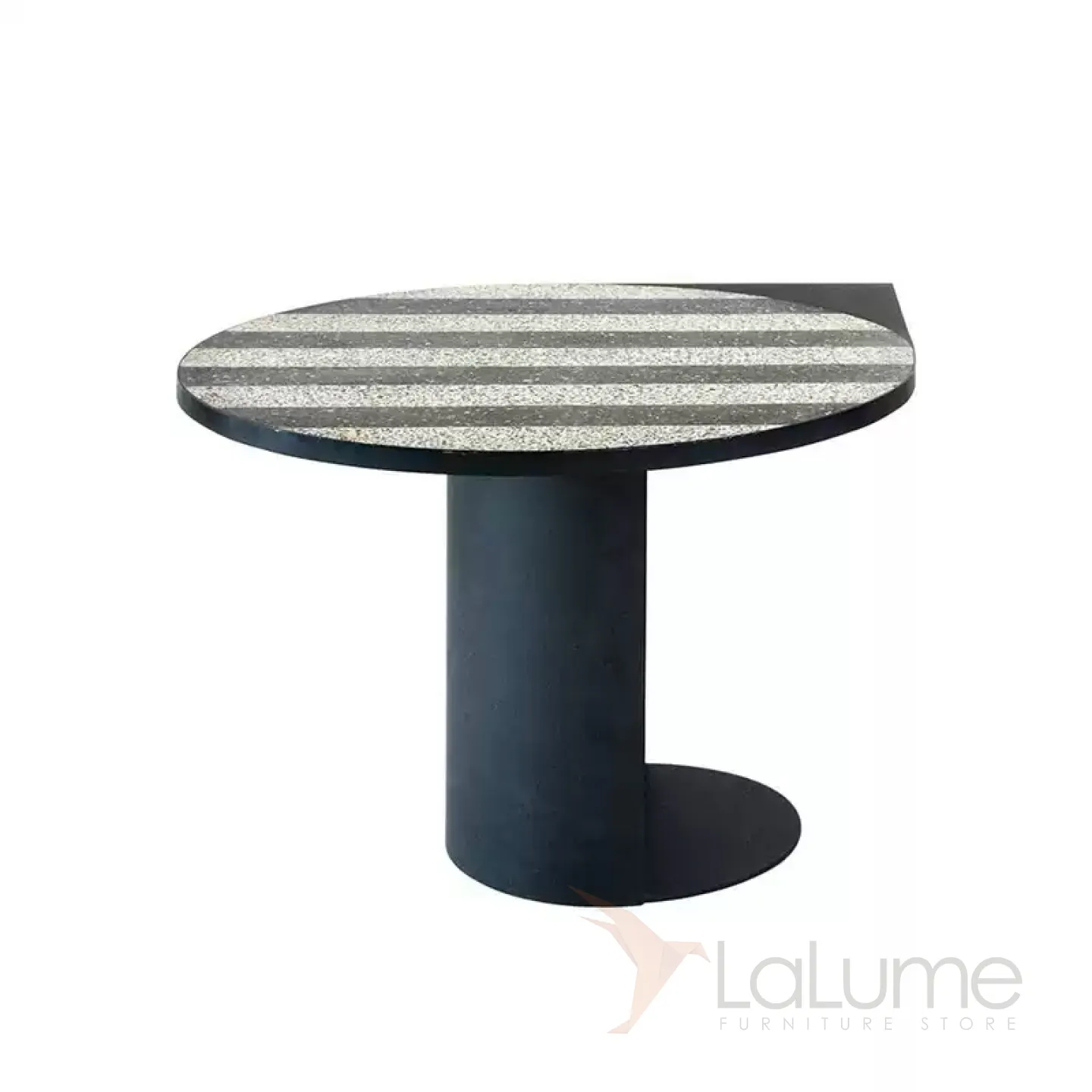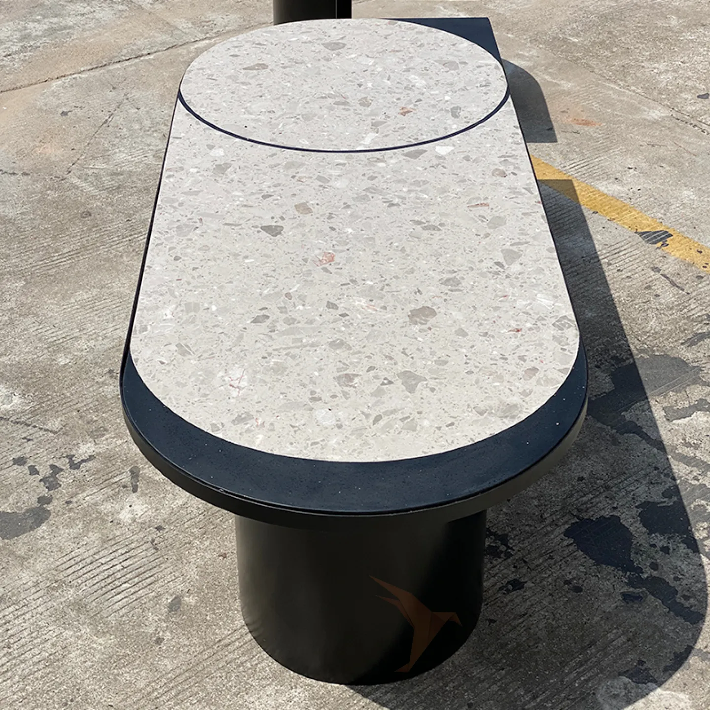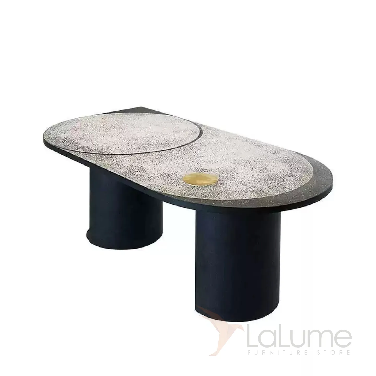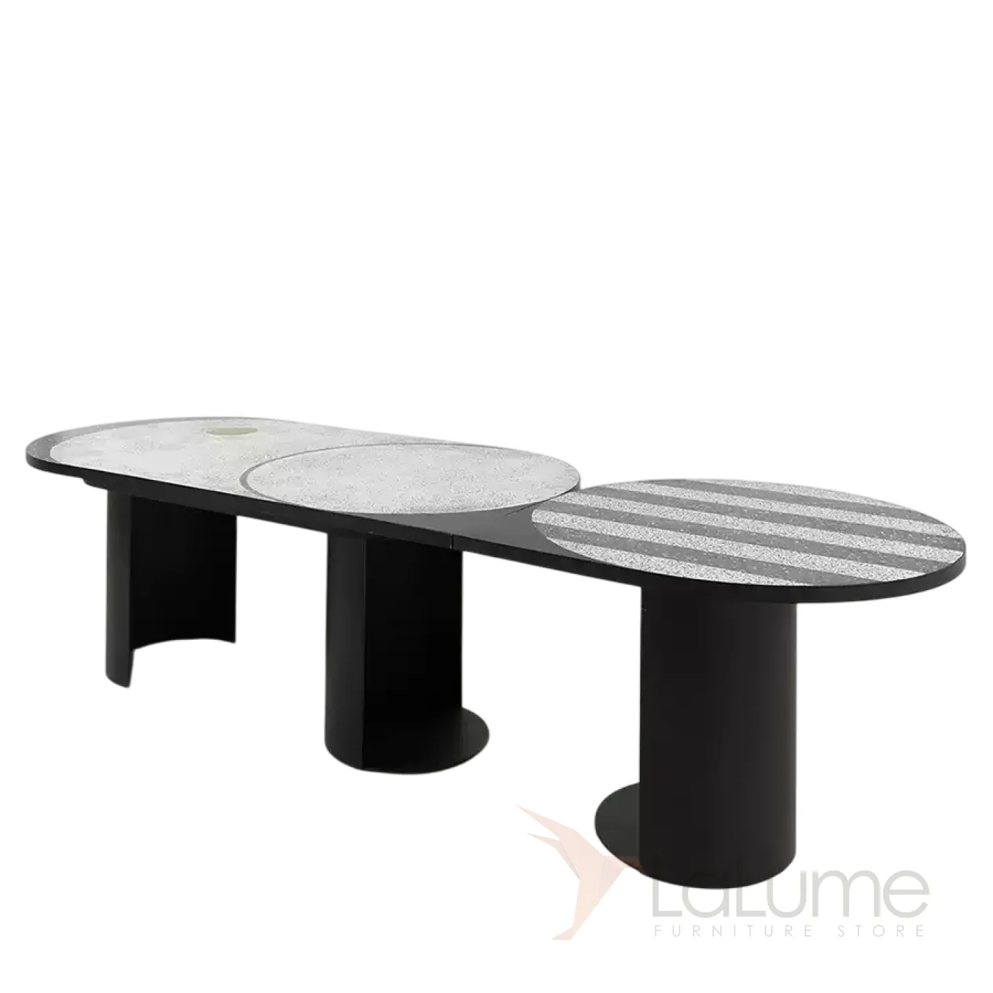 Этот стол привлекает внимание благодаря своему исполнению в духе старинного искусства терраццо. Его корни уходят в античность, когда мастера создавали мозаики из контрастных камней. Столешница из мрамора опирается на прочные металлические ножки круглой формы. Модель представлена в двух вариантах: с овальной столешницей и двумя ножками или с круглой столешницей и одной ножкой, их можно объединить в один стол.