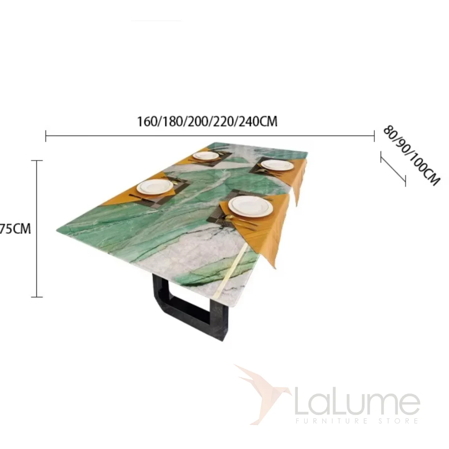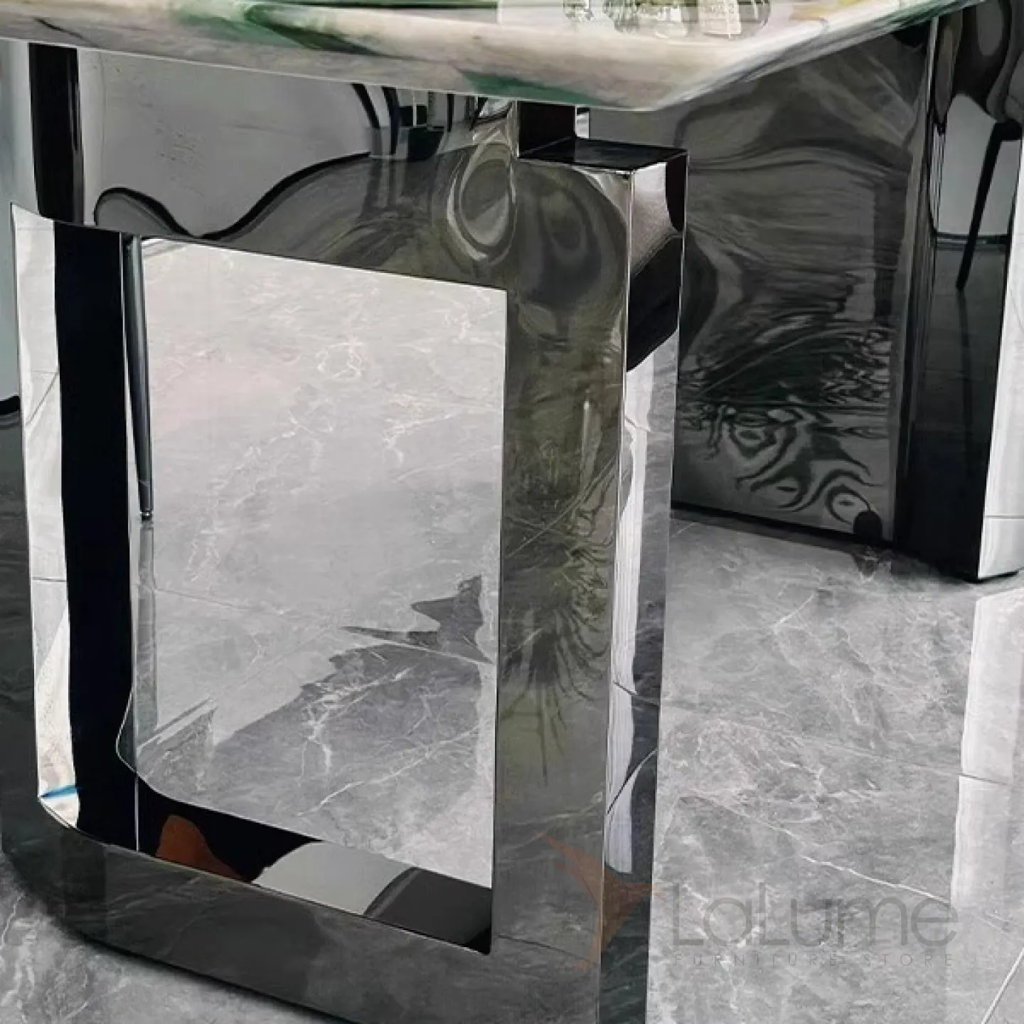 Стол с широкой столешницей, выполненной из зелёного мрамора. Благодаря прочным металлическим опорам из нержавеющей стали, стол выглядит надёжно и стильно.