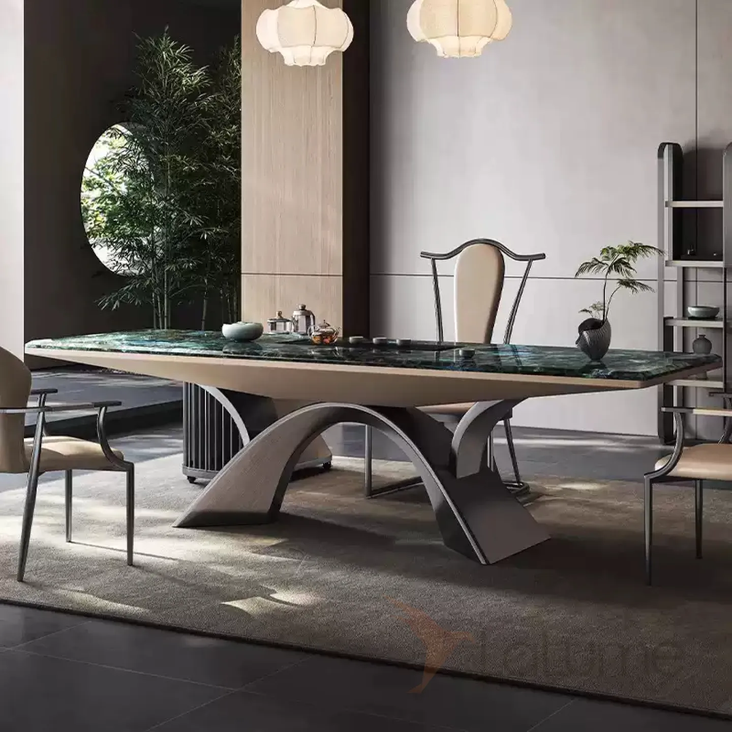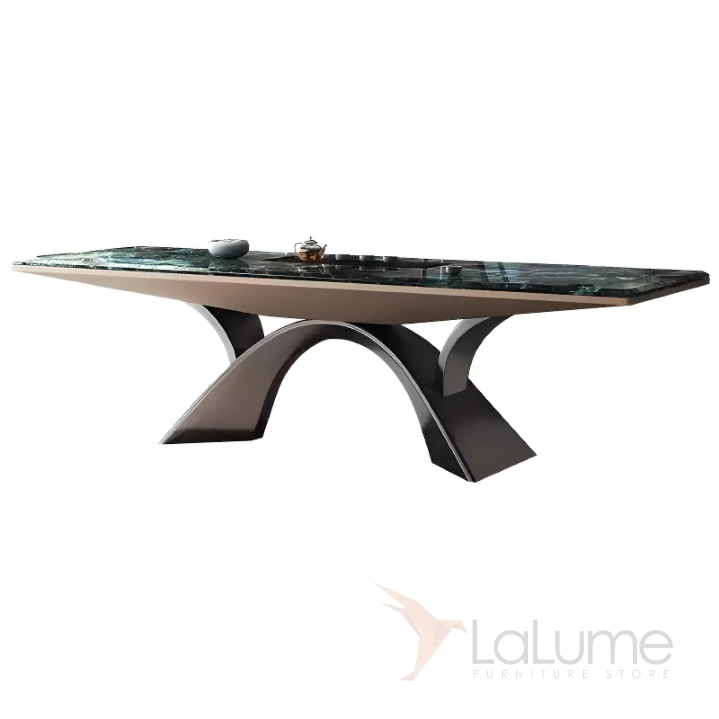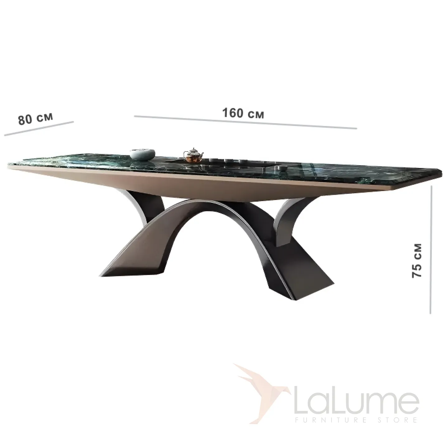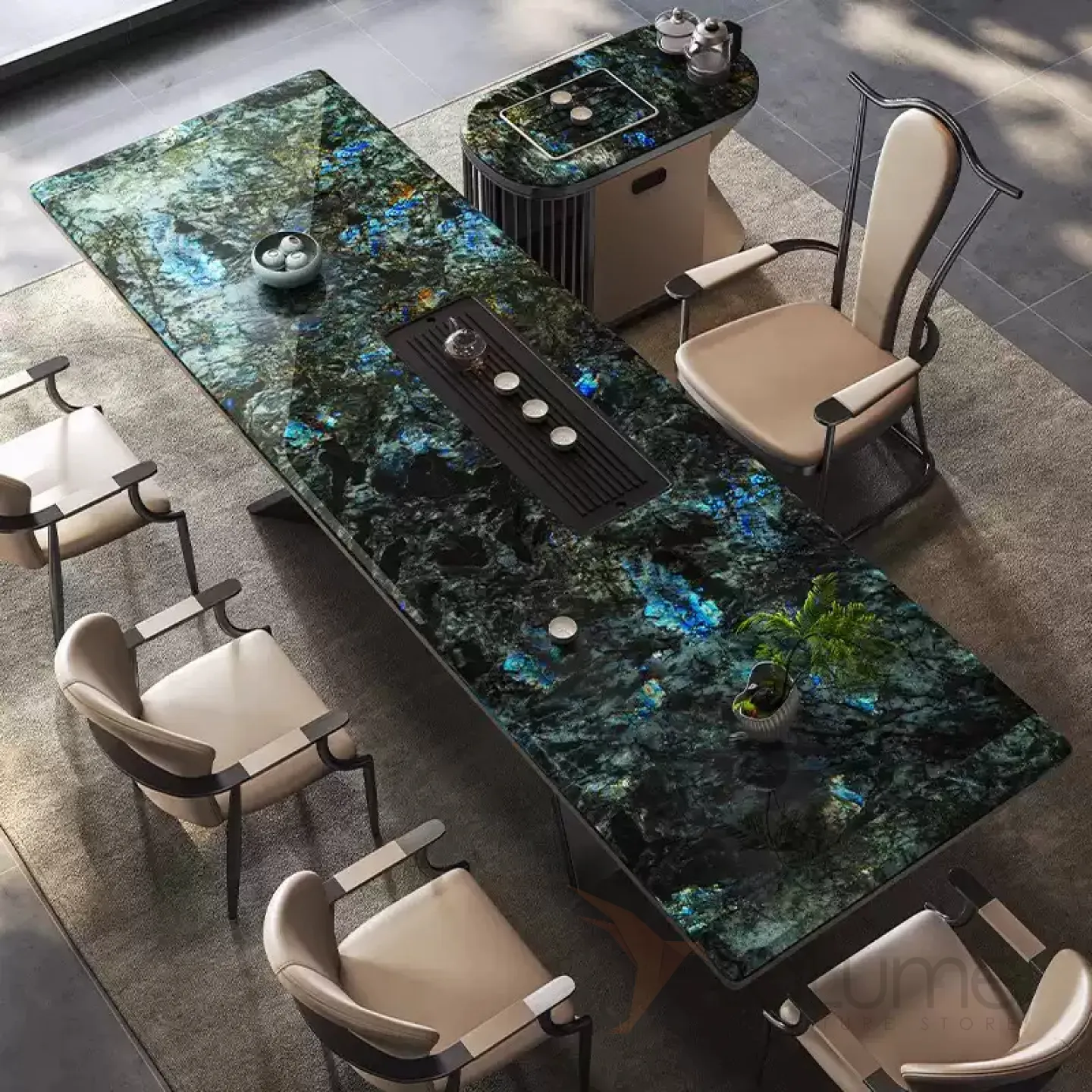 Стол с широкой столешницей из синего и серого мрамора. В столешнице предусмотрены вставка для подогрева чайника и чашек. Прочные металлические опоры из нержавеющей стали придают столу надежность и современный стиль.