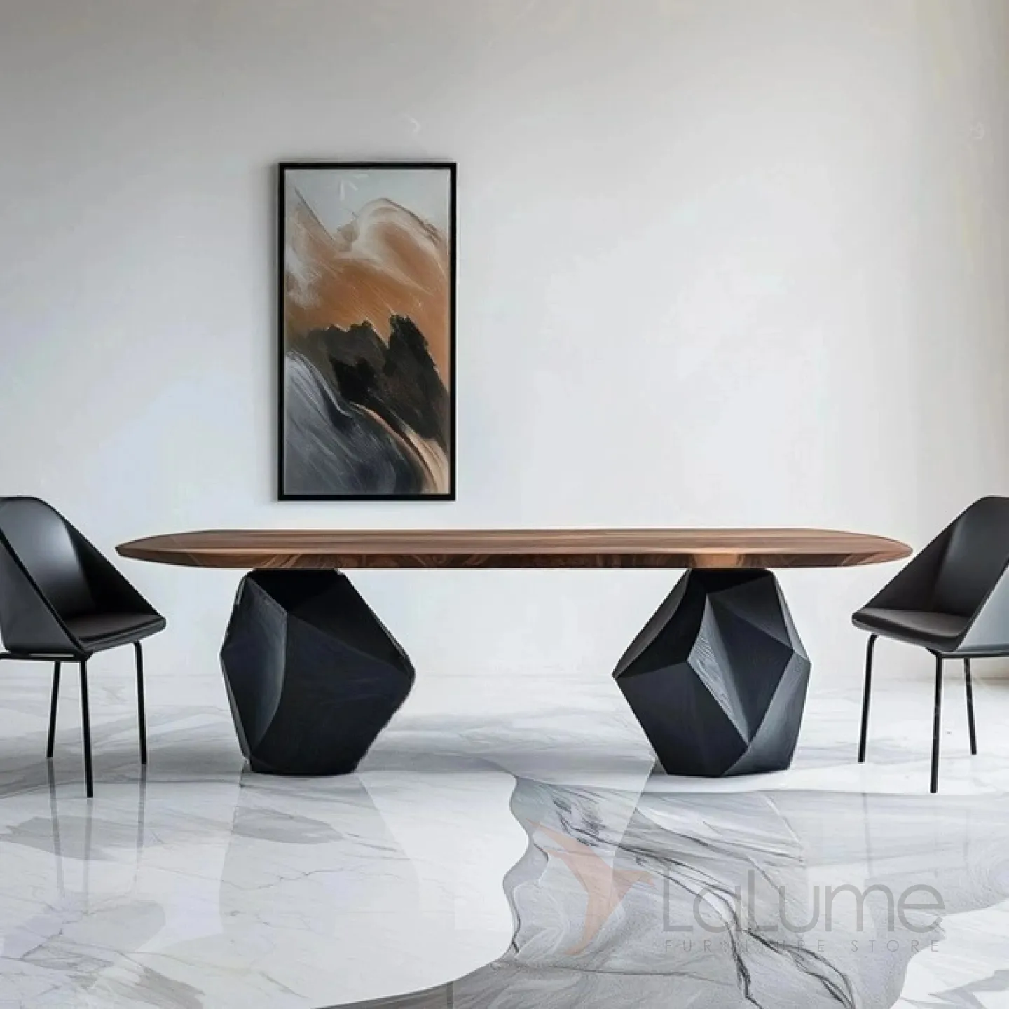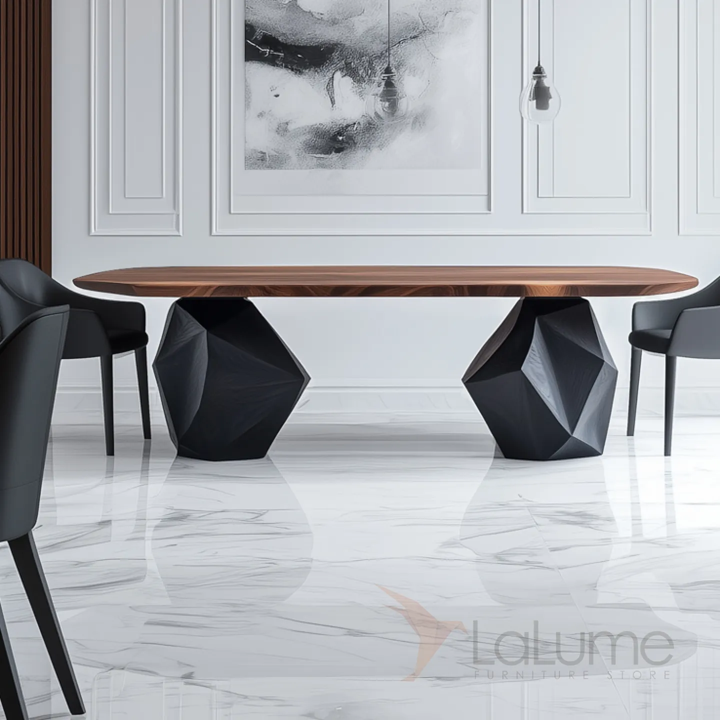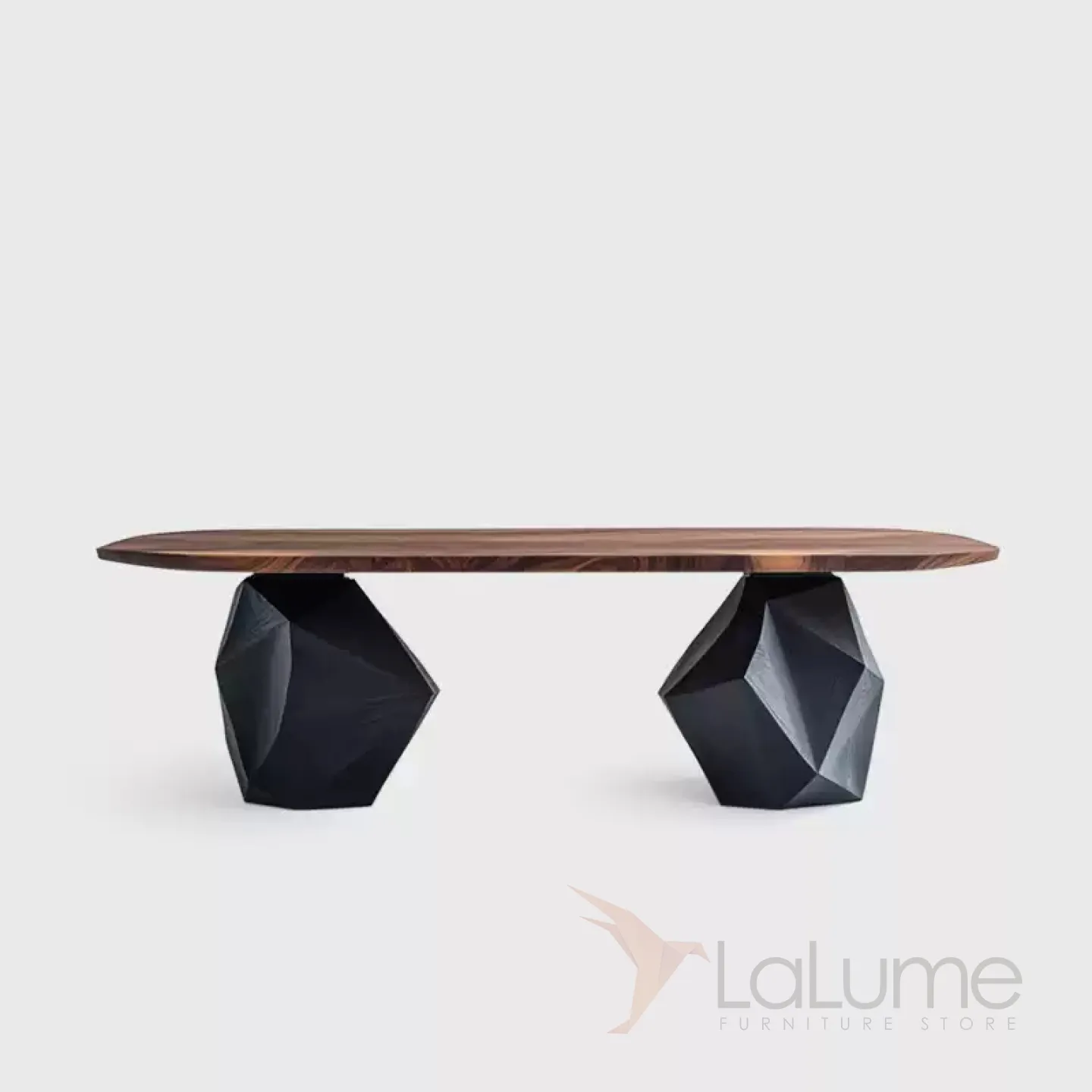 Обеденный стол изготовлен из ценной древесины грецкого ореха. Его основание, имеющее необычную форму, выполнено из павловнии. За этим столом с комфортом могут расположиться восемь человек, и он станет изысканным элементом интерьера.