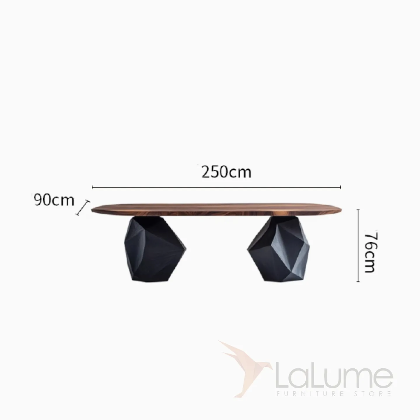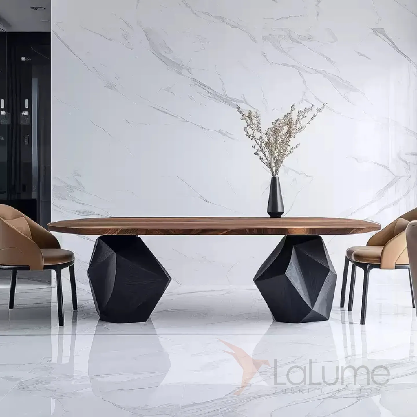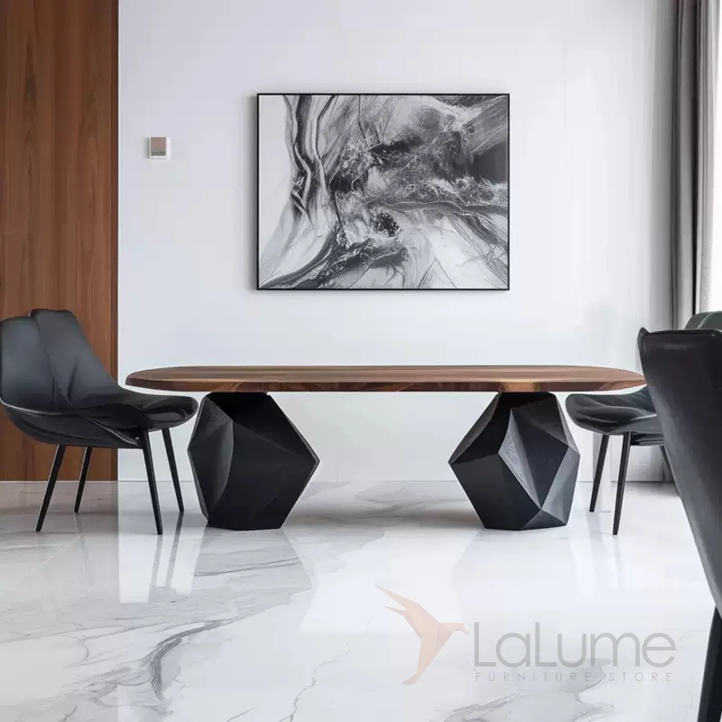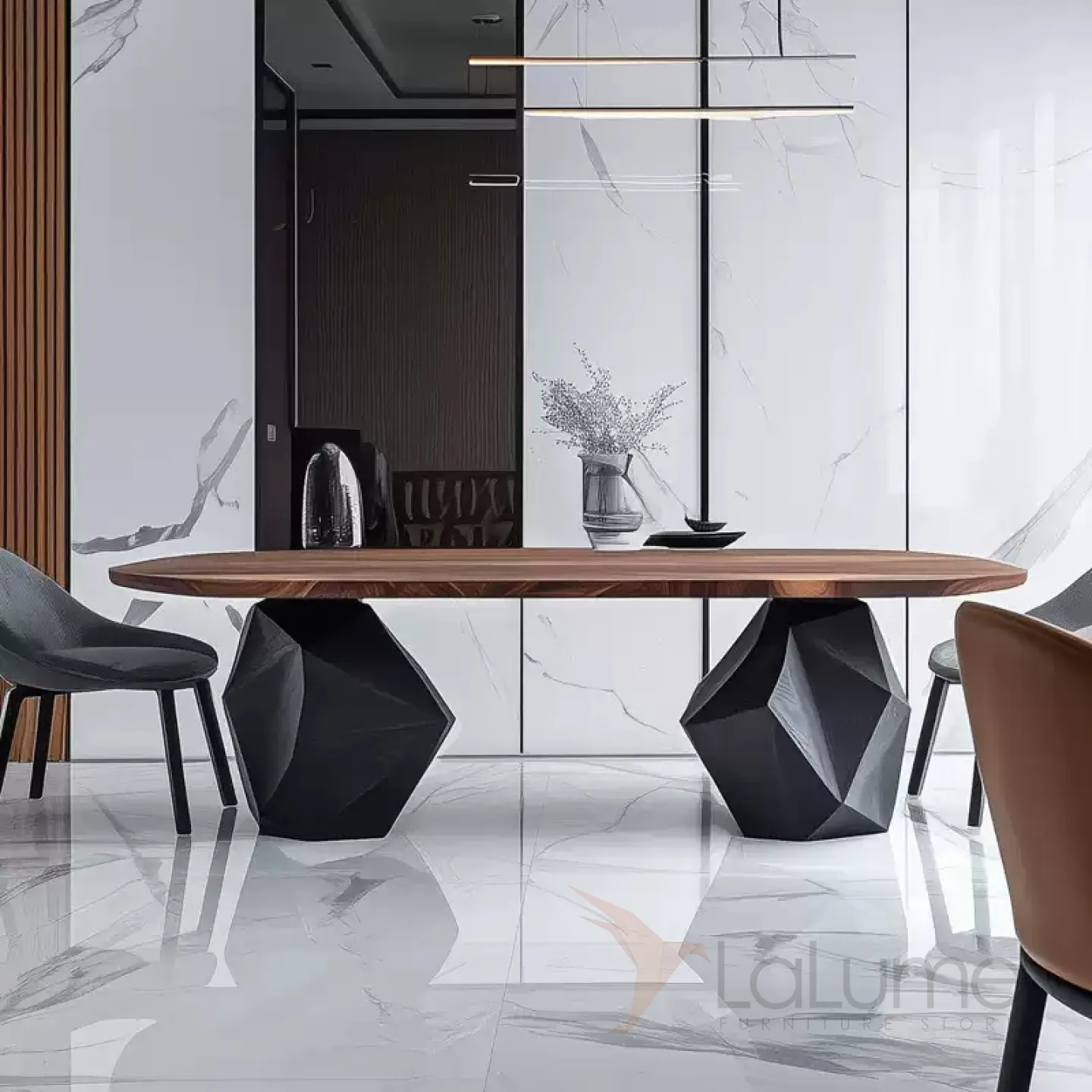 Обеденный стол изготовлен из ценной древесины грецкого ореха. Его основание, имеющее необычную форму, выполнено из павловнии. За этим столом с комфортом могут расположиться восемь человек, и он станет изысканным элементом интерьера.