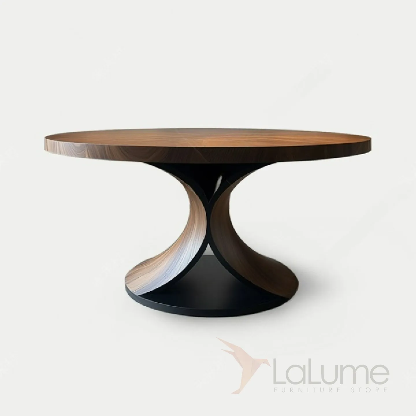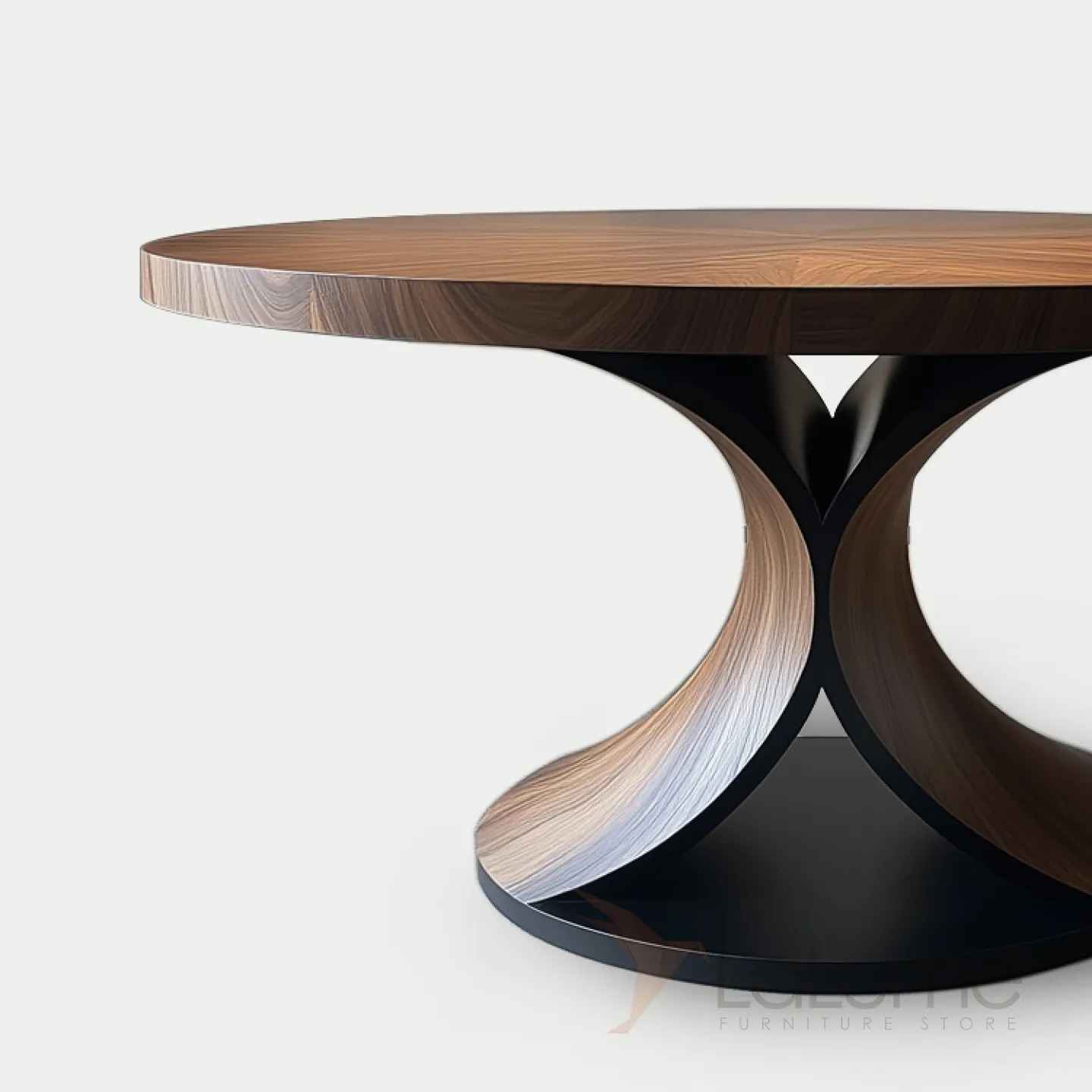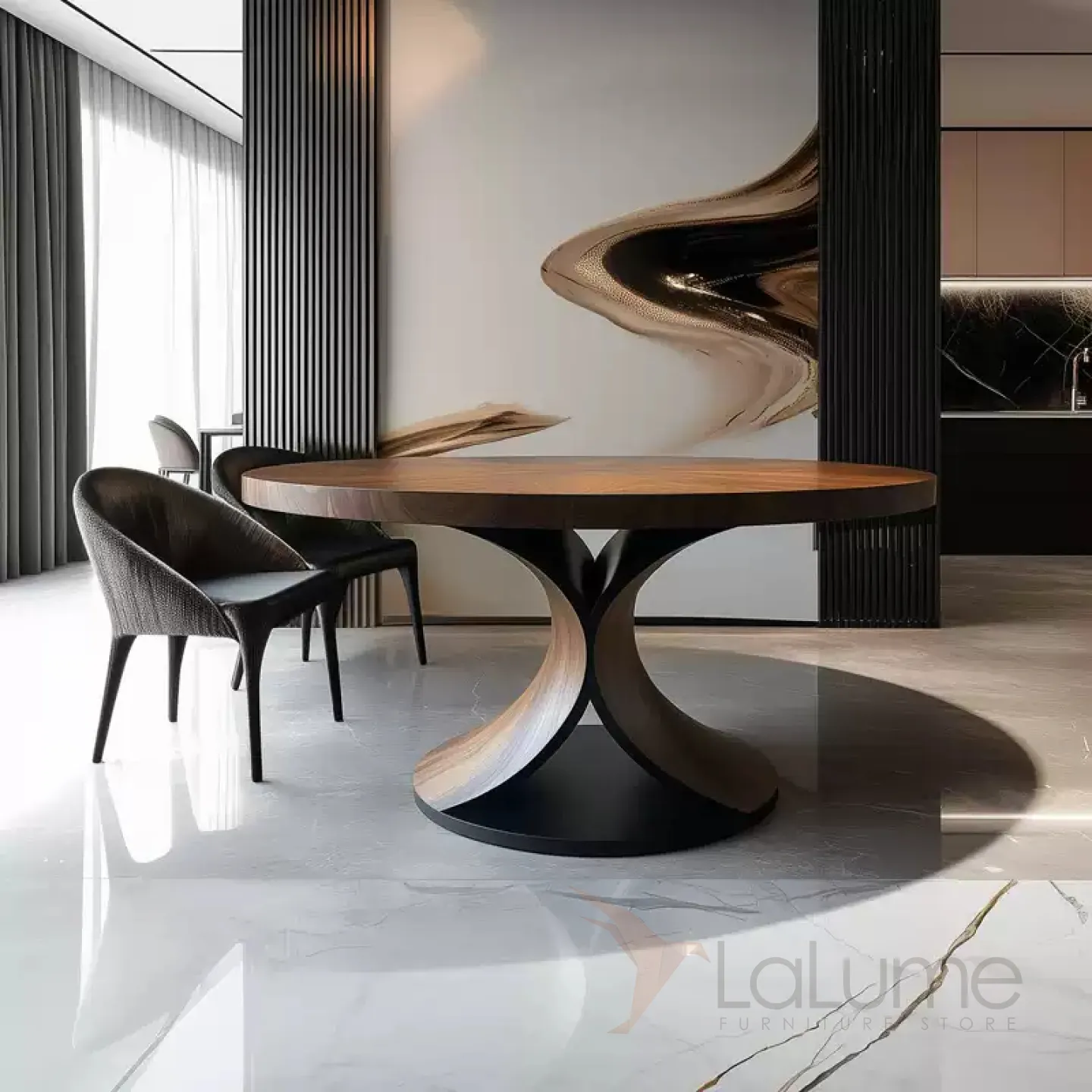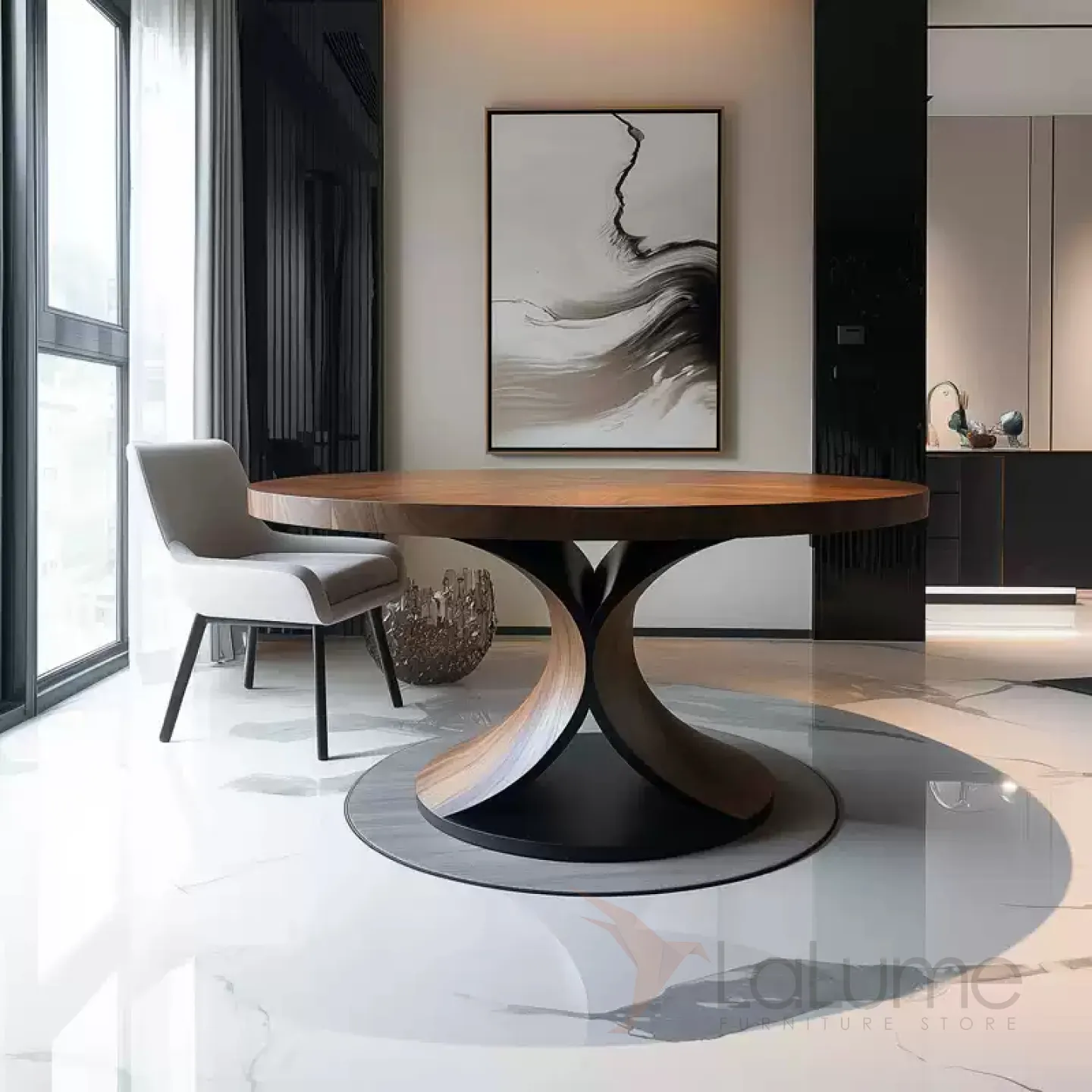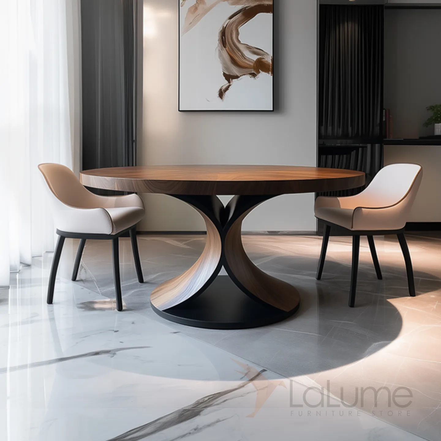 Обеденный стол изготовлен из ценной древесины грецкого ореха. Его основание, имеющее необычную форму, выполнено из тополя. За этим столом с комфортом могут расположиться шесть человек, и он станет изысканным элементом интерьера.