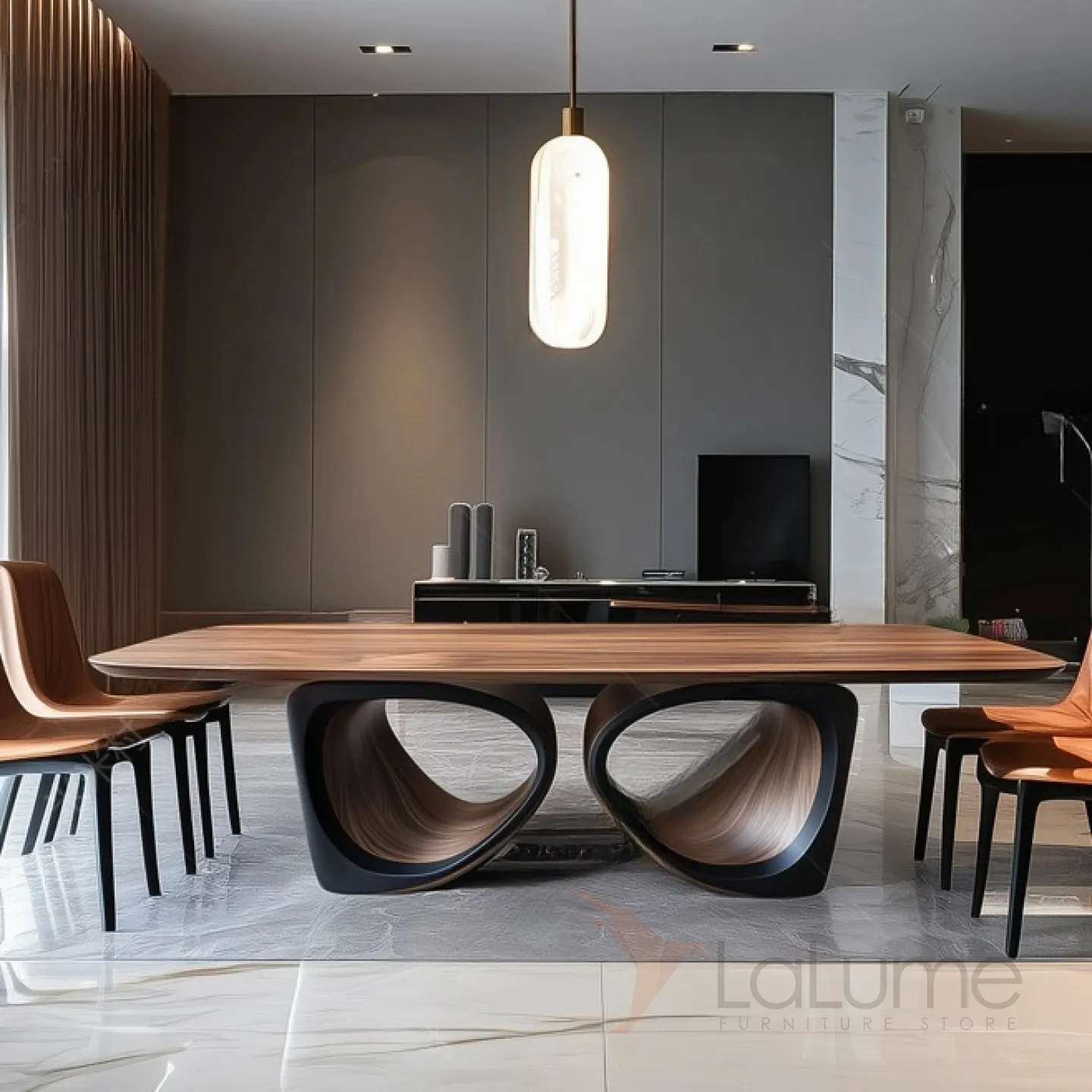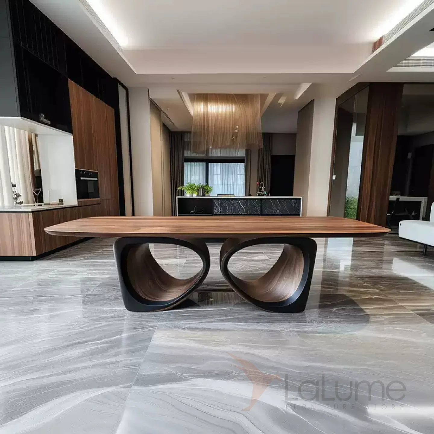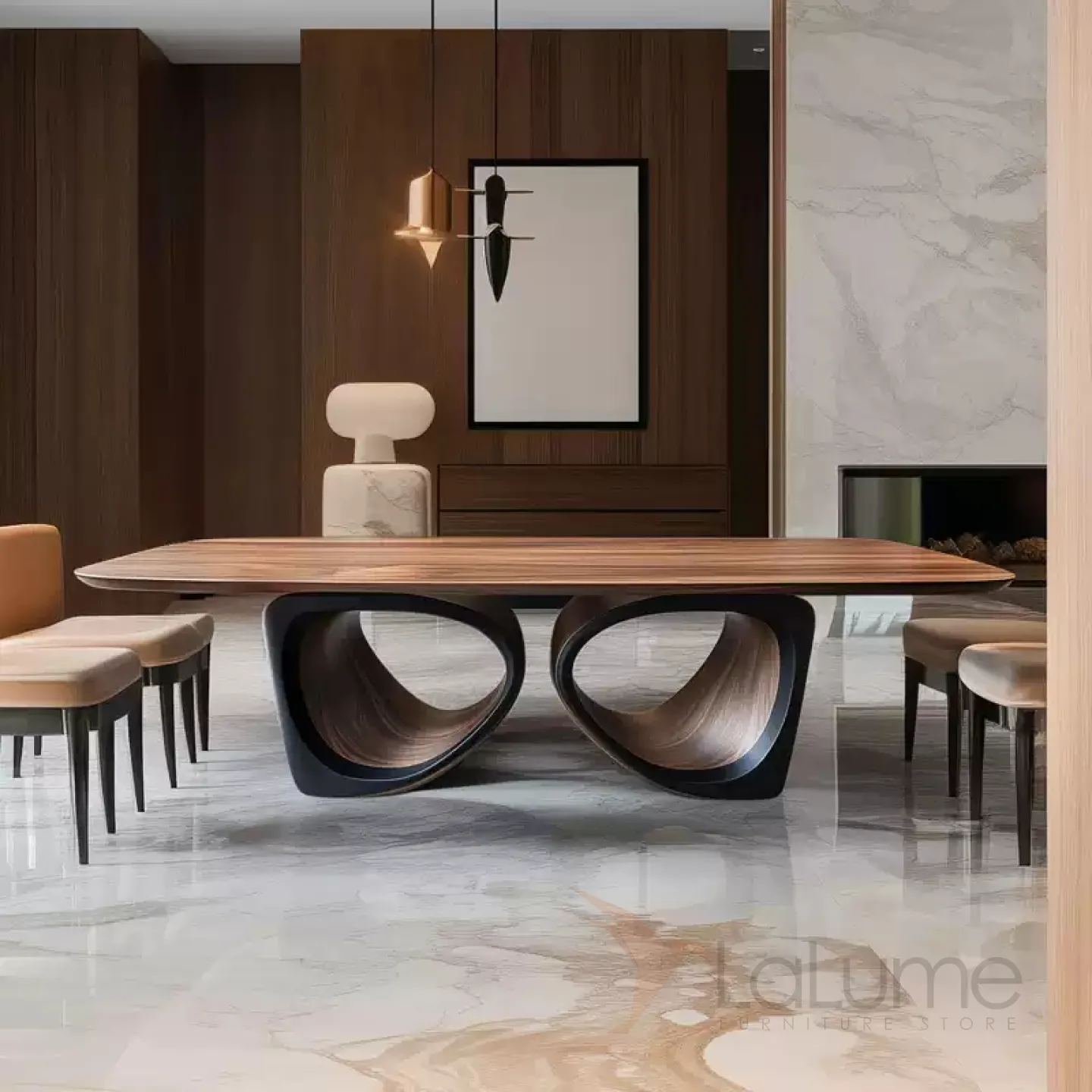 Обеденный стол изготовлен из ценной древесины грецкого ореха. Его основание, имеющее необычную форму, выполнено из павловнии. За этим столом с комфортом могут расположиться восемь человек, и он станет изысканным элементом интерьера.