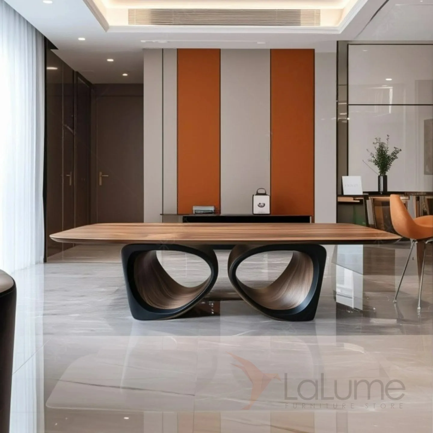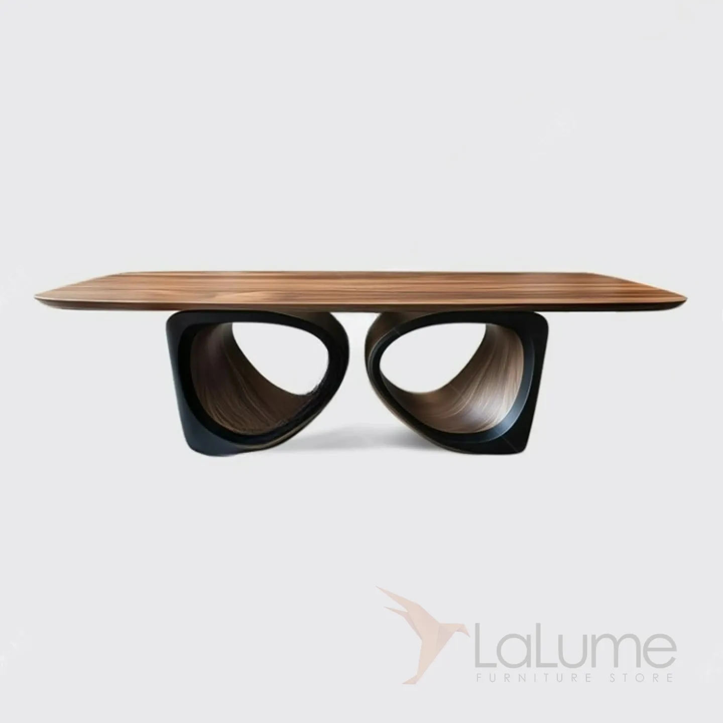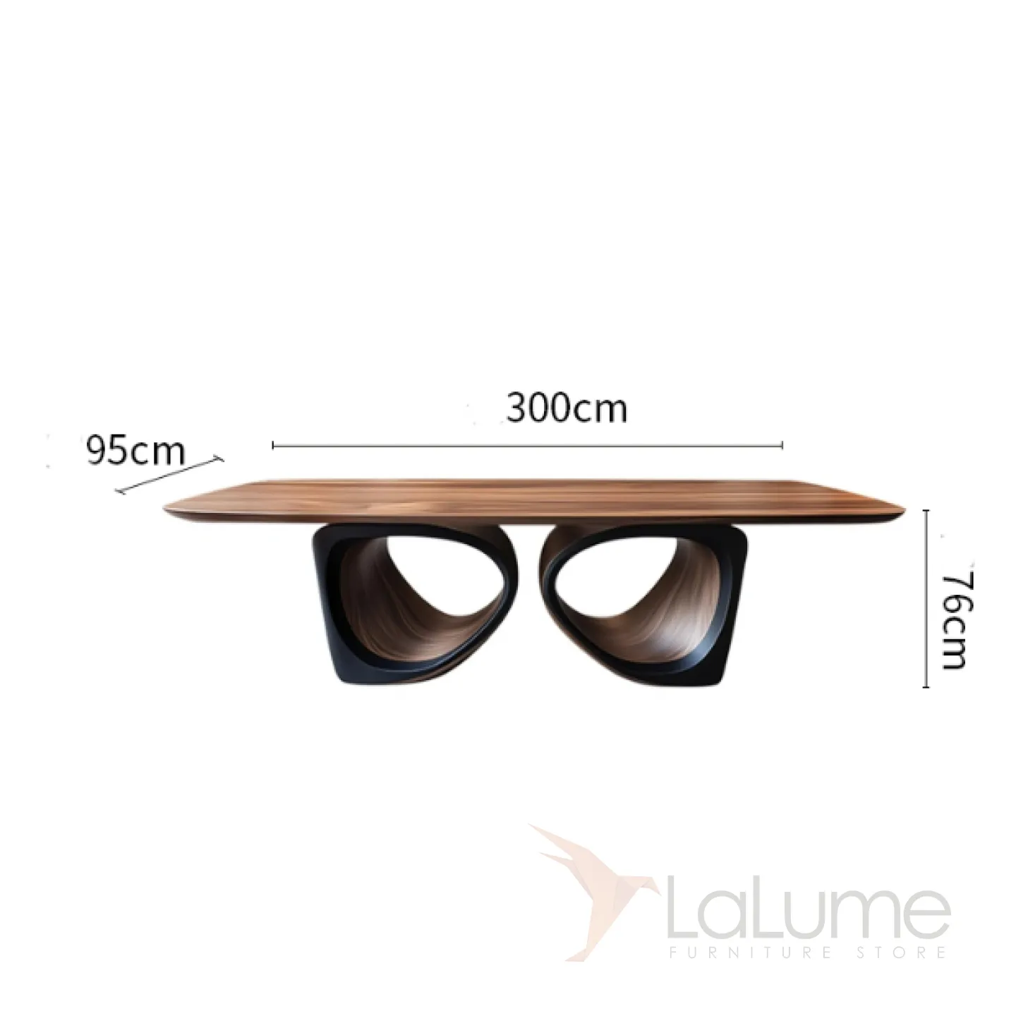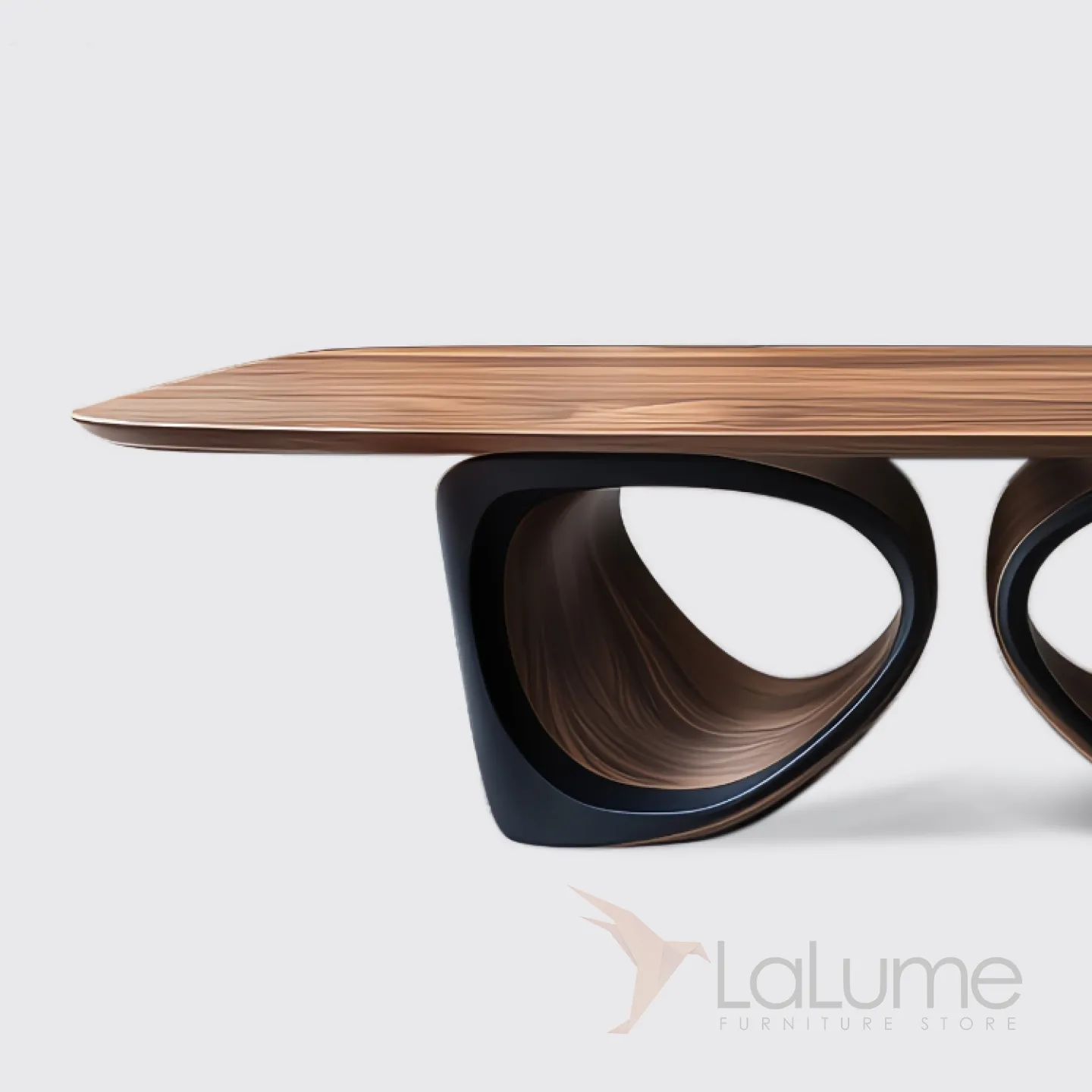 Обеденный стол изготовлен из ценной древесины грецкого ореха. Его основание, имеющее необычную форму, выполнено из павловнии. За этим столом с комфортом могут расположиться восемь человек, и он станет изысканным элементом интерьера.