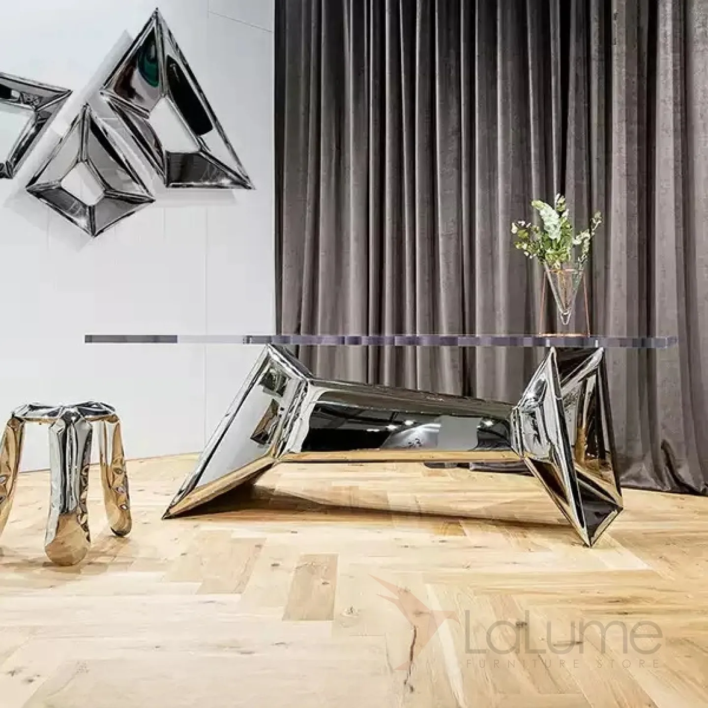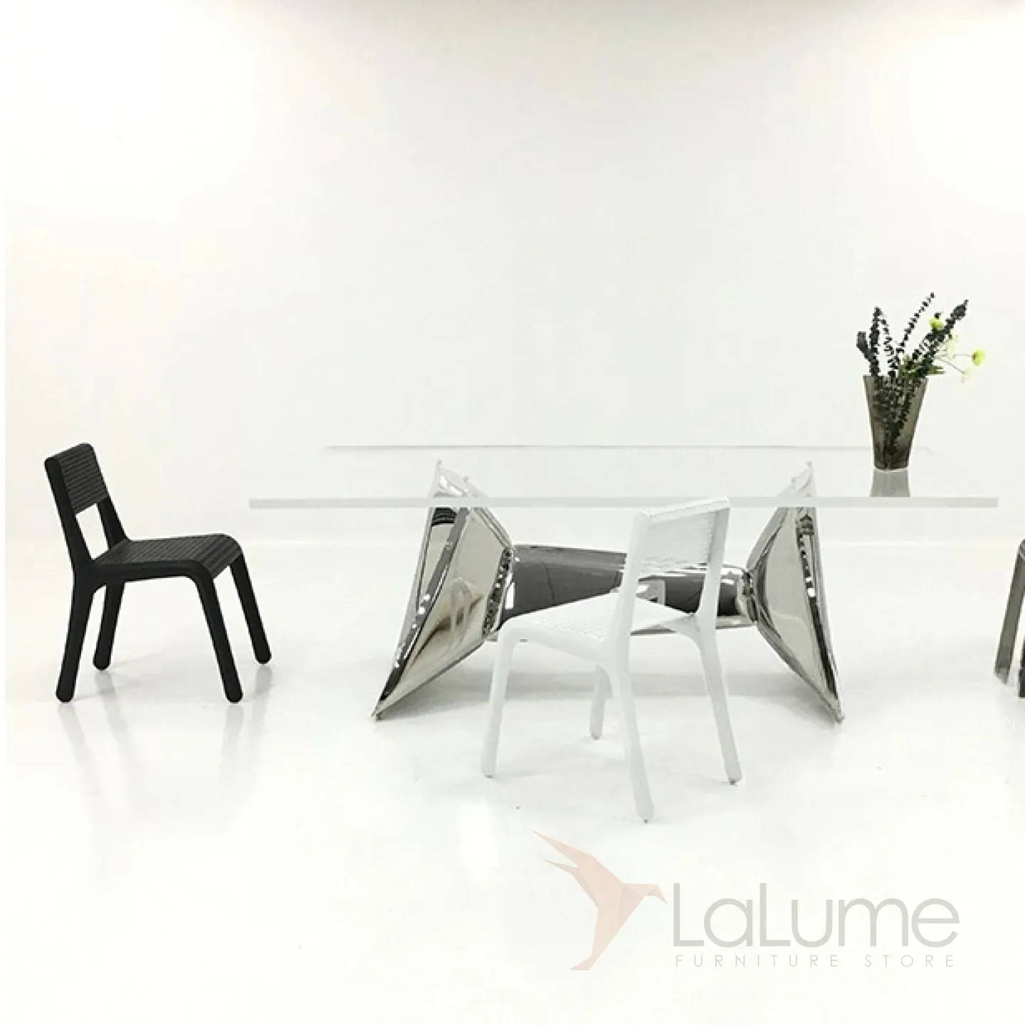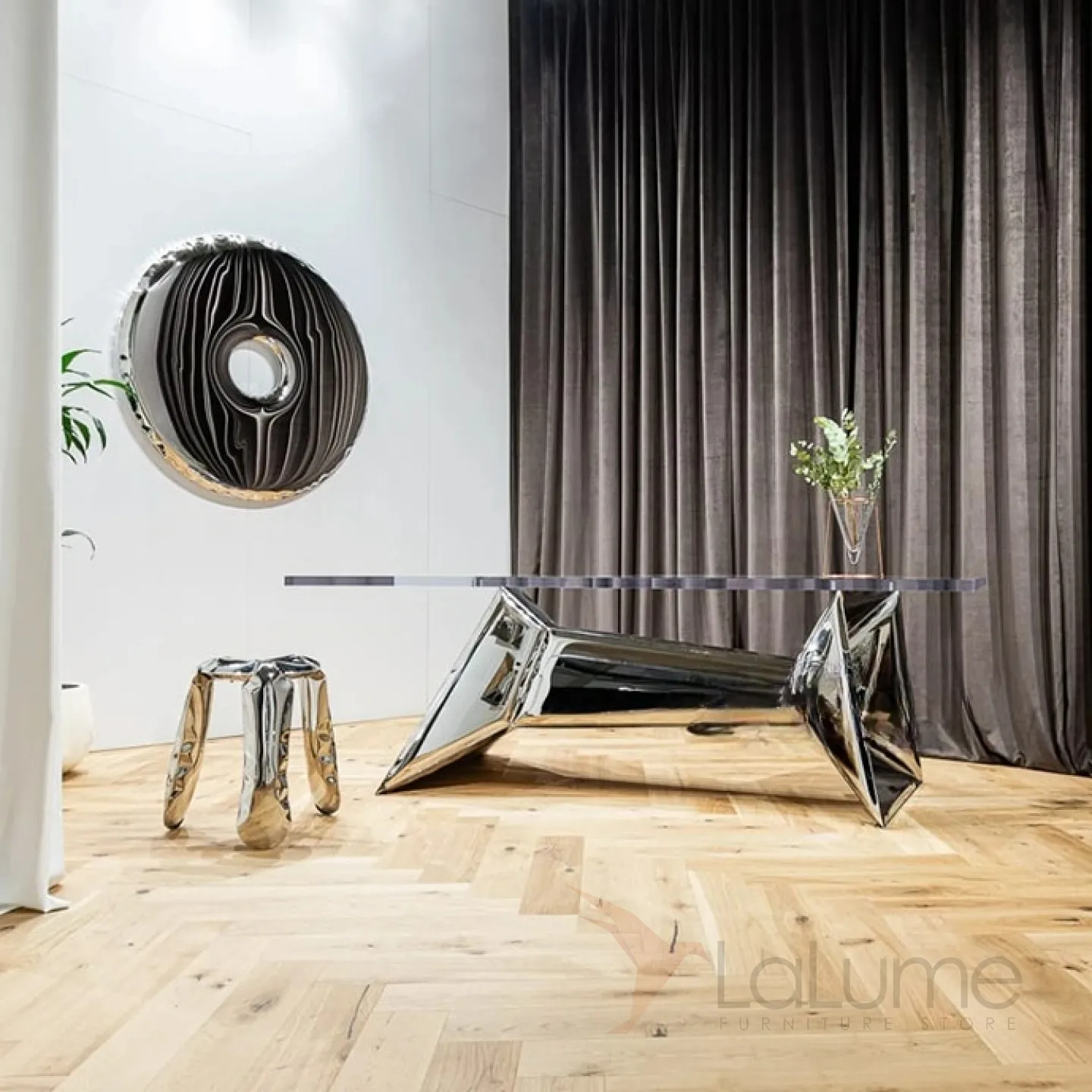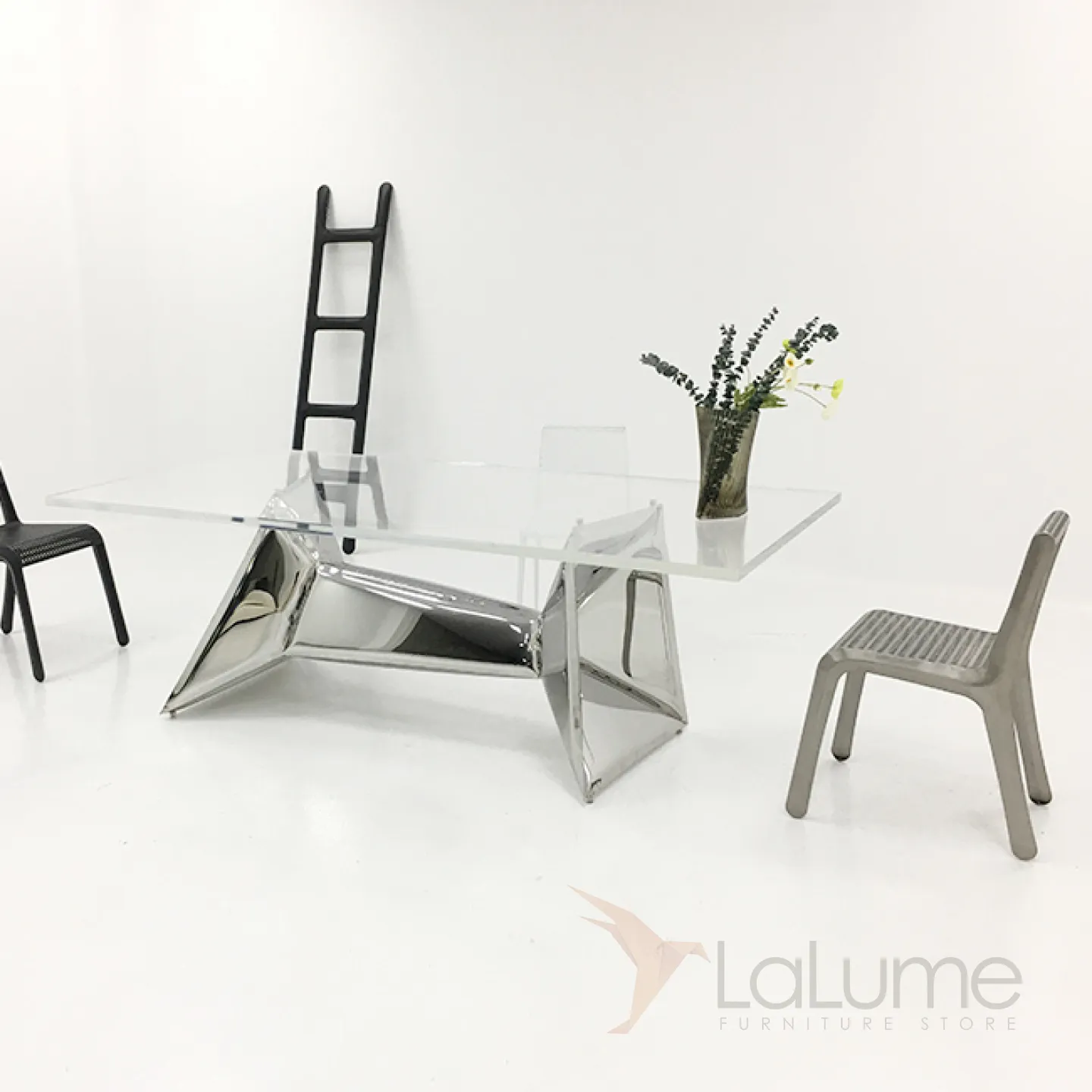 Обеденный стол с оригинальным по форме подстольем из нержавеющей стали. В качестве столешницы используется прочный прозрачный акрил, либо травертин, в зависимости от выбранной модели.