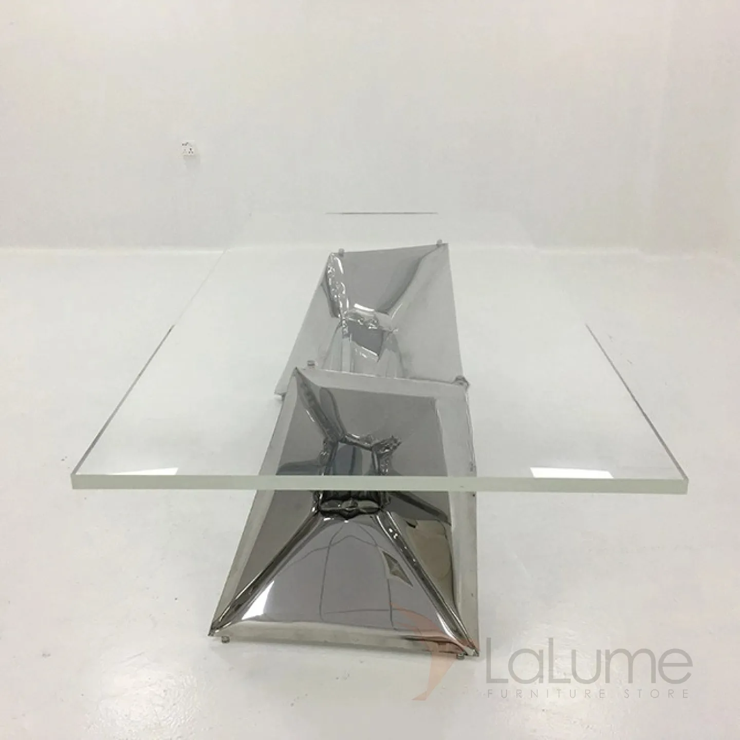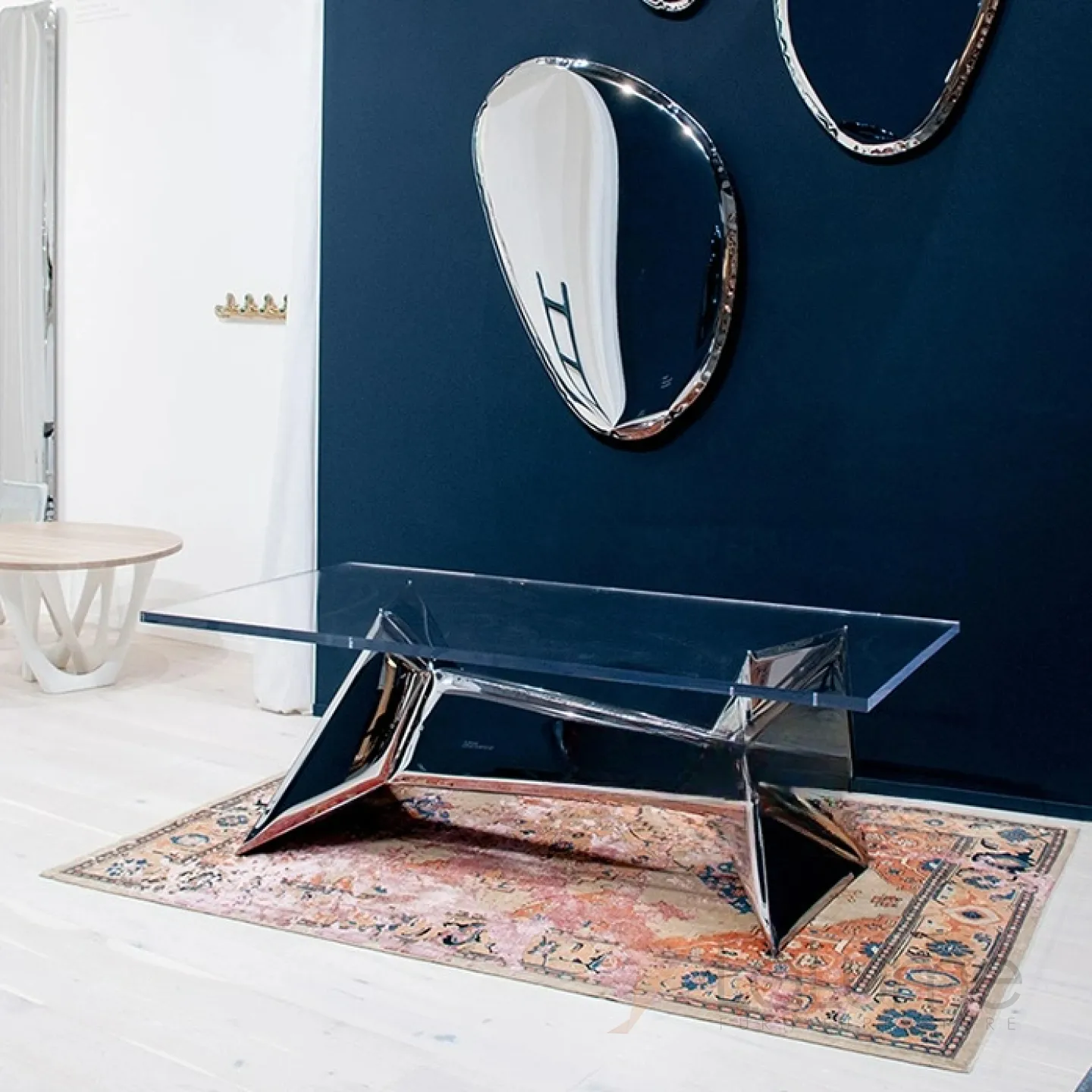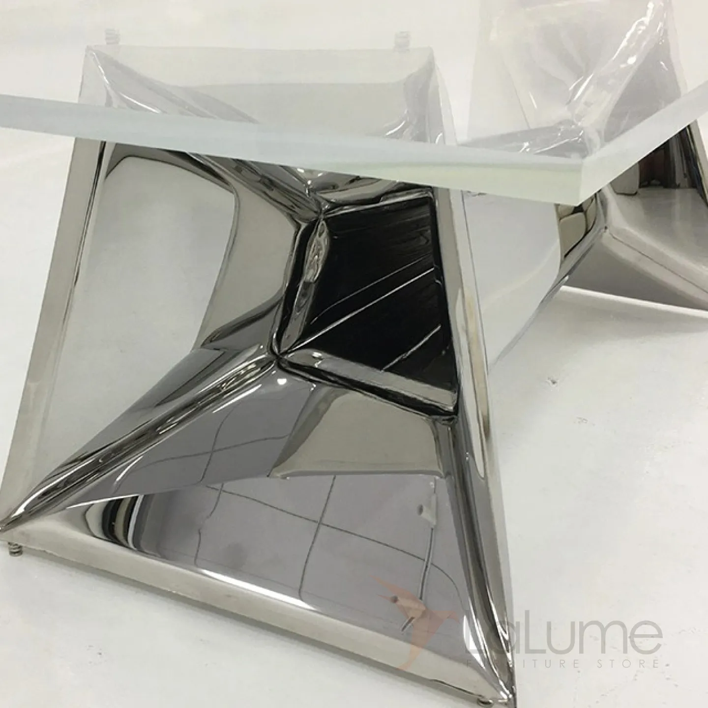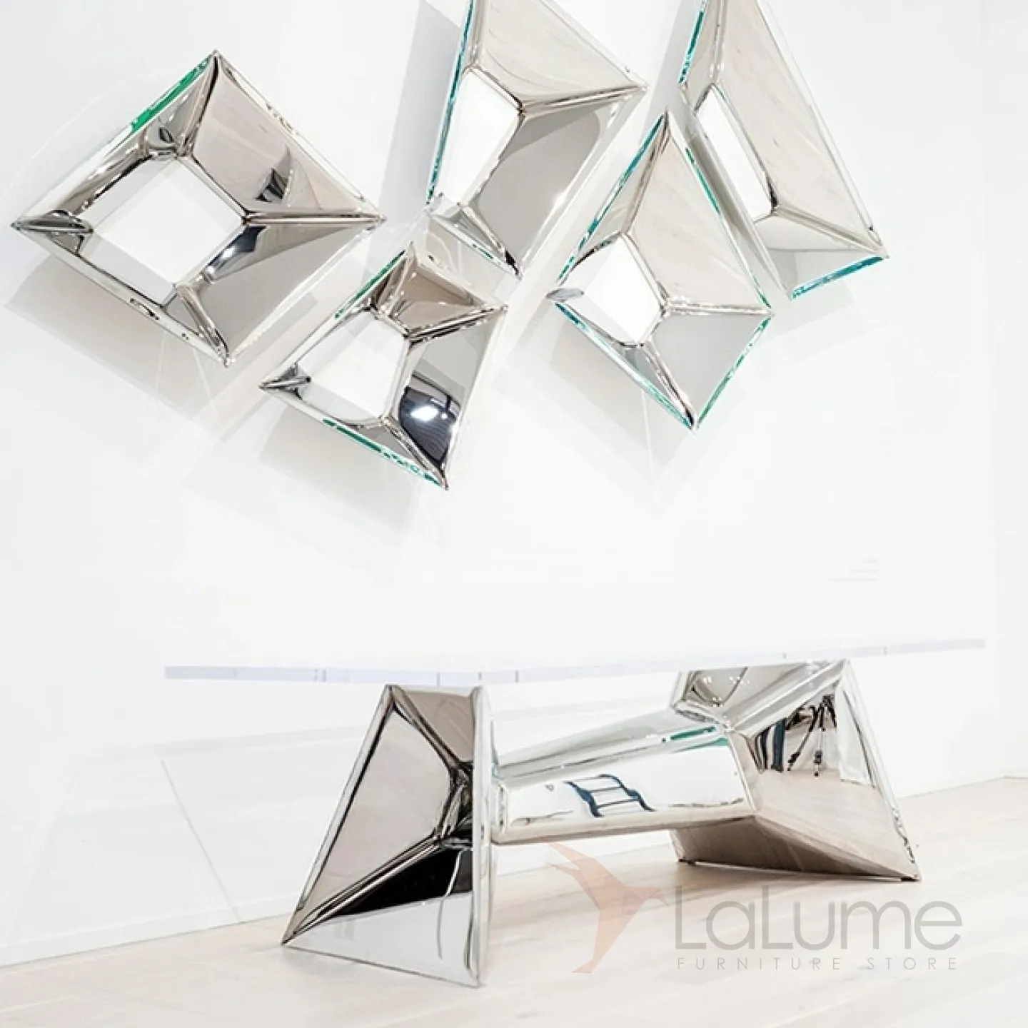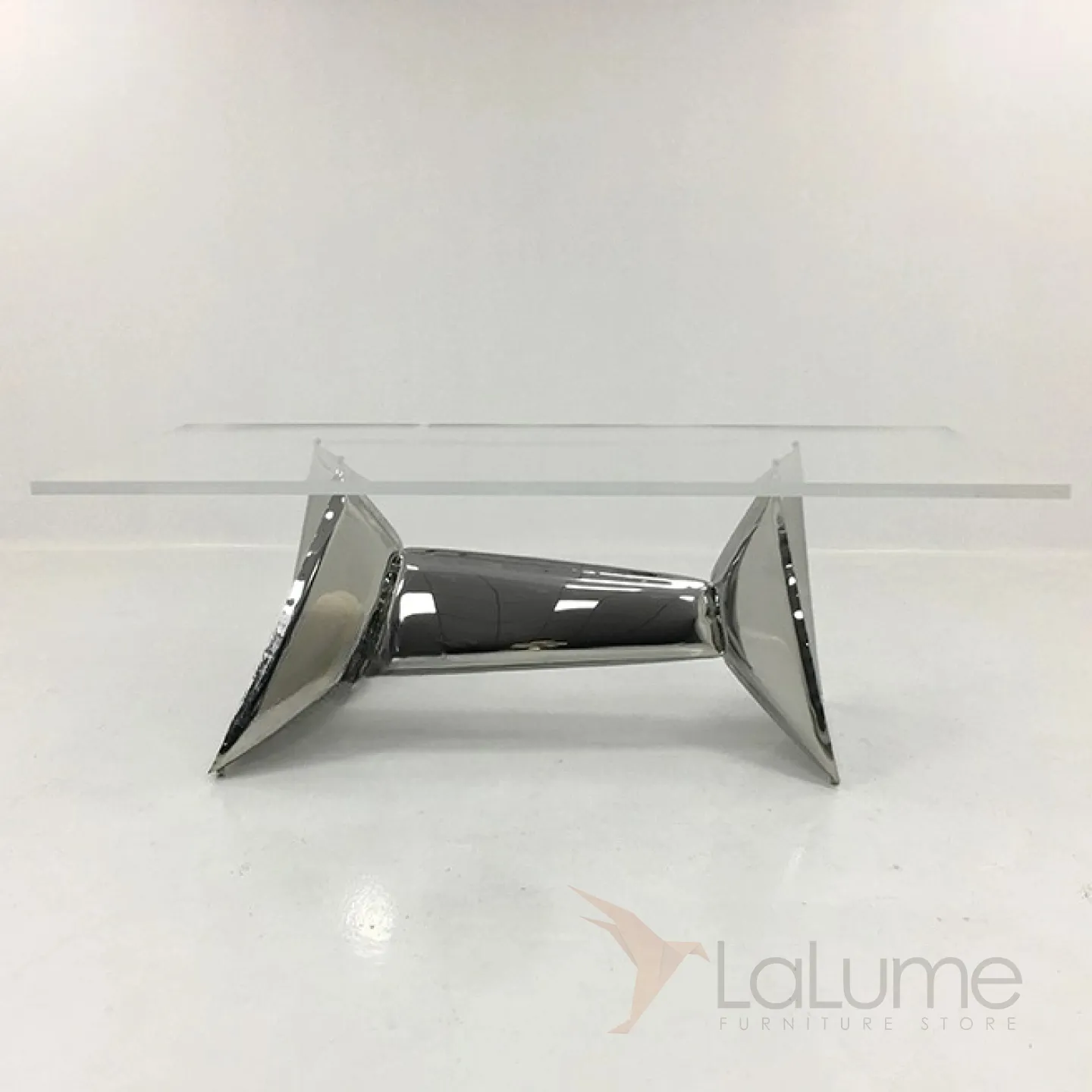 Обеденный стол с оригинальным по форме подстольем из нержавеющей стали. В качестве столешницы используется прочный прозрачный акрил, либо травертин, в зависимости от выбранной модели.
