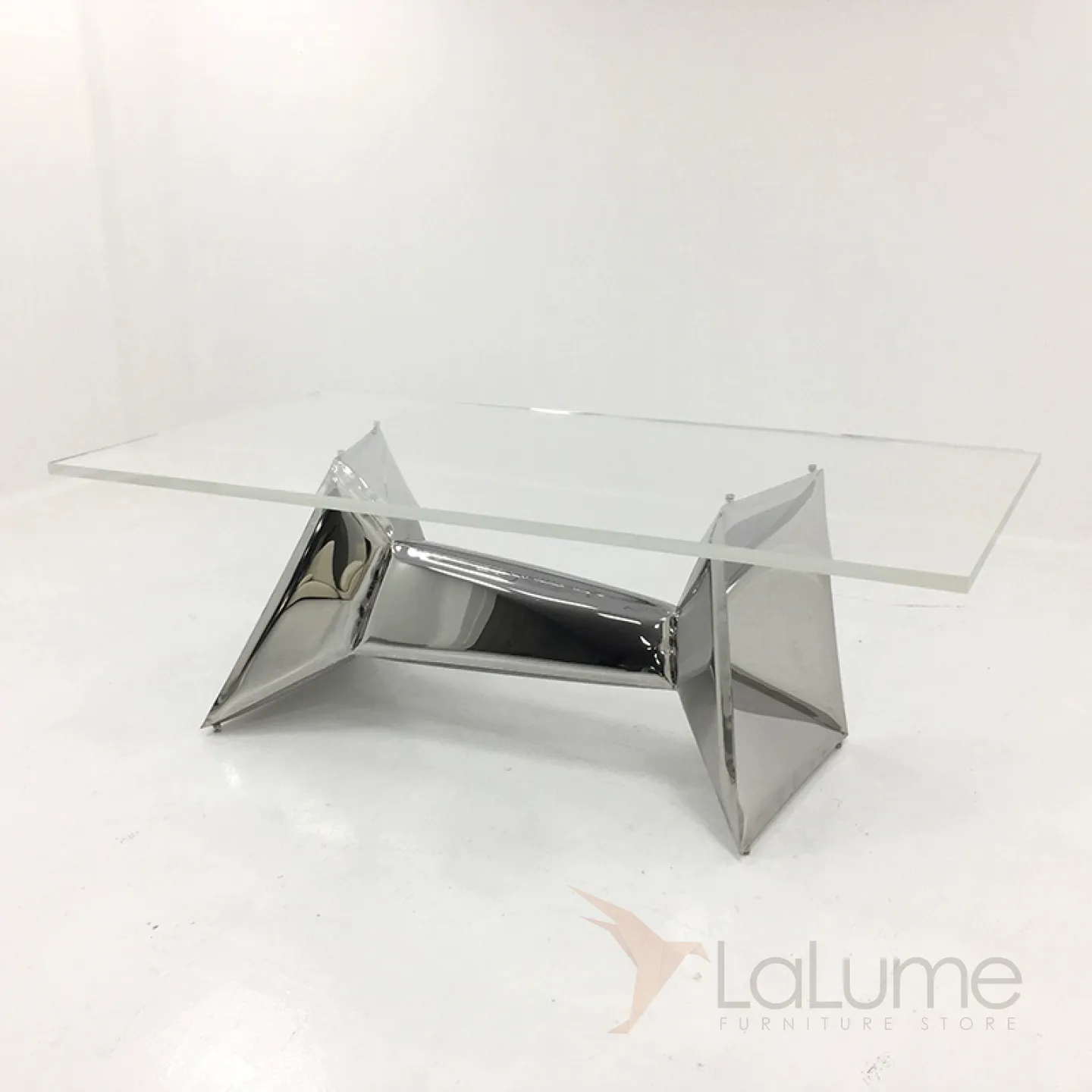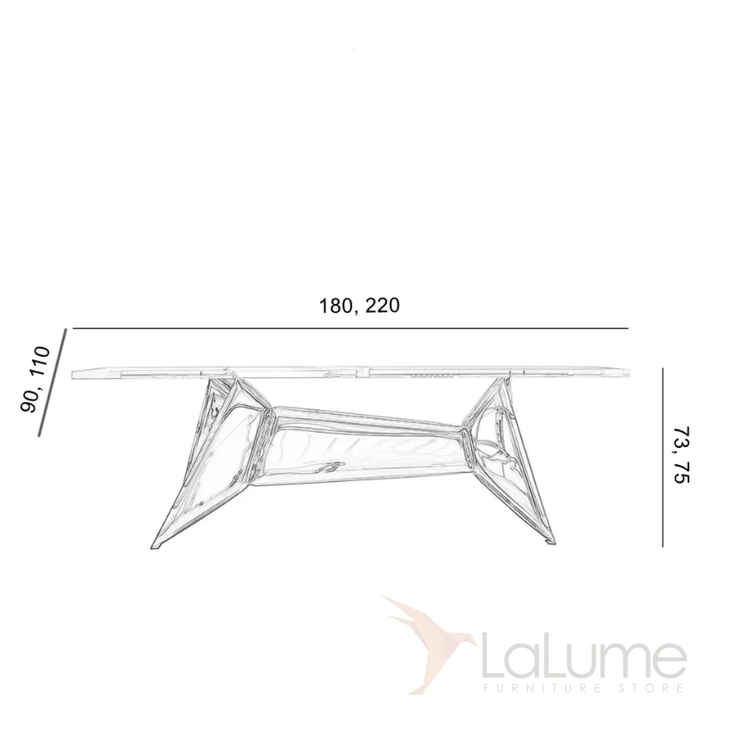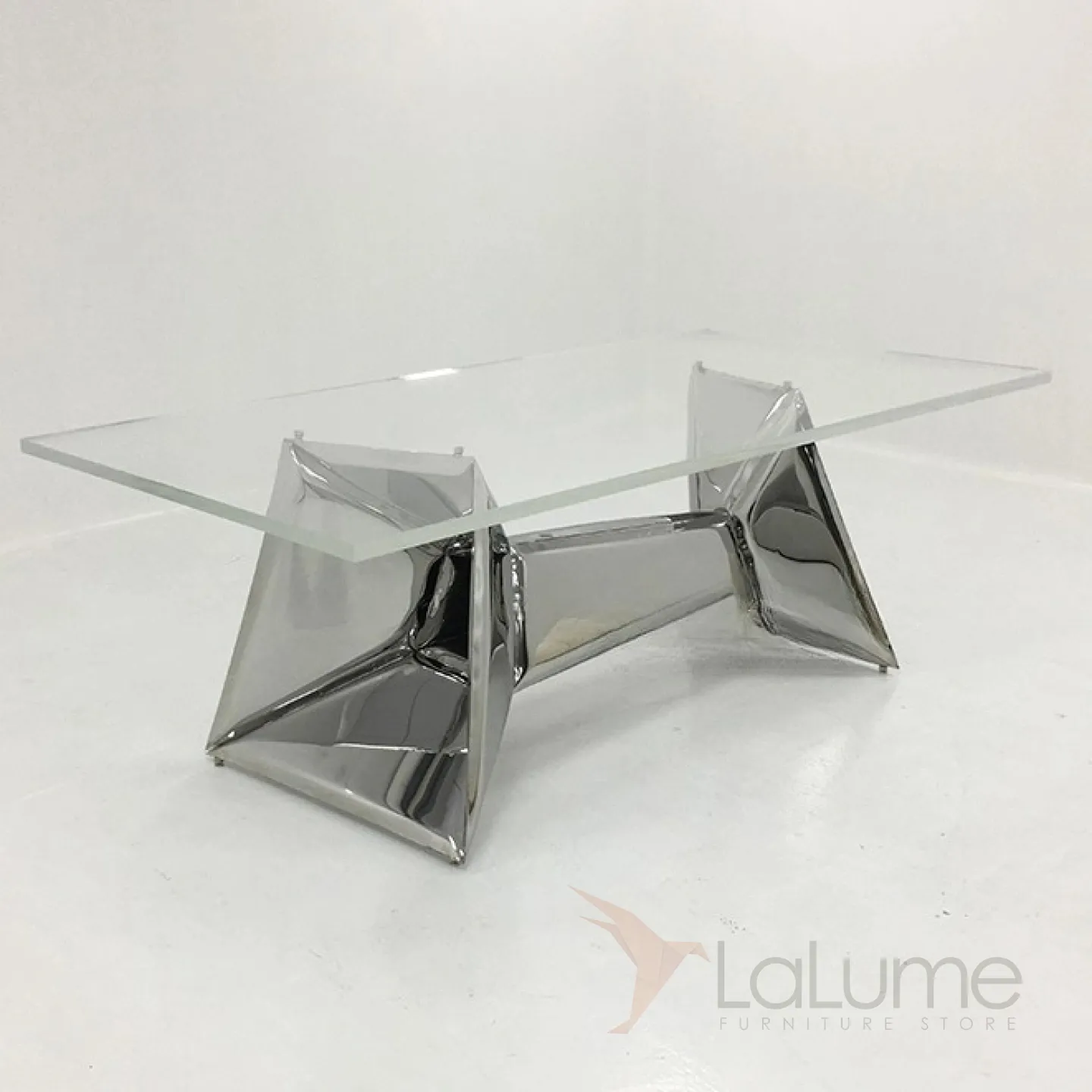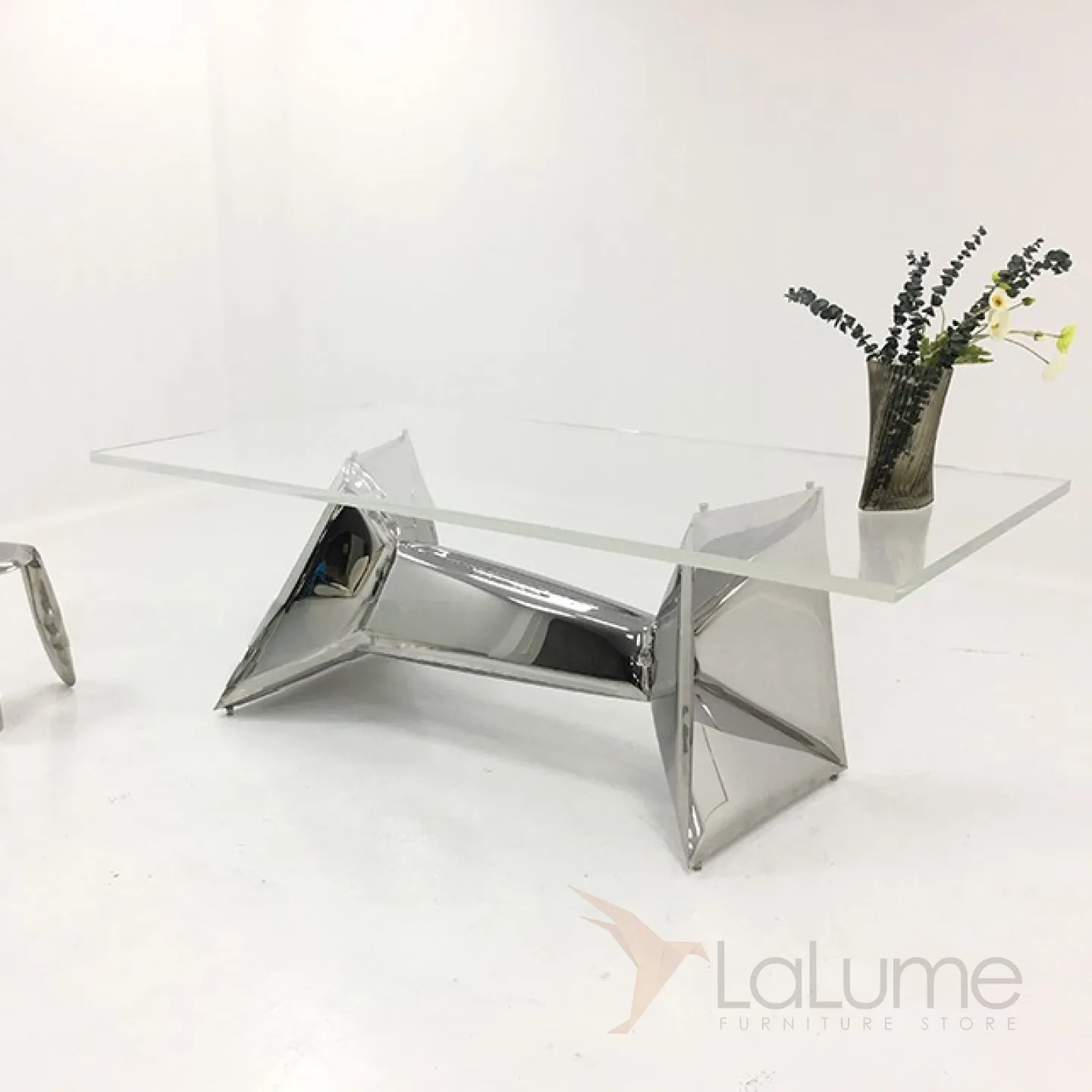 Обеденный стол с оригинальным по форме подстольем из нержавеющей стали. В качестве столешницы используется прочный прозрачный акрил, либо травертин, в зависимости от выбранной модели.
