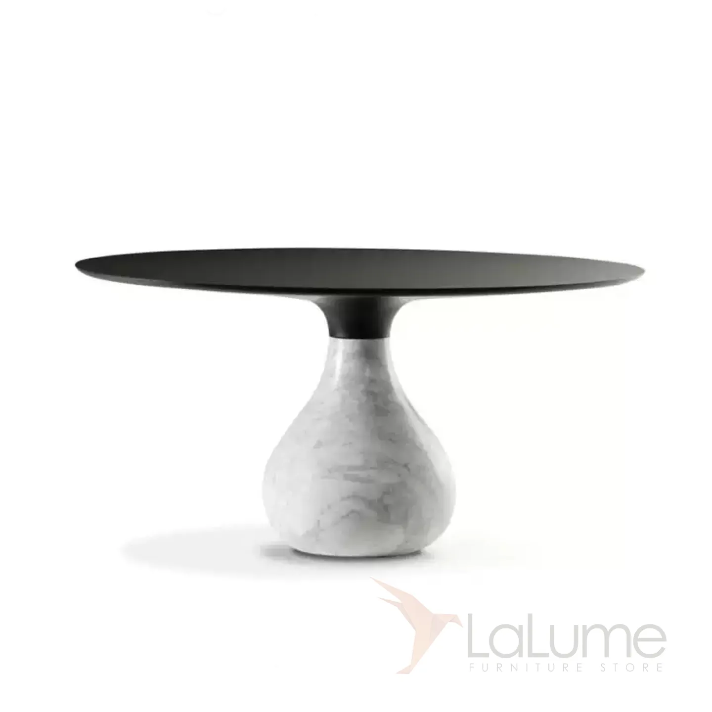 Обеденный стол с мраморным подстольем изящной формы и деревянной столешницей. К нему можно подобрать журнальные столики в аналогичном стиле.