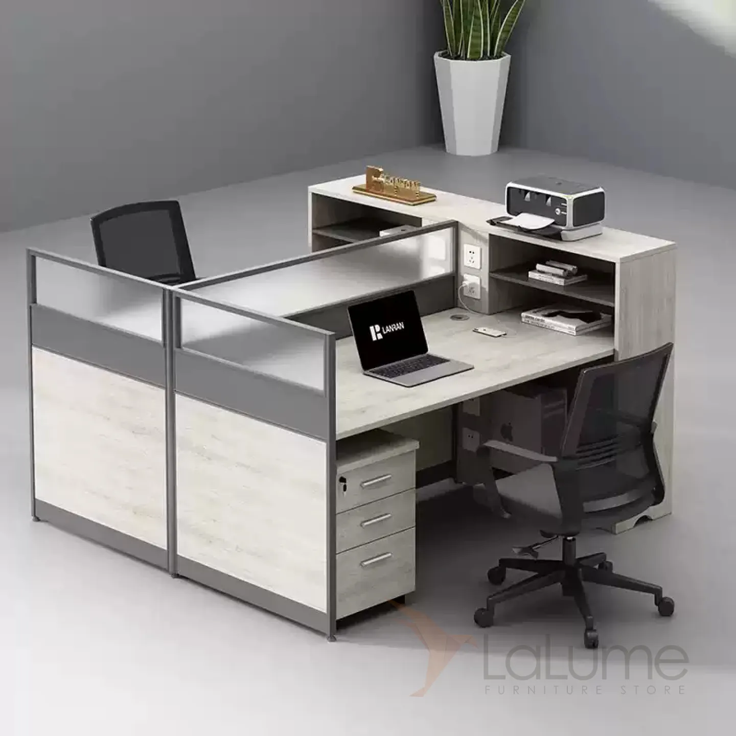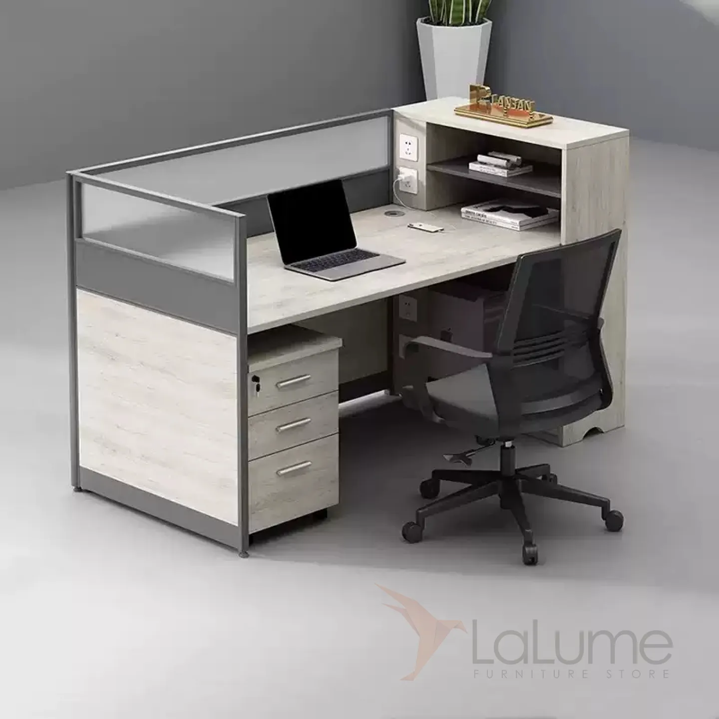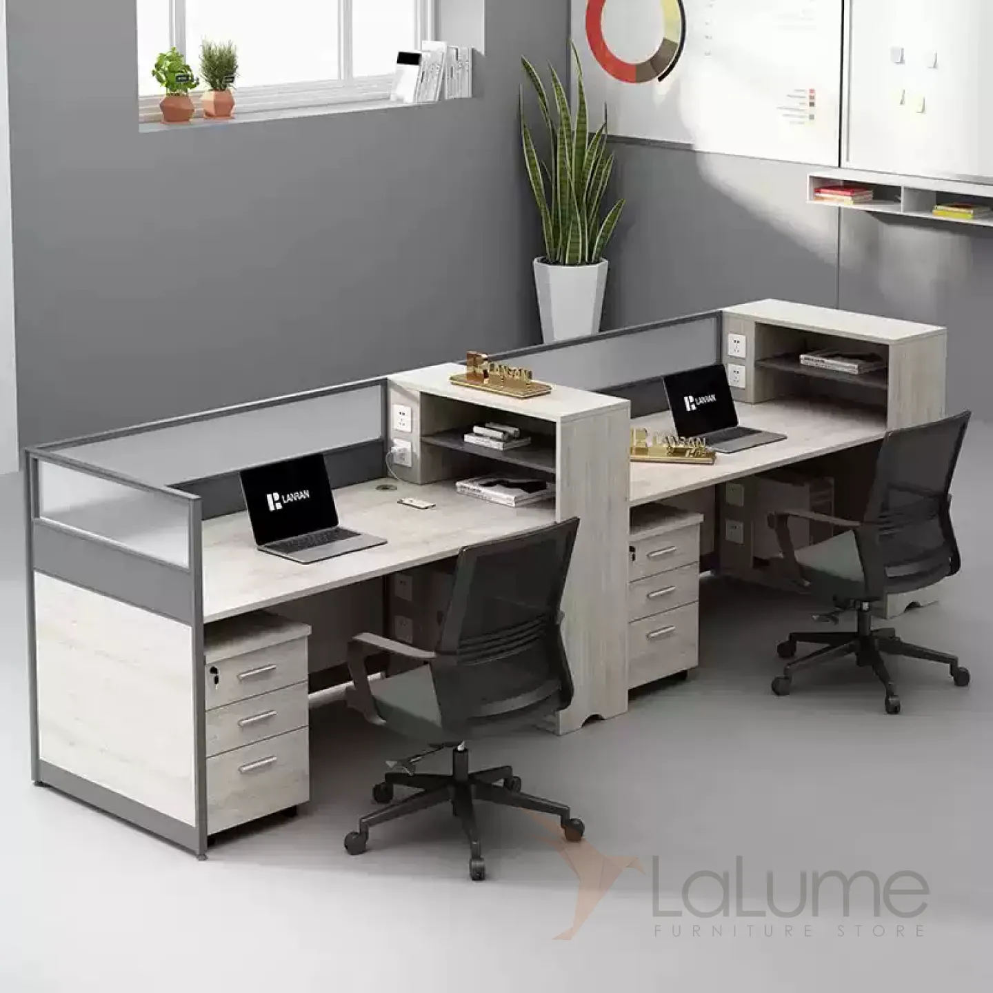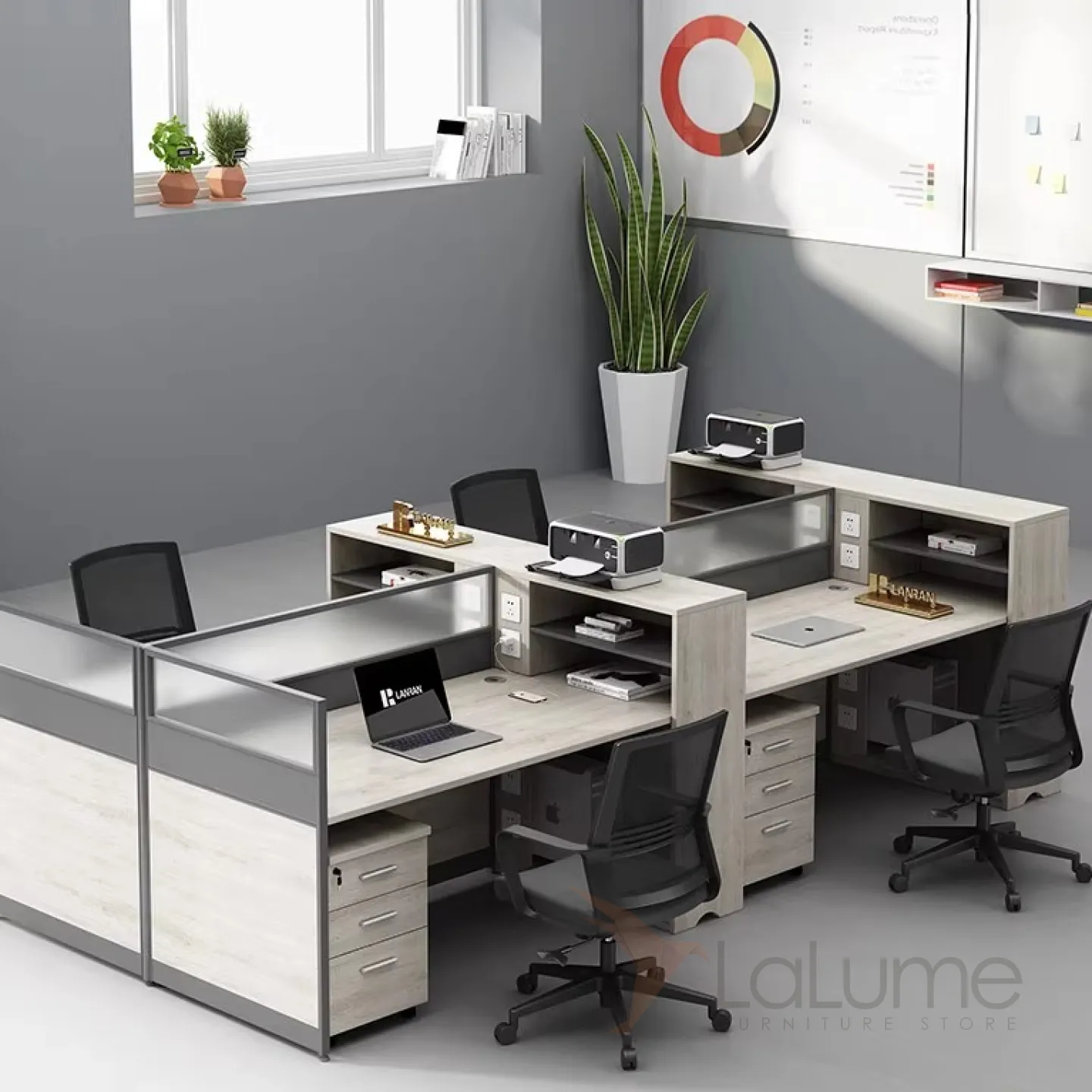 Практичные офисные столы из ДСП с полупрозрачными перегородками, рассчитанные на 1–6 сотрудников, с комодом, креслом по выбору. Вы легко подберете идеальный набор для вашего офиса.