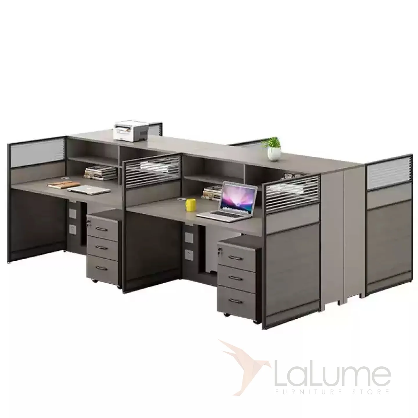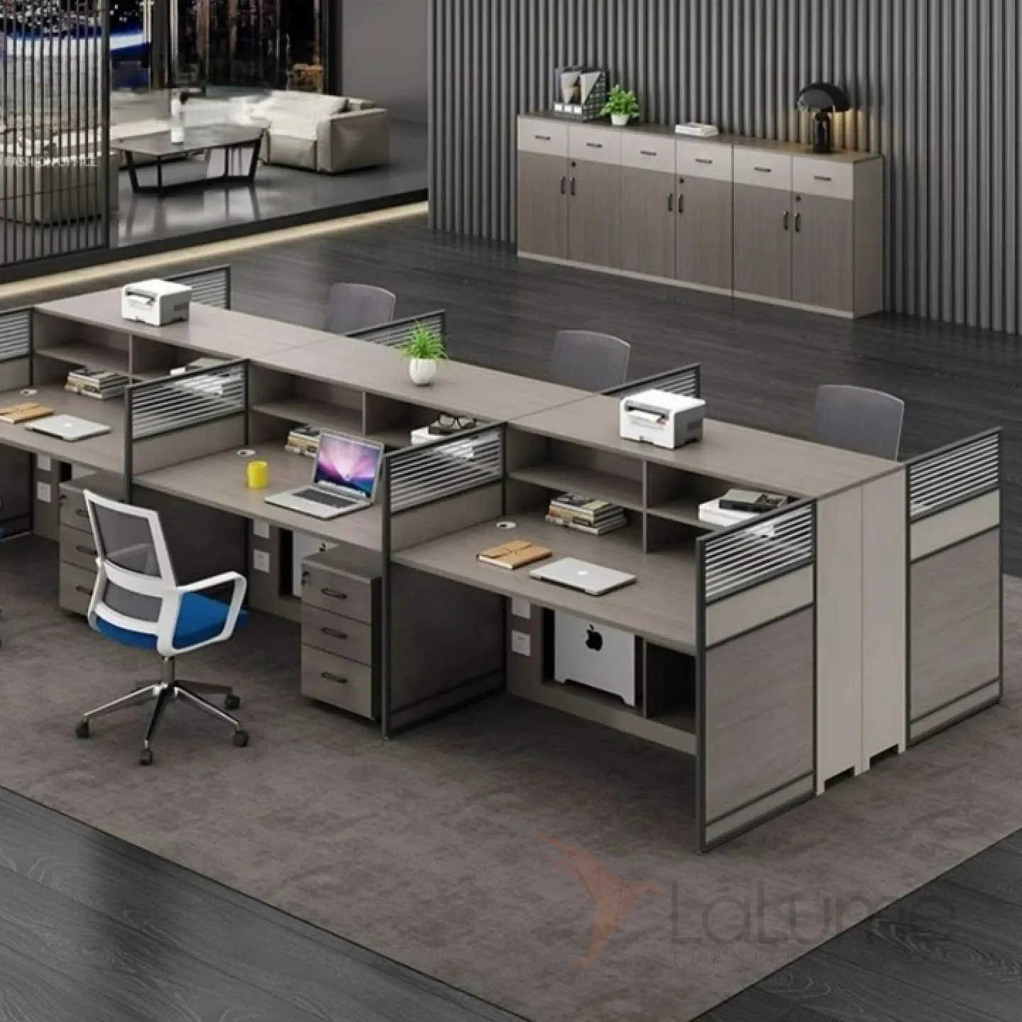 Практичные офисные столы из ДСП с перегородками и дополнительными полками, рассчитанные на 1–8 сотрудников, с комодом, креслом по выбору. Вы легко подберете идеальный набор для вашего офиса.