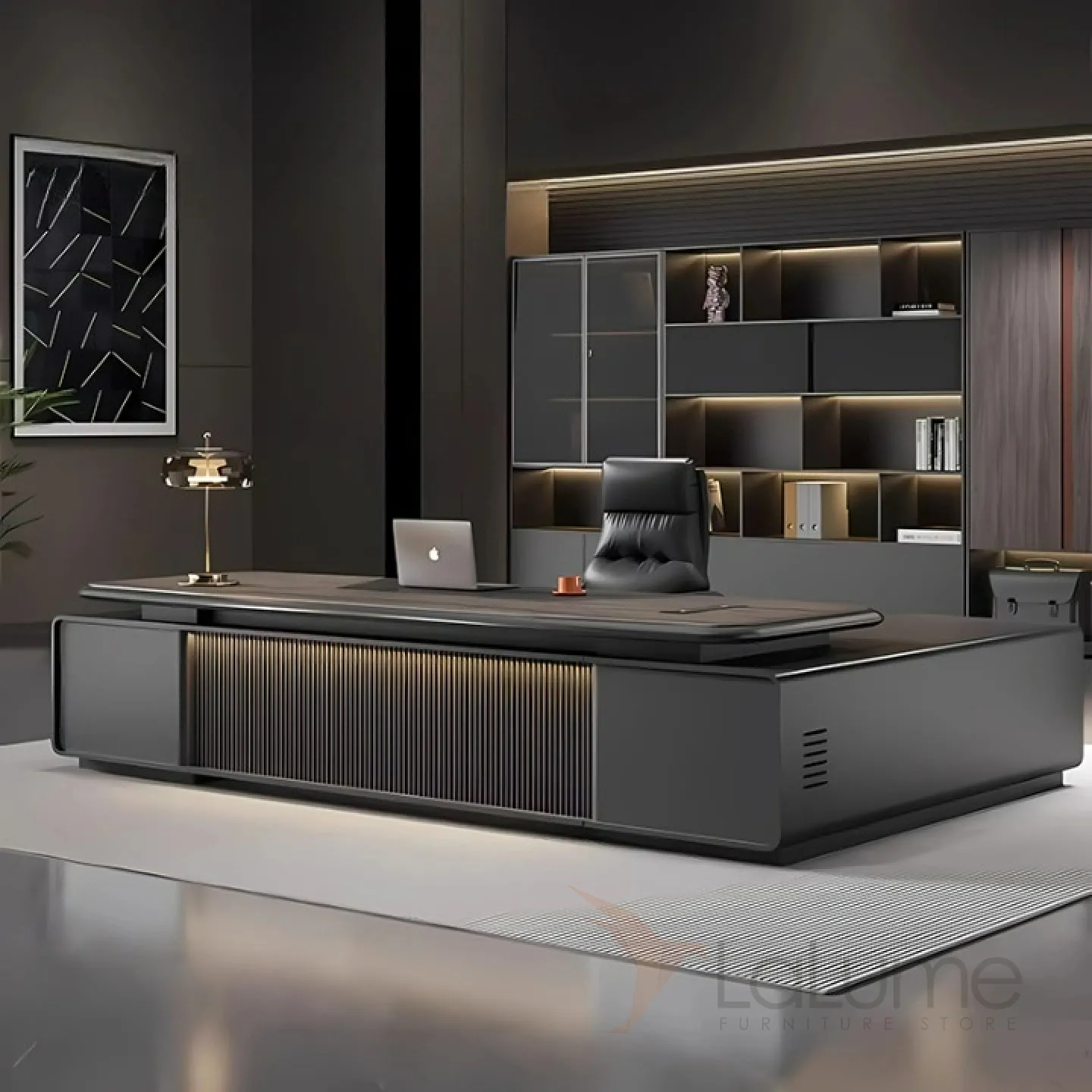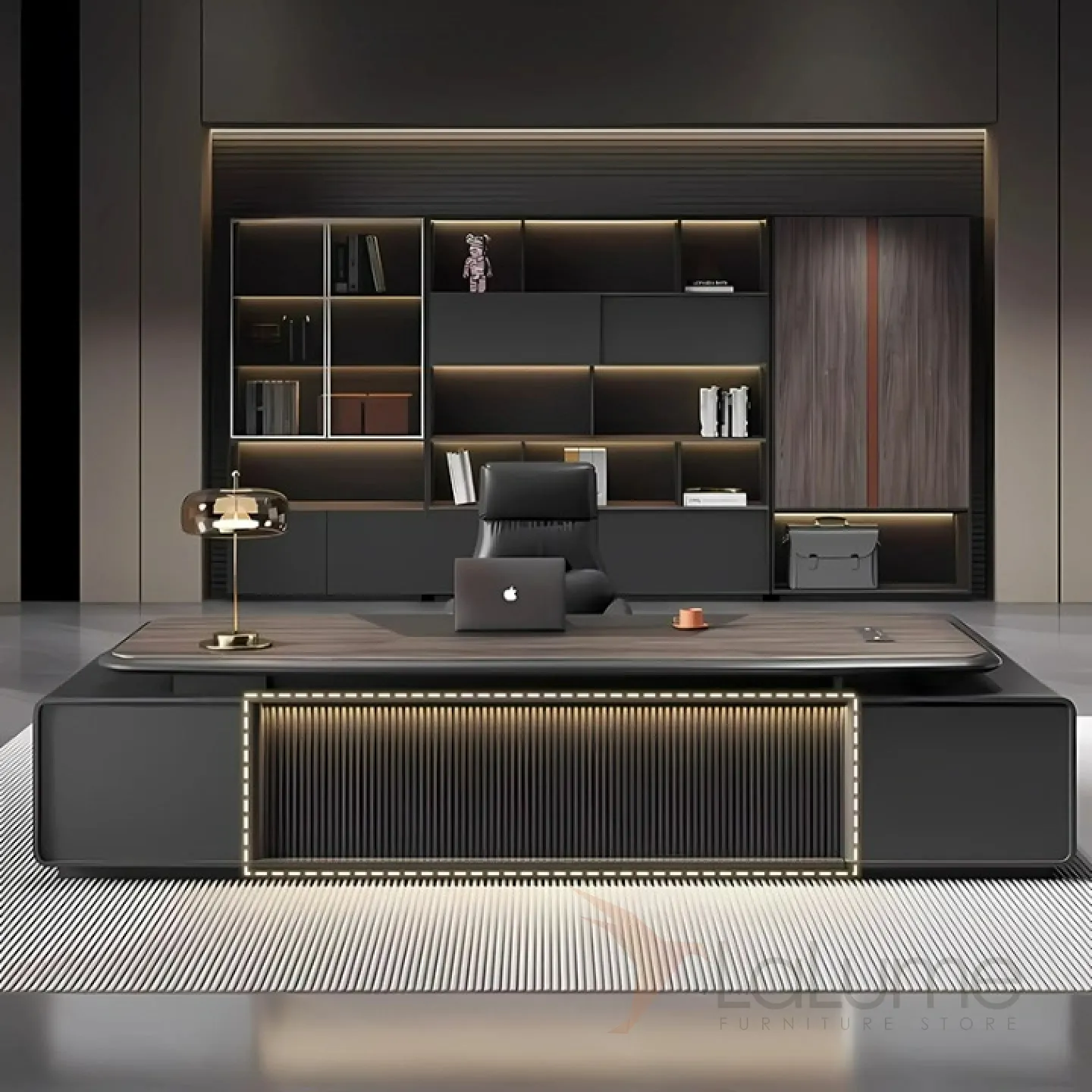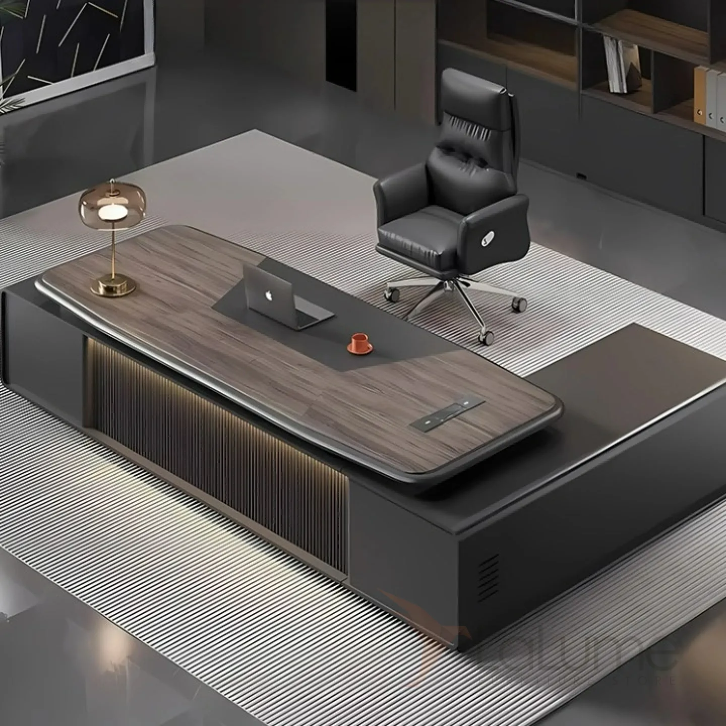 Стол руководителя премиального качества с подсветкой и отсеком для проводов, предусмотрены 2 комода по сторонам с выдвижными ящиками, в том числе и на замке. Есть варианты комплектации с кожаным креслом и шкафом. Можно выбрать нужный размер, а также приобрести кресло и шкаф.