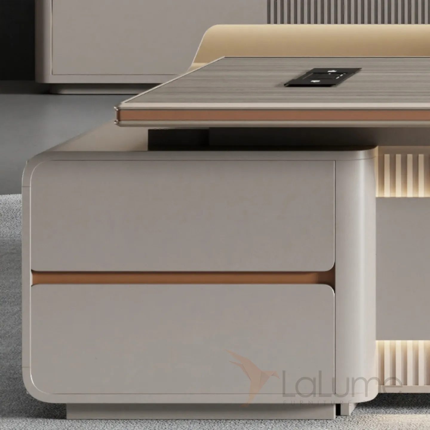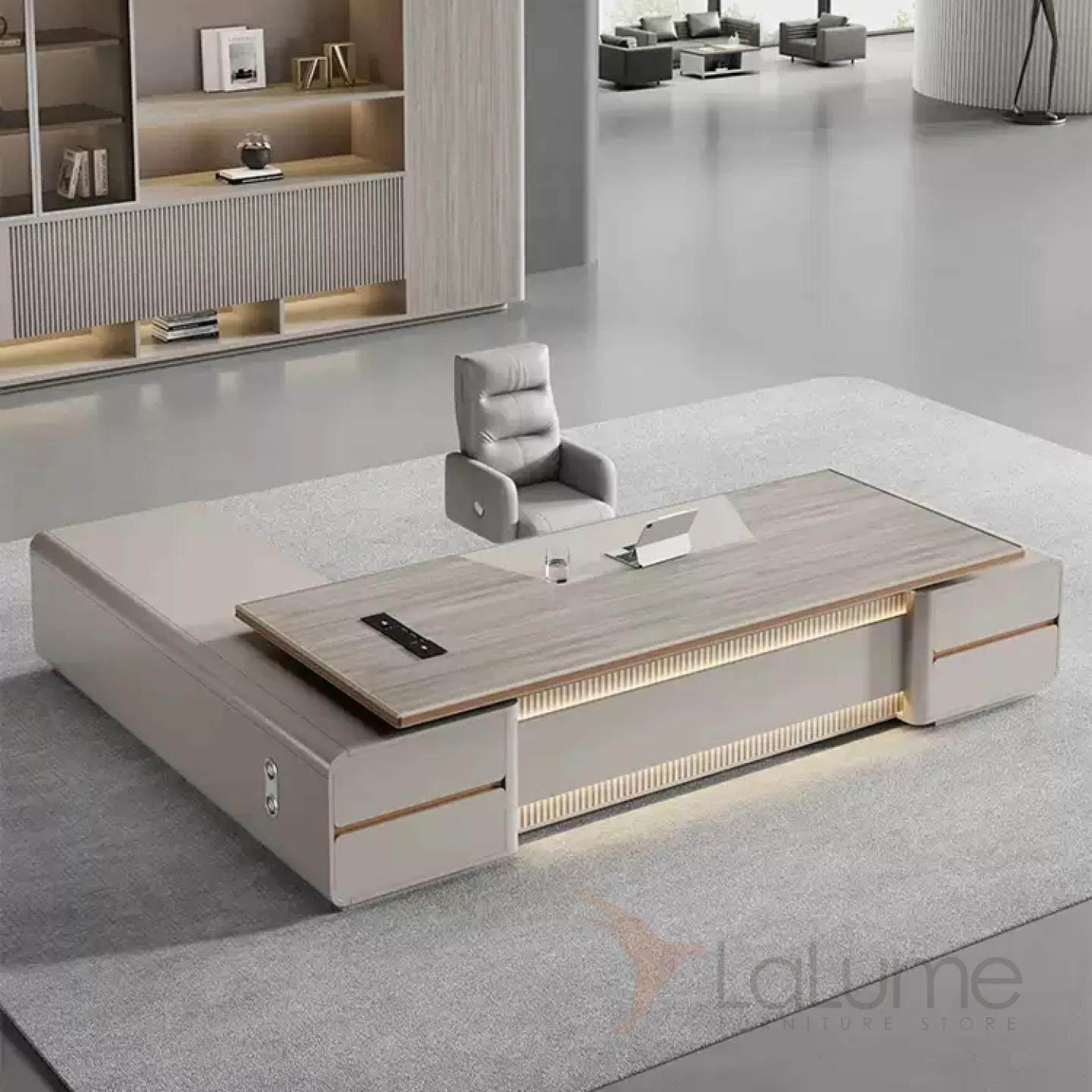 Роскошный стол руководителя с подсветкой, с отделением для проводов, шкафчик с ящиками и дверкой. На выбор стол разной длины, есть вариант с креслом и шкафом.