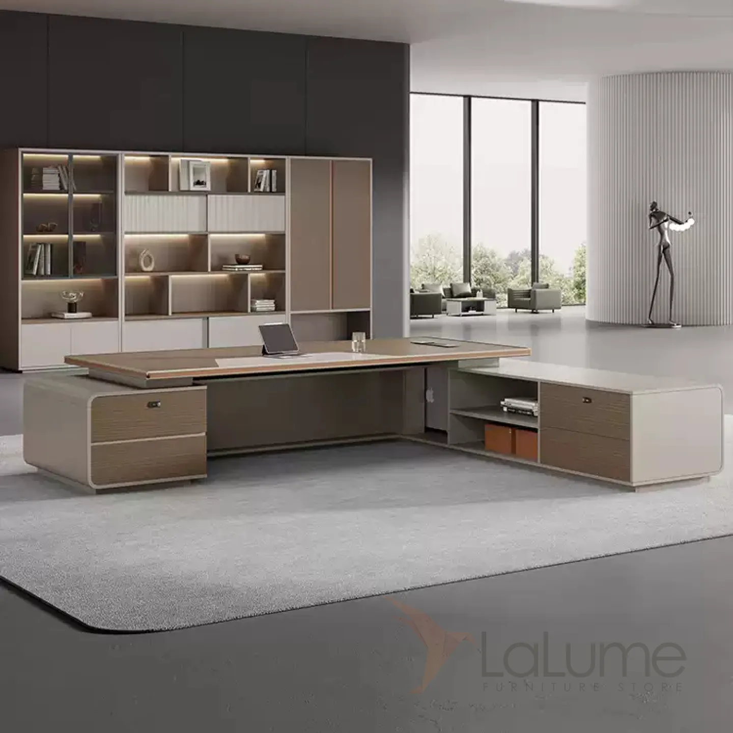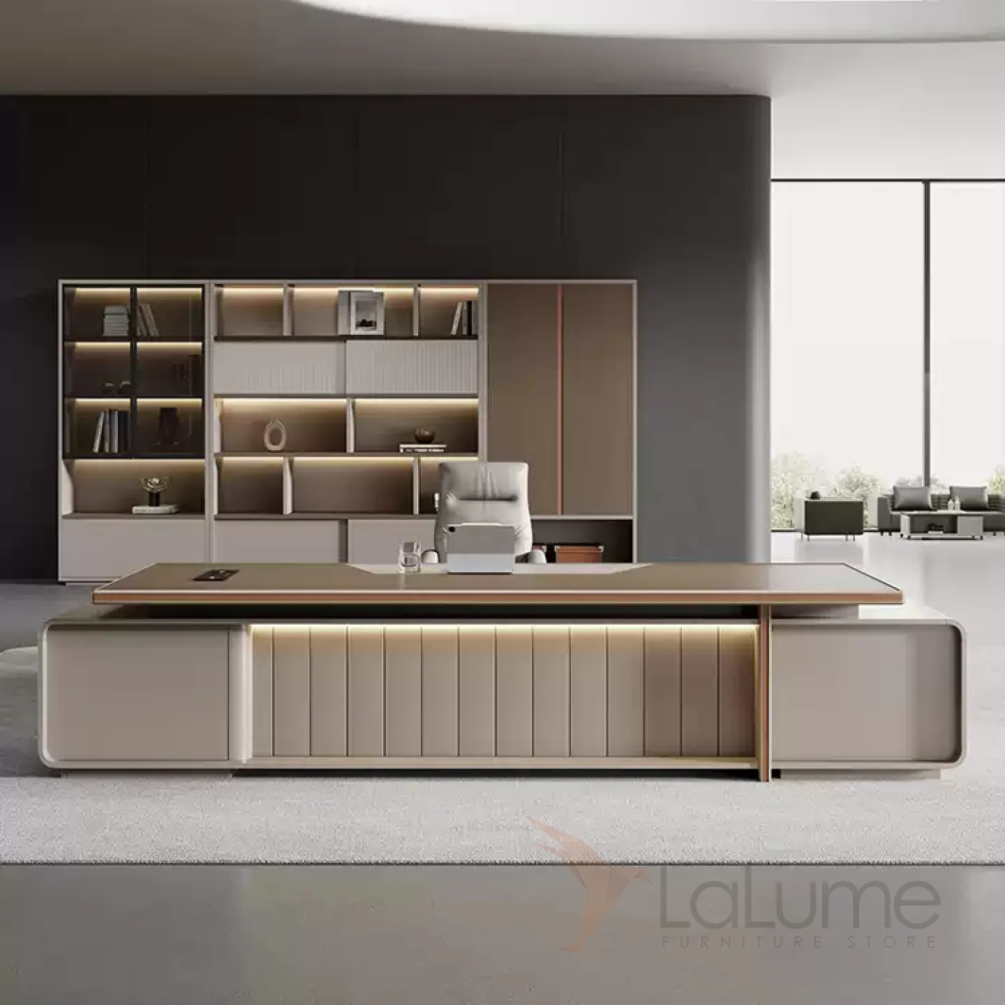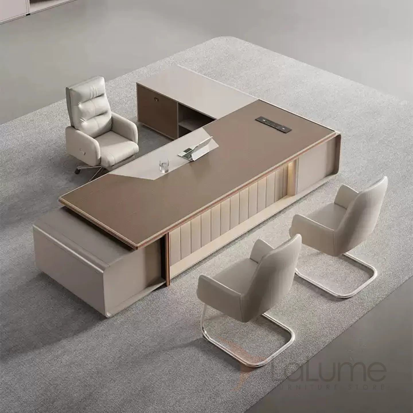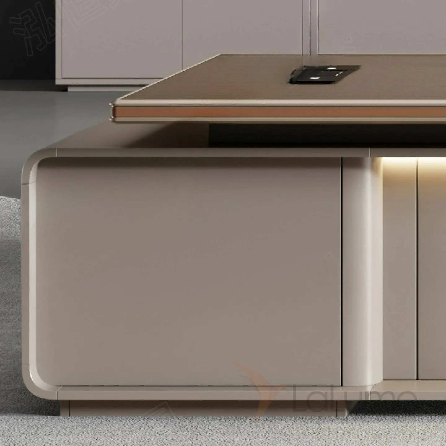 Роскошный стол руководителя с подсветкой с отделением для проводов, шкафчиком с ящиками. На выбор стол разной длины, есть вариант с креслом и шкафом.
