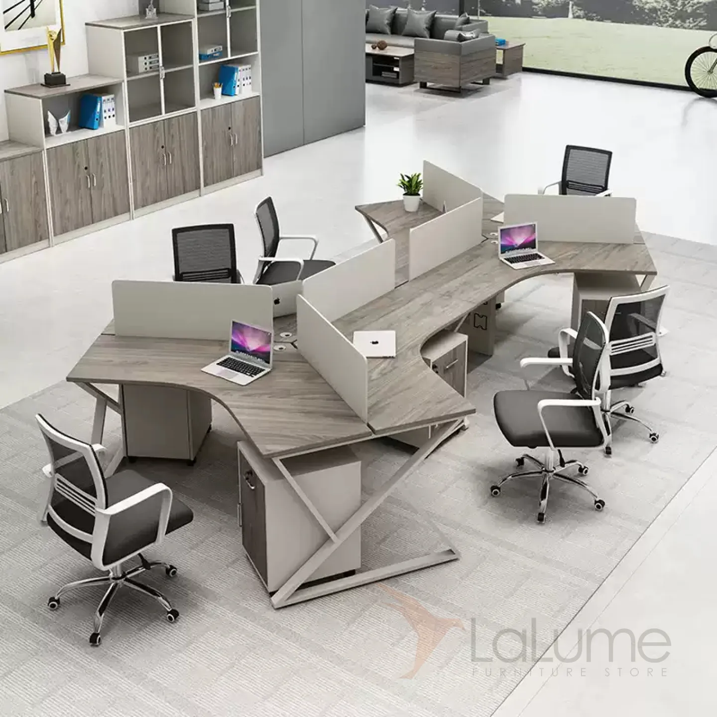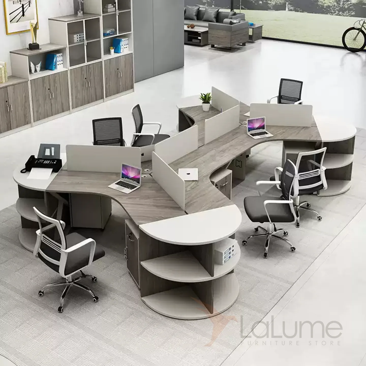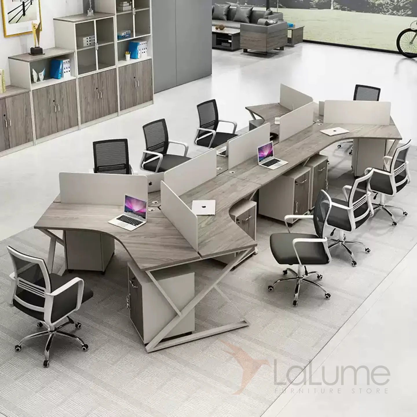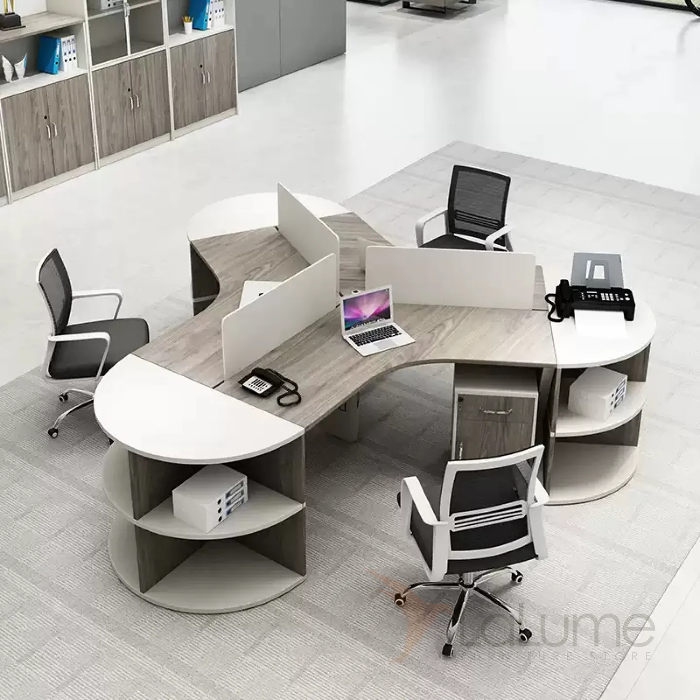 Практичные офисные столы из ДСП с перегородками и дополнительными полками, рассчитанные на 3–8 сотрудников, с комодом, вставками полукругами с полками. Вы легко подберете идеальный набор для вашего офиса.