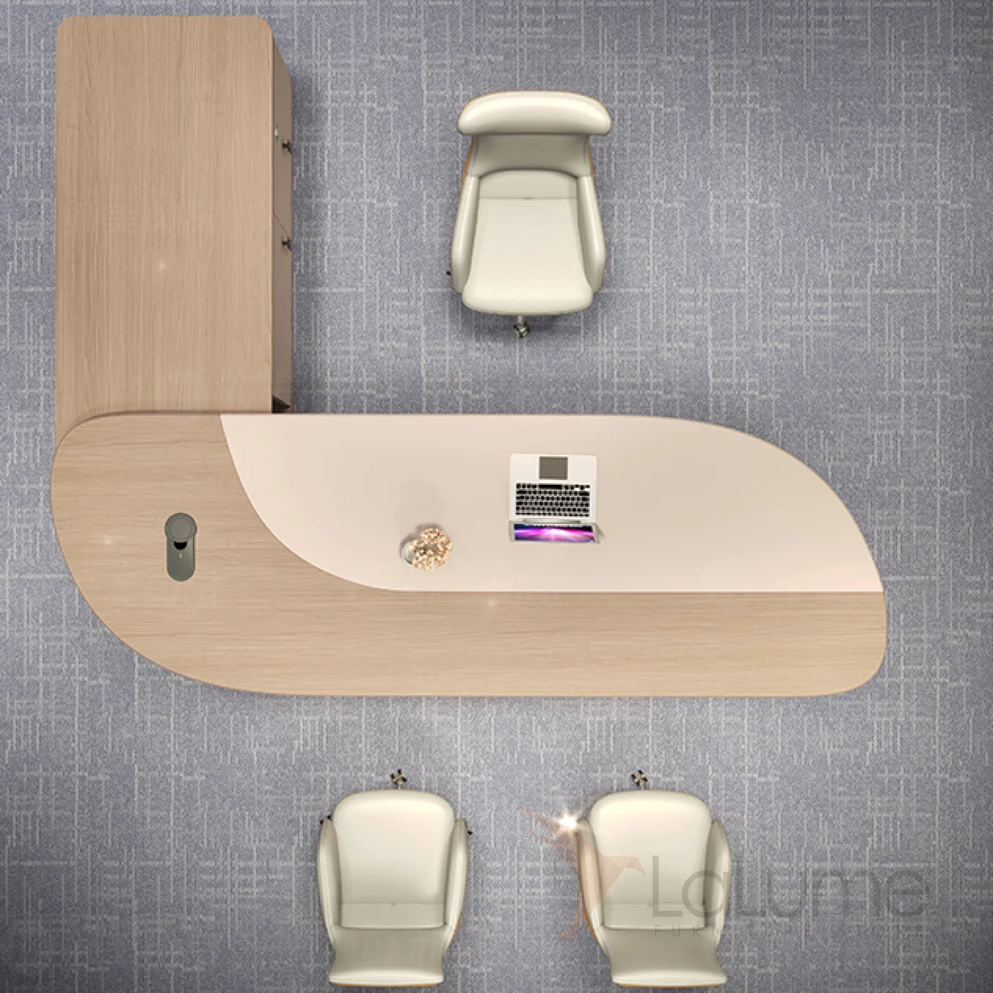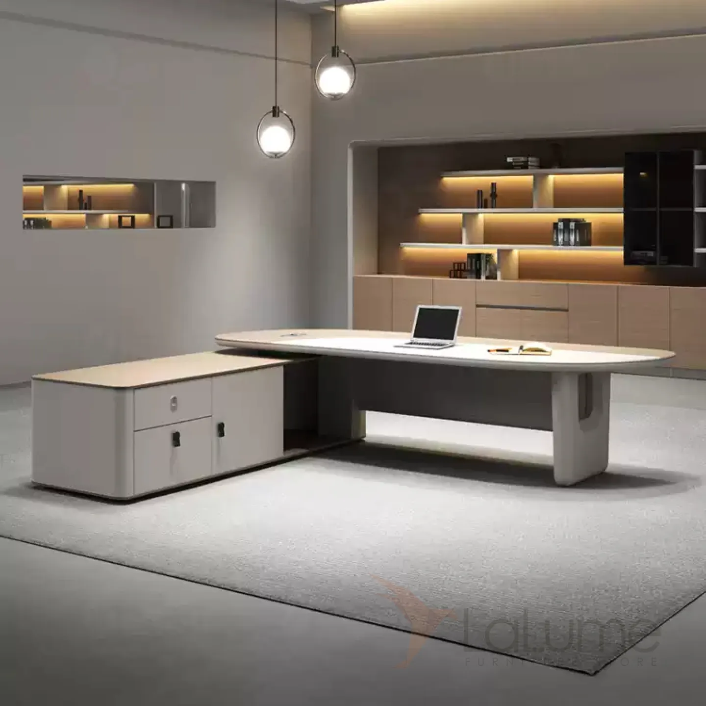 Практичный стол руководителя с подсветкой, с отделением для проводов, шкафчиком с ящиками и дверками. На выбор стол разной длины, есть вариант с кожаным креслом и шкафом.