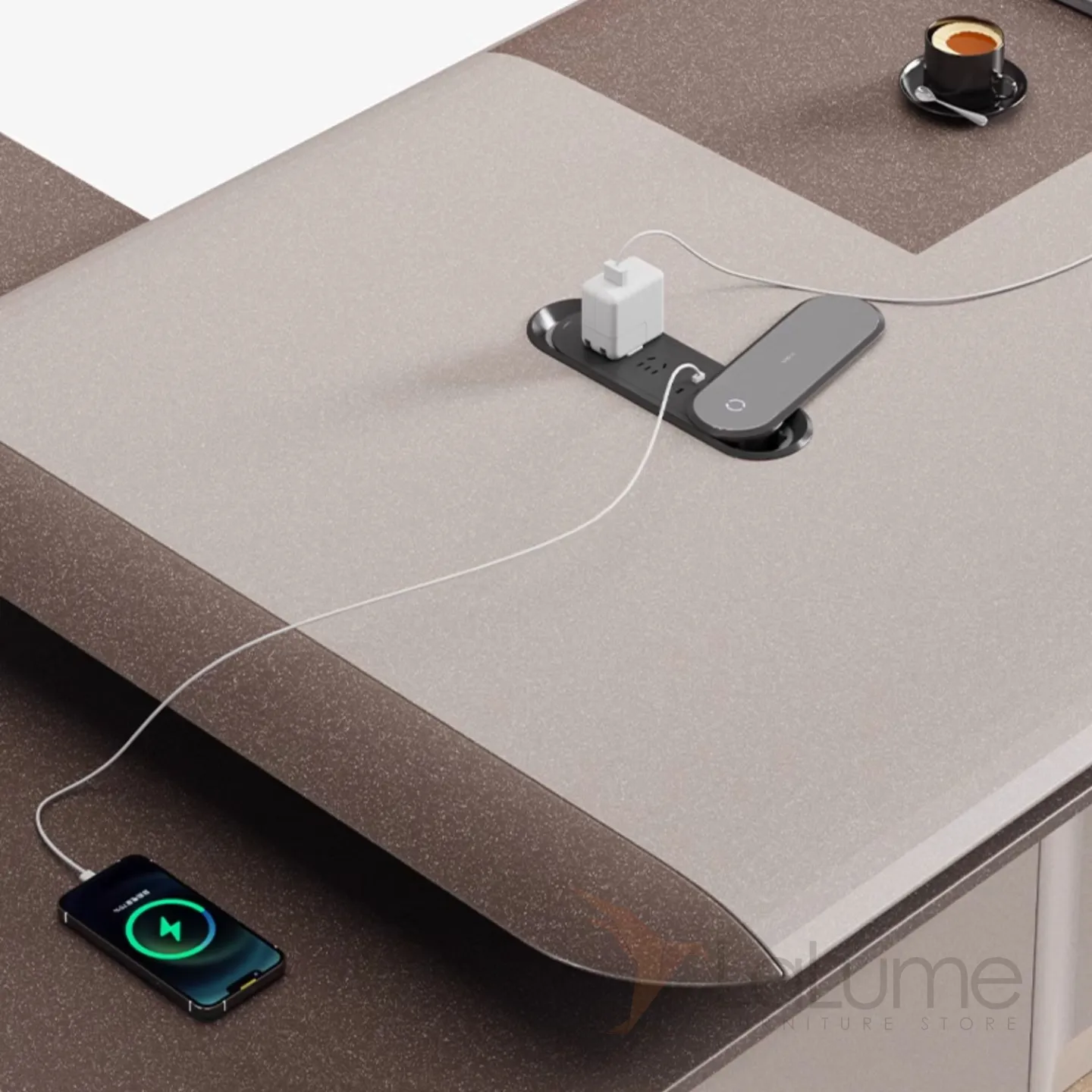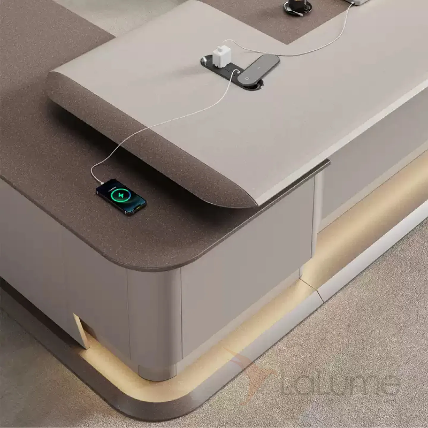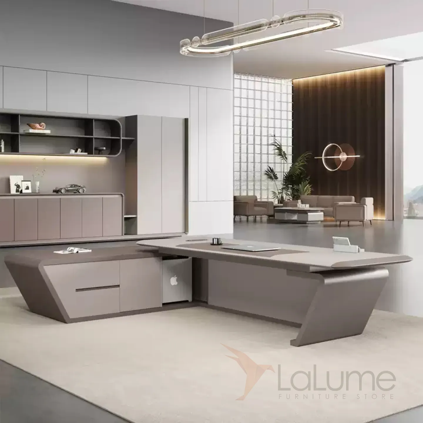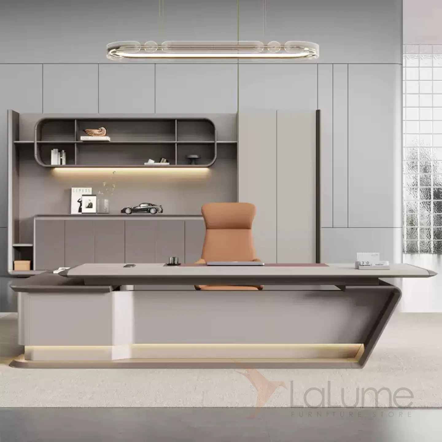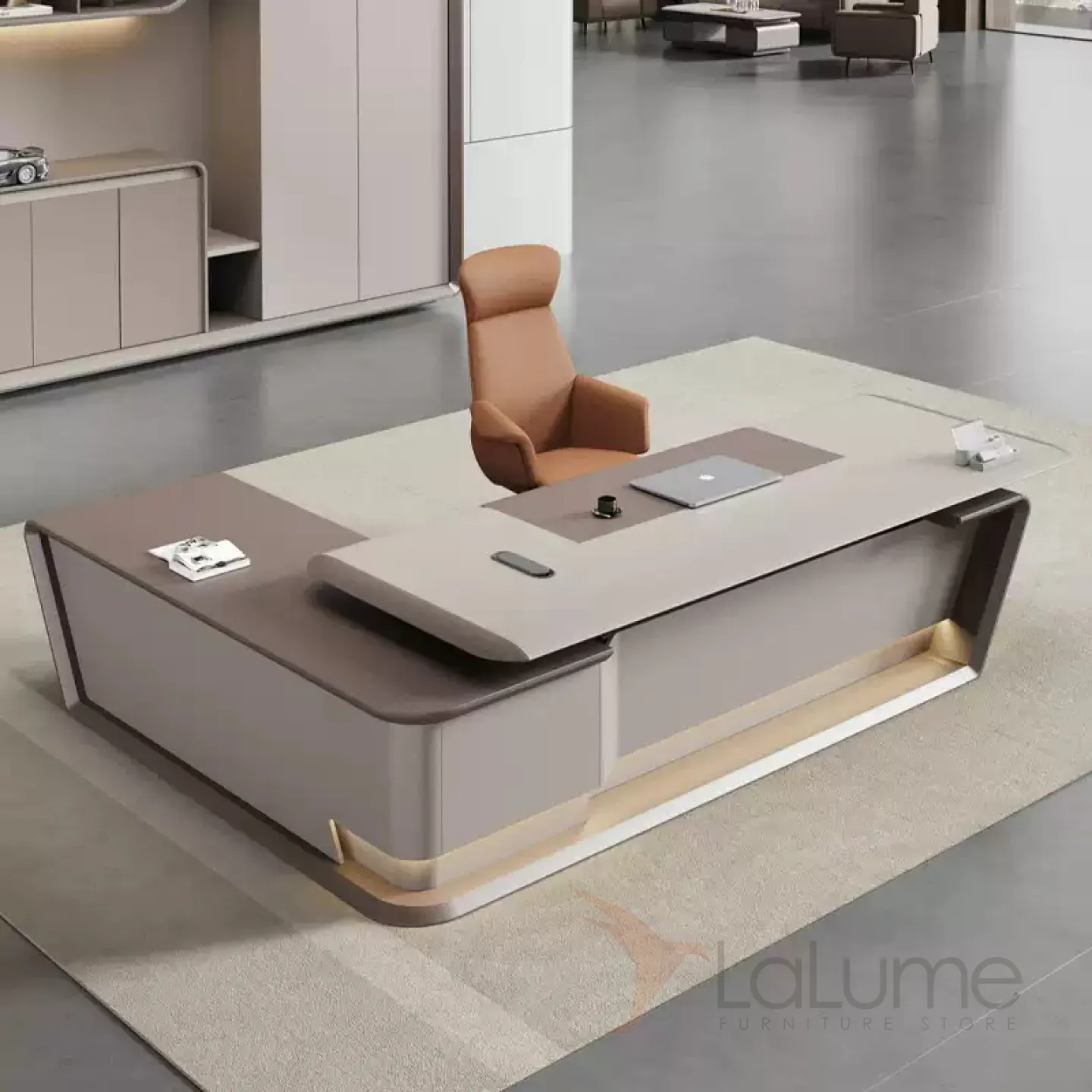 Практичный стол руководителя с подсветкой, с отделением для проводов, шкафчиком с ящиками и дверкой. На выбор стол разной длины, есть вариант с кожаным креслом и шкафом.