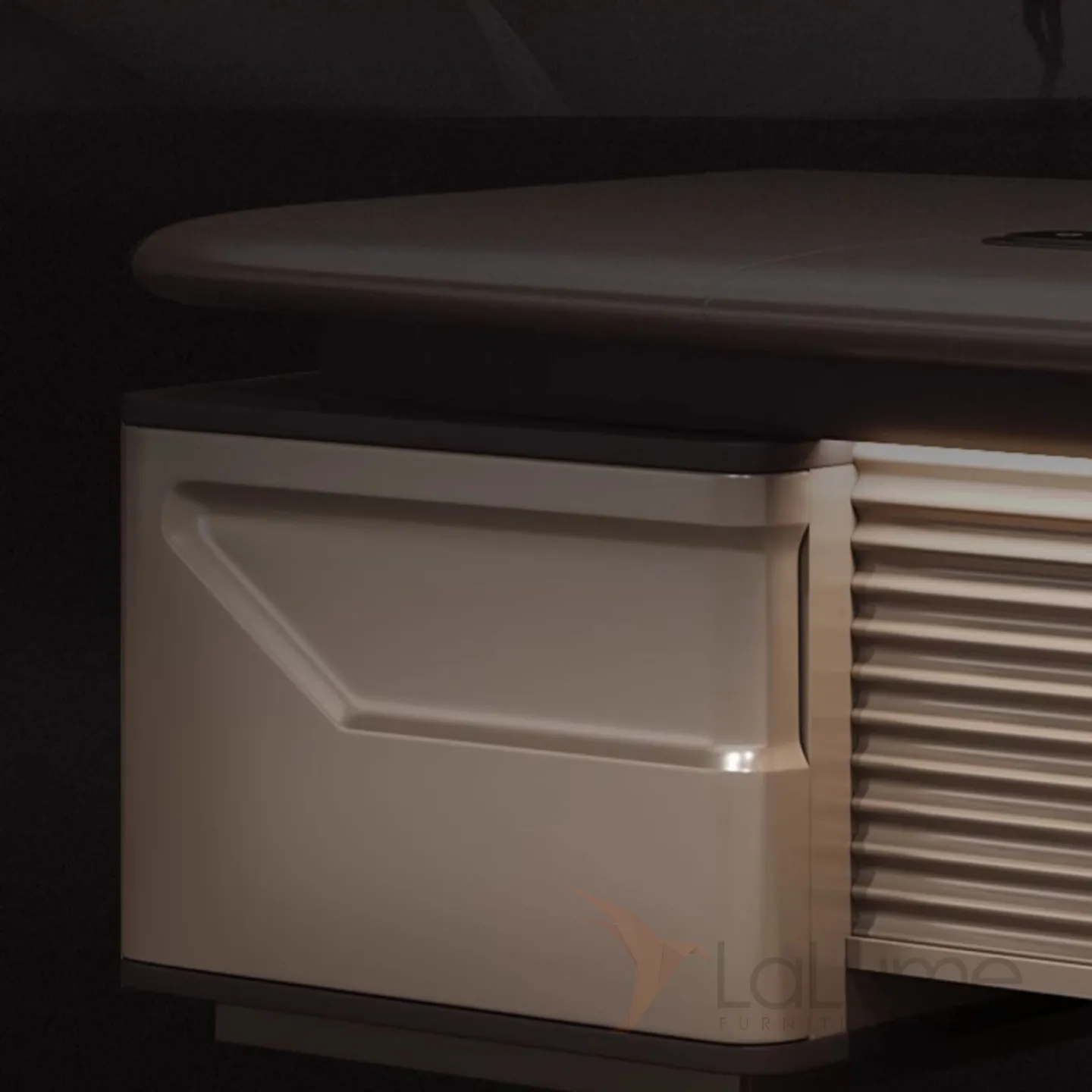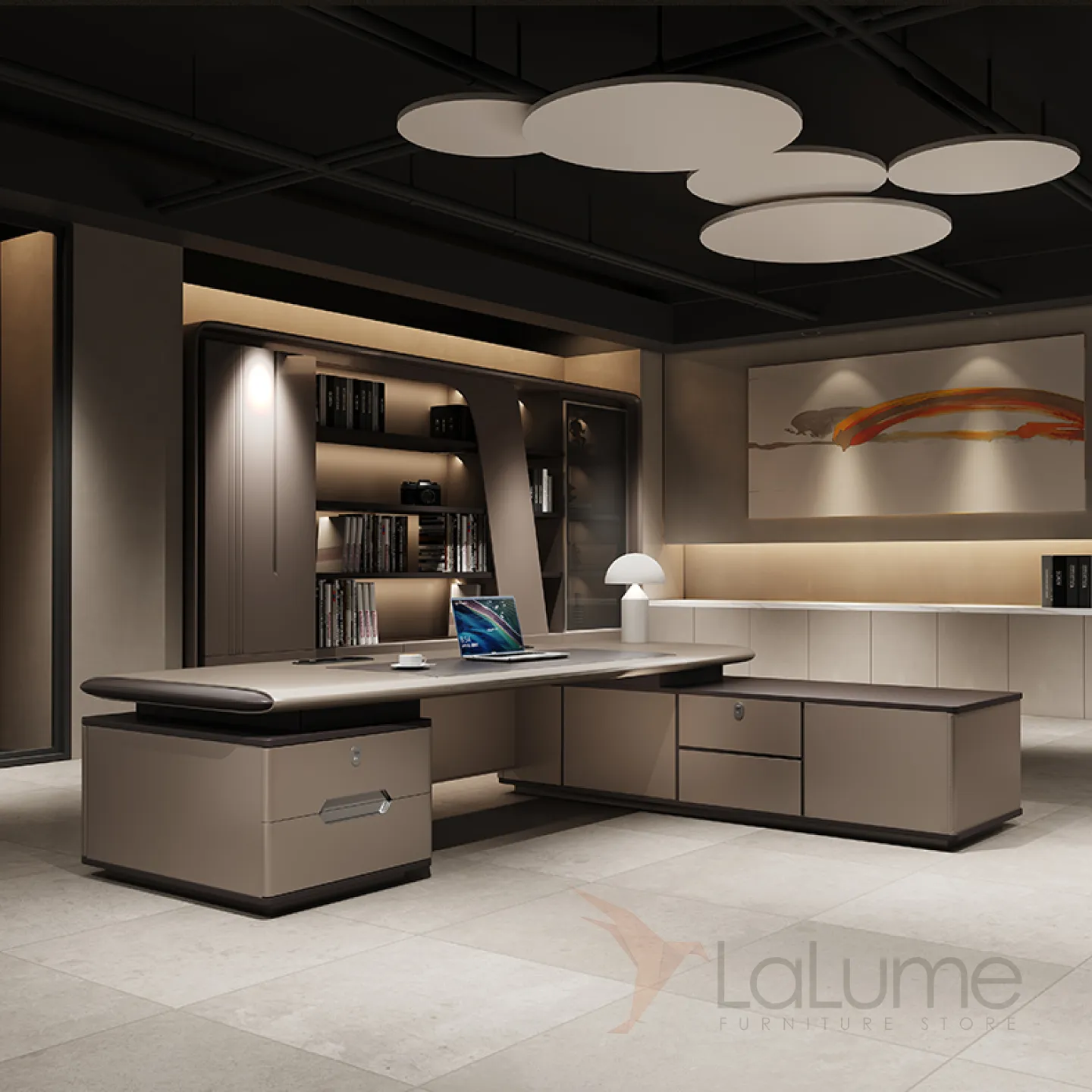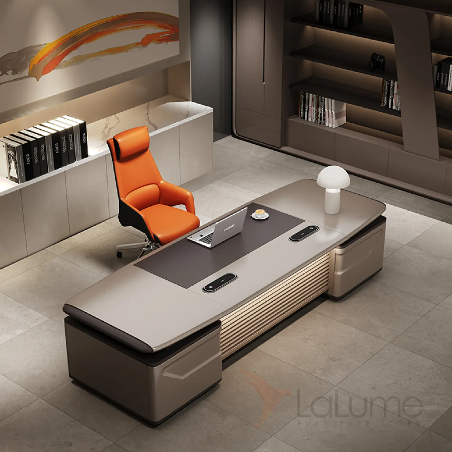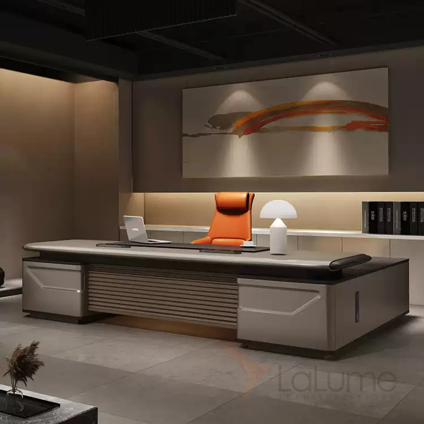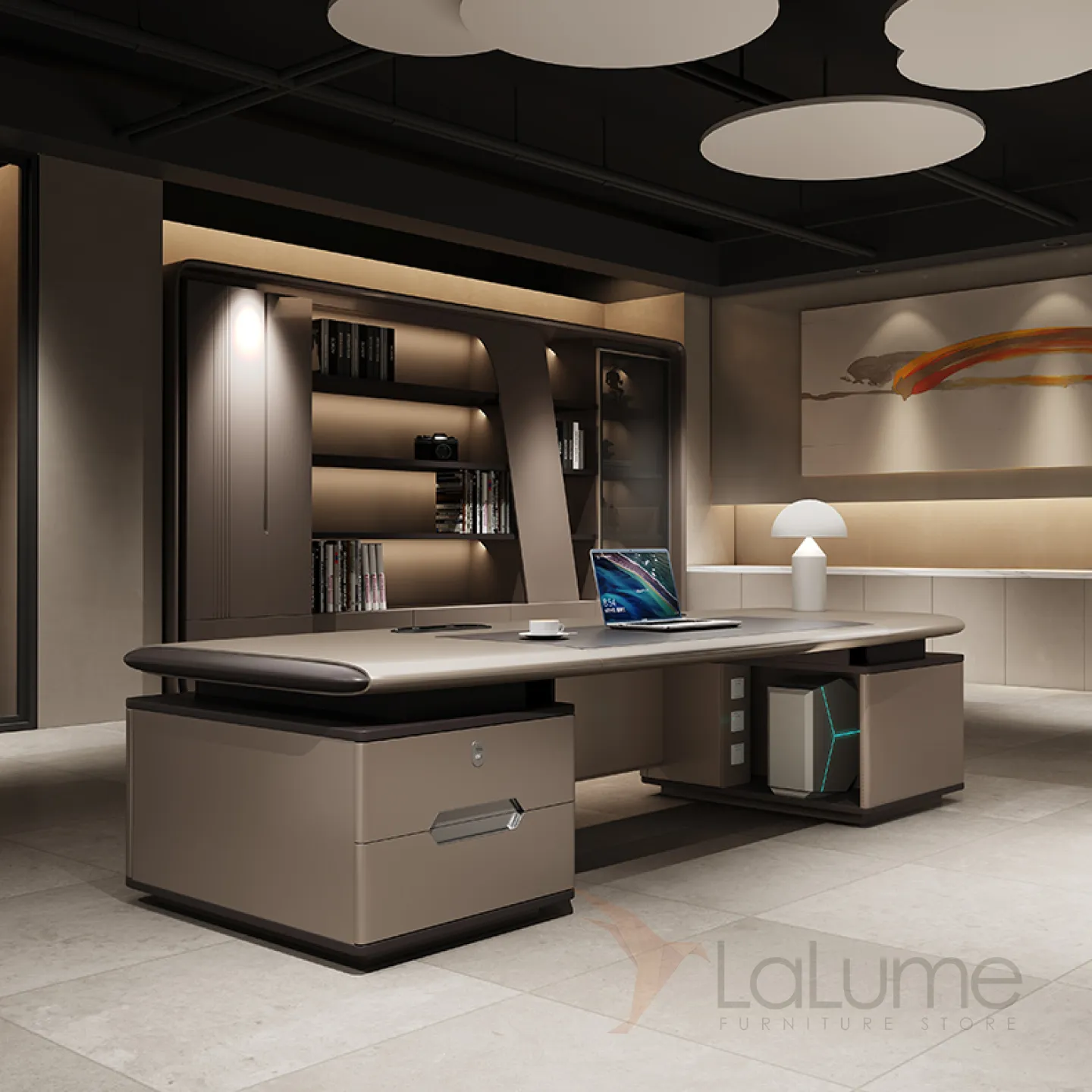 Современный стол руководителя с подсветкой, с отделением для проводов, шкафчиком с ящиками и дверкой. На выбор стол разной длины, есть вариант с кожаным креслом и шкафом.