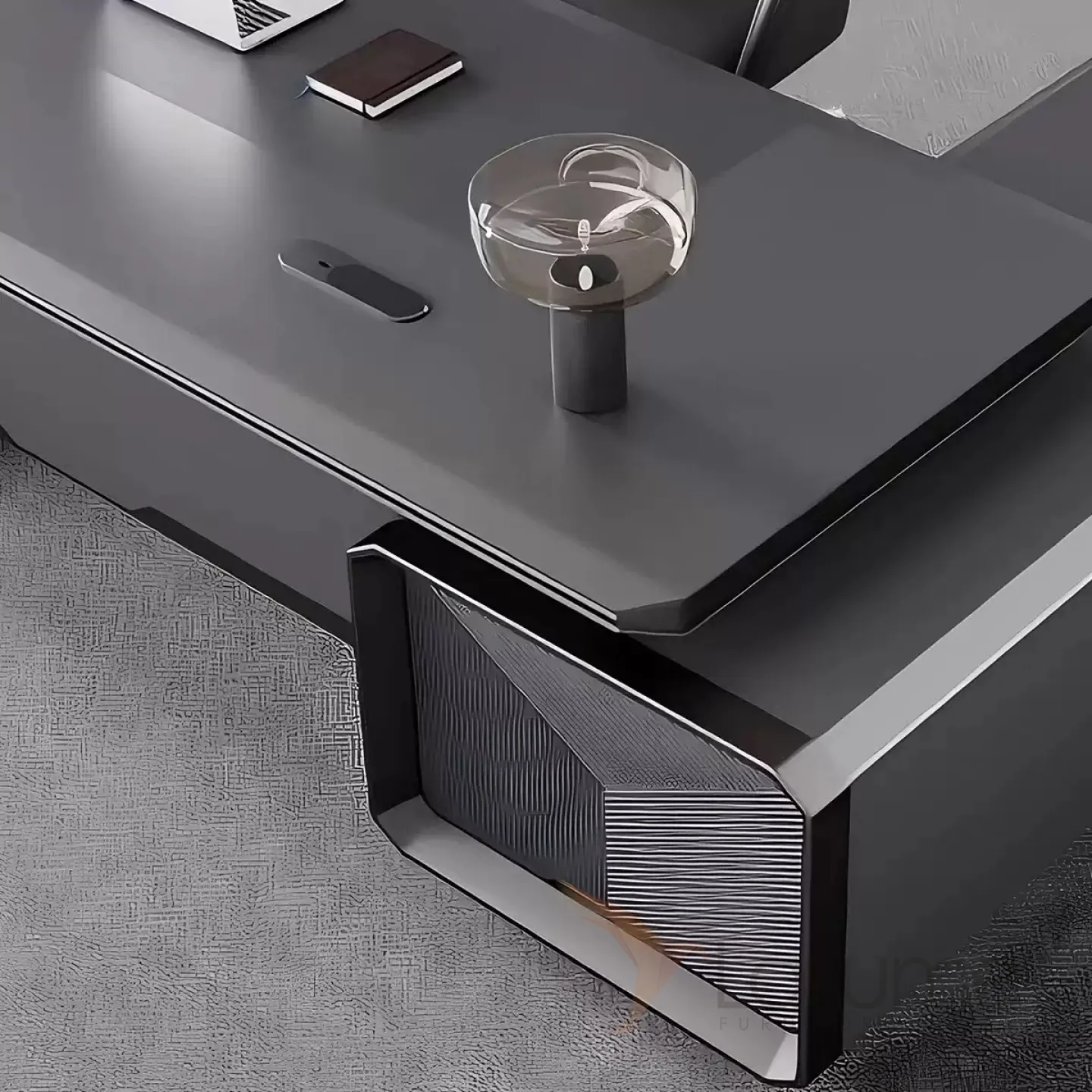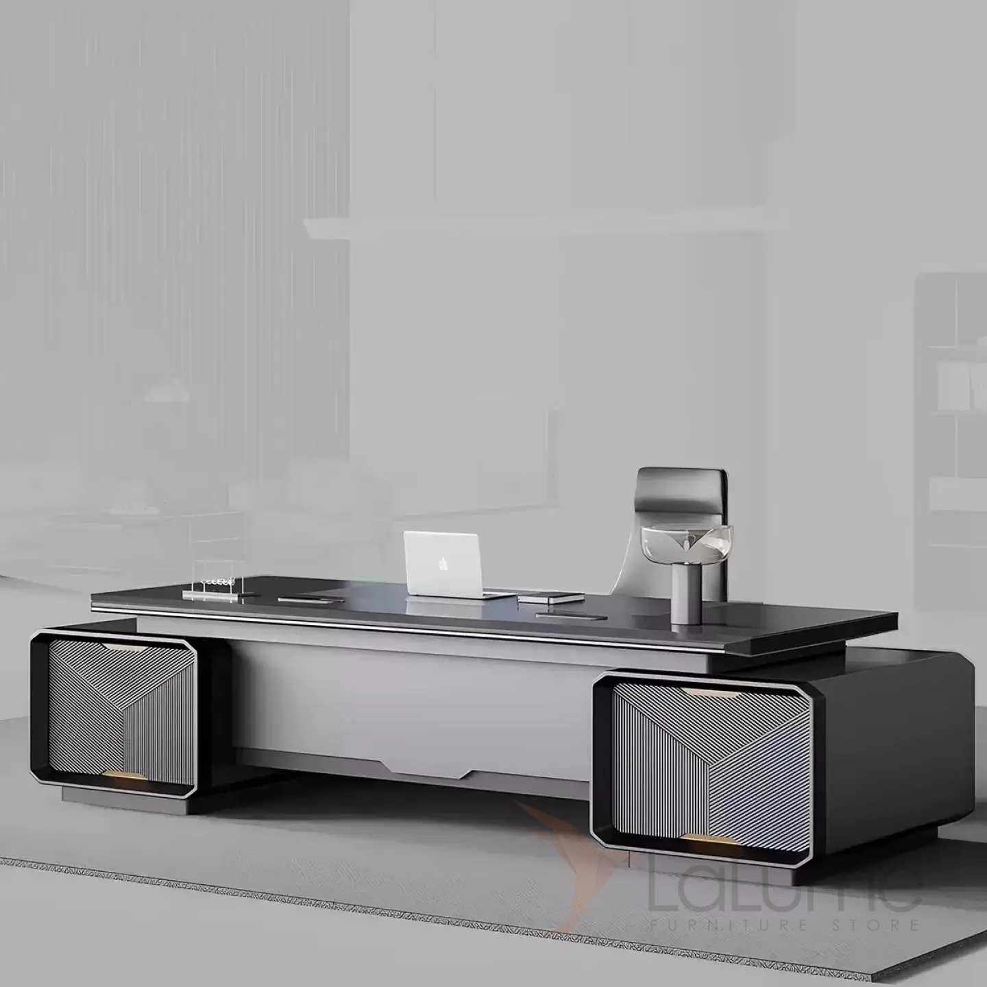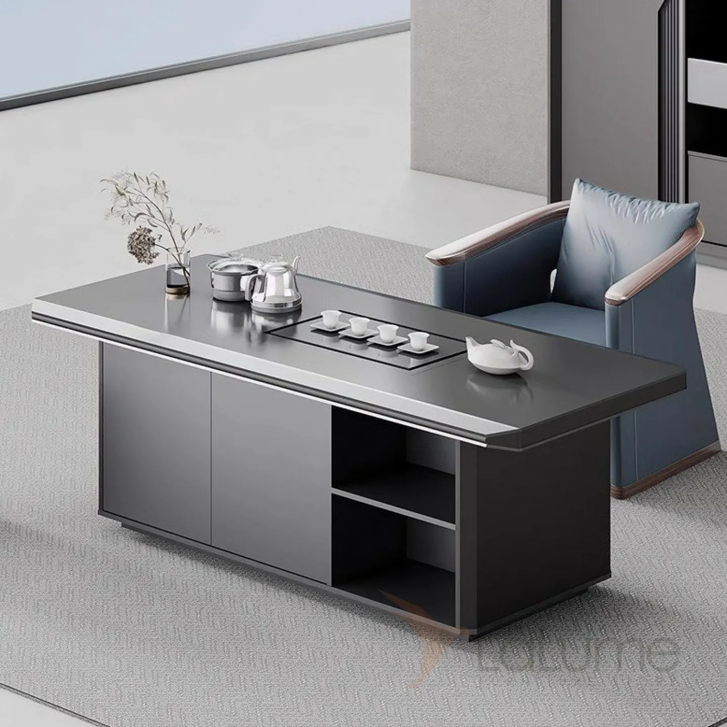 Современный стол руководителя с отделением для проводов, шкафчиком с ящиками и дверкой. На выбор стол разной длины, есть вариант с кожаным креслом, чайным столиком шкафом с подсветкой.