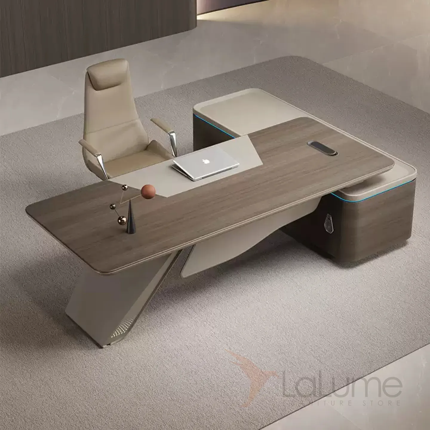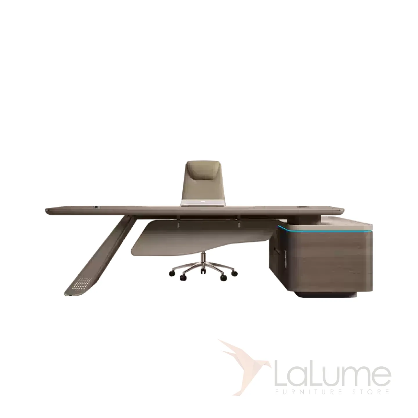 Современный стол руководителя с отделением для проводов, шкафчиком с ящиками и дверкой. На выбор стол разной длины, есть вариант с кожаным креслом и шкафом с подсветкой.