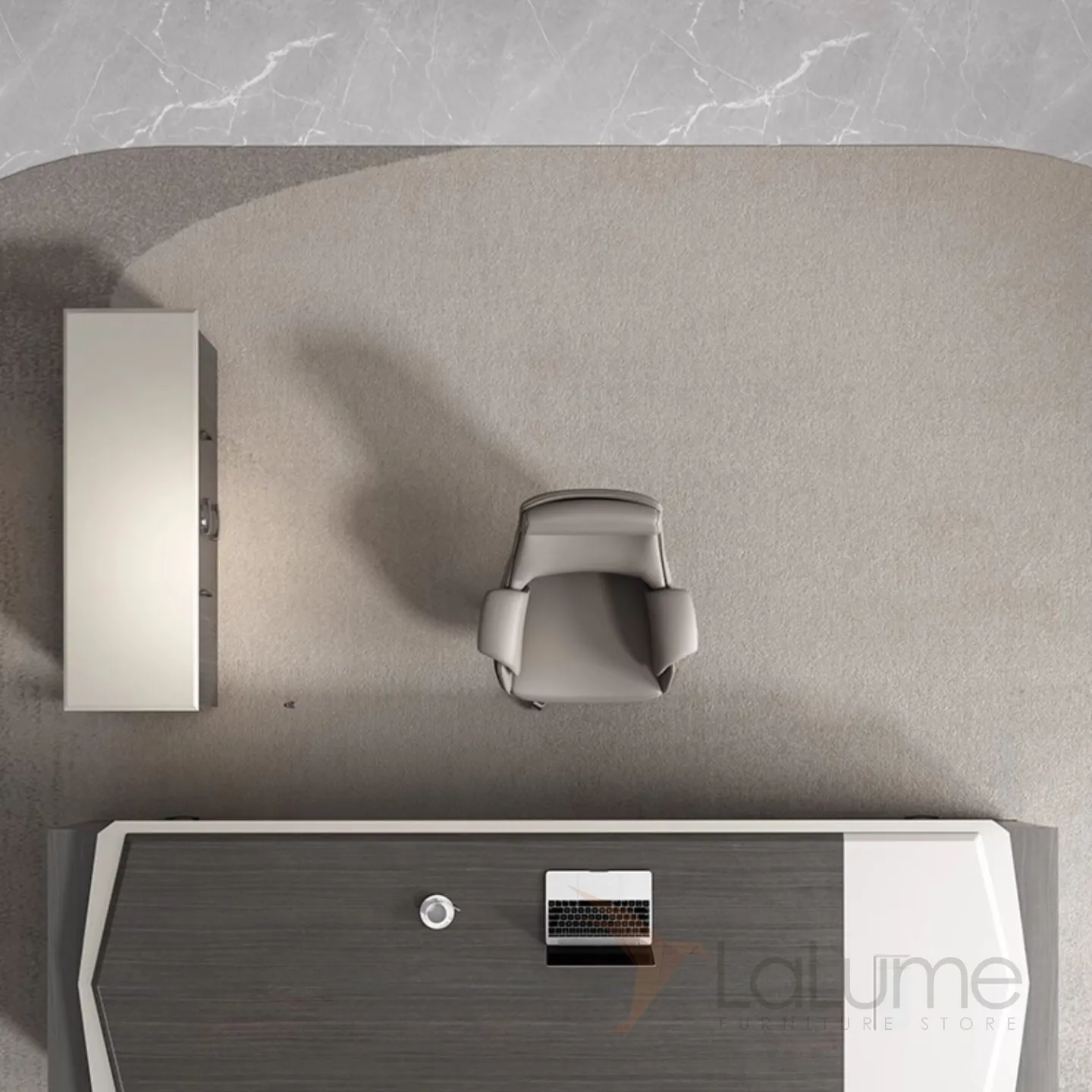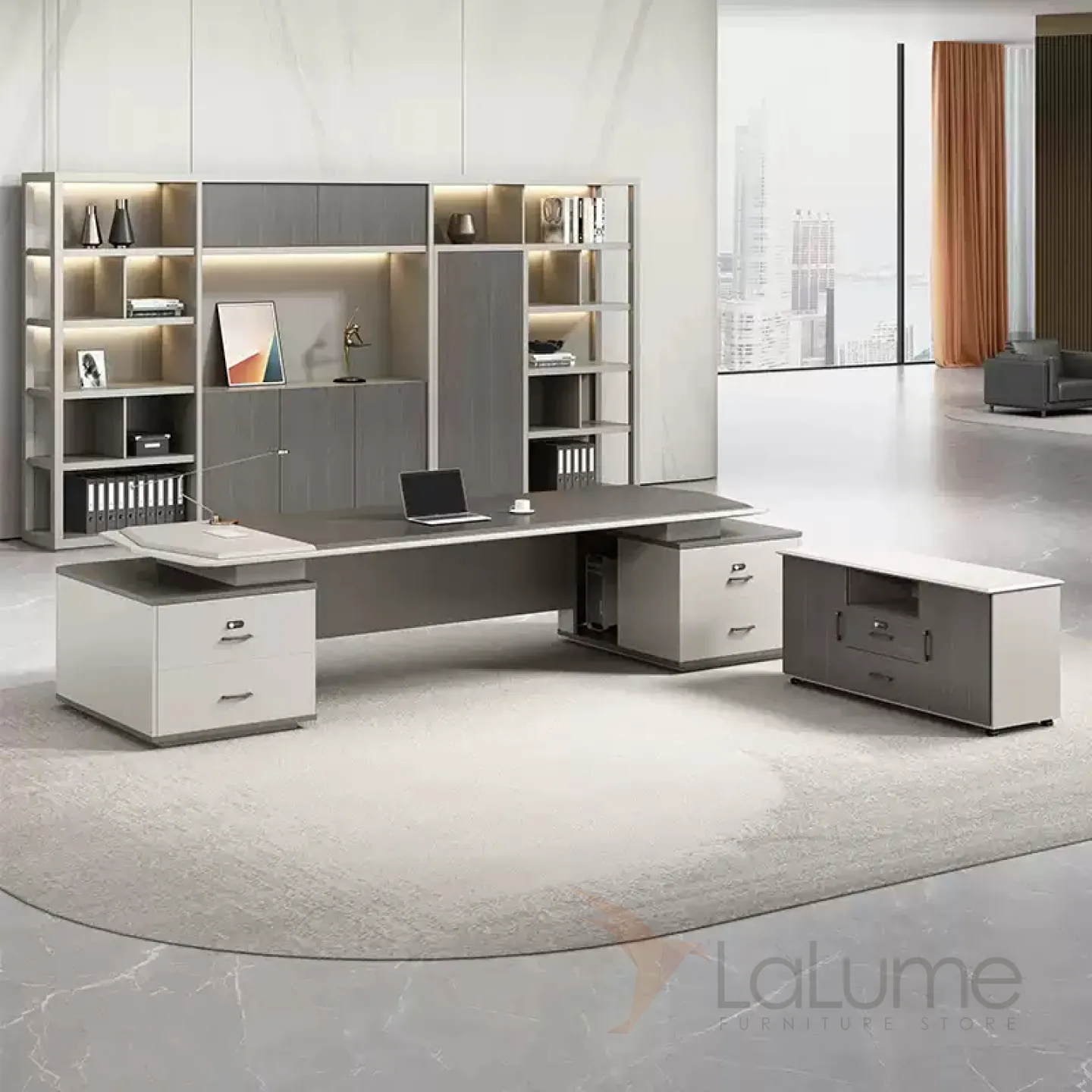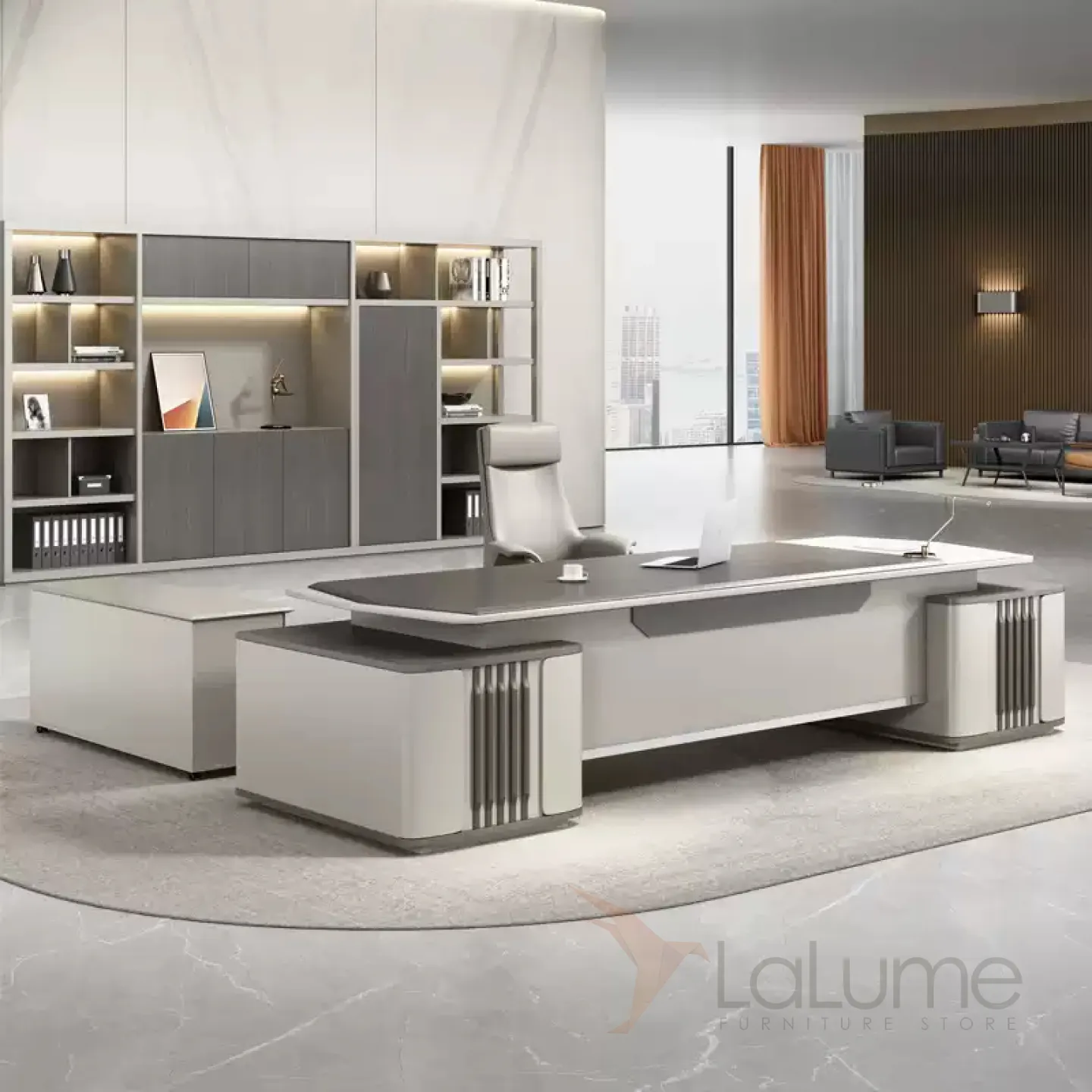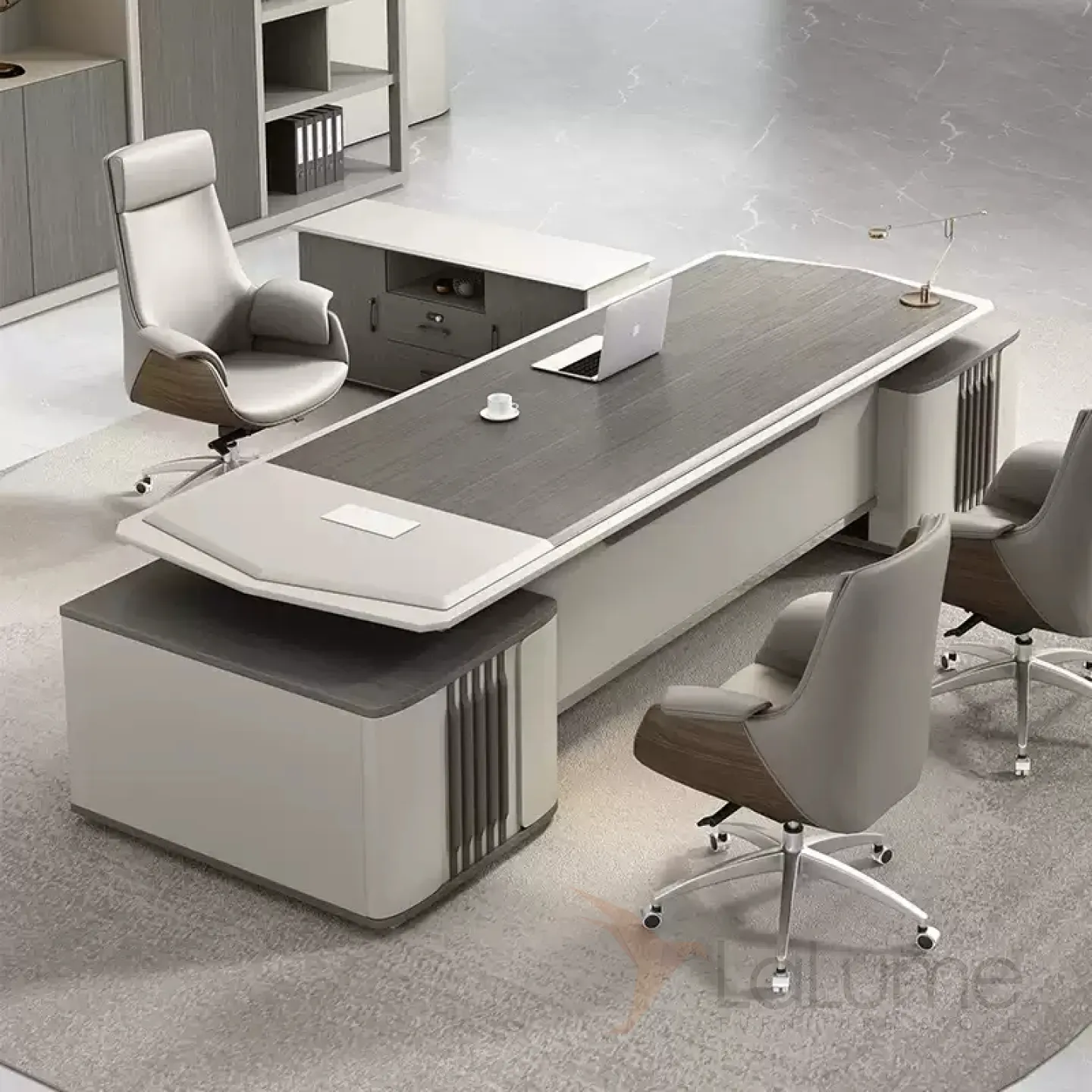 Современный стол руководителя с отделением для проводов, шкафчиком с ящиками и дверкой. На выбор стол разной длины, есть вариант с кожаным креслом и шкафом с подсветкой.