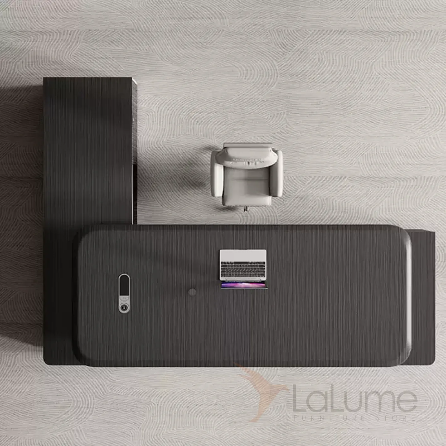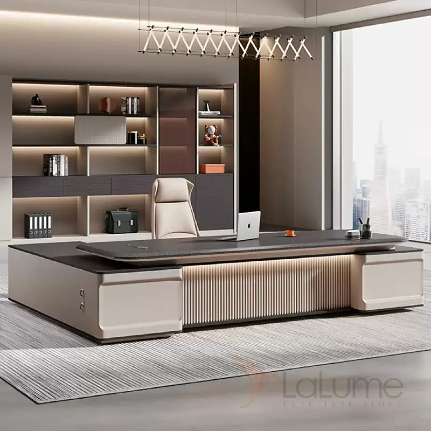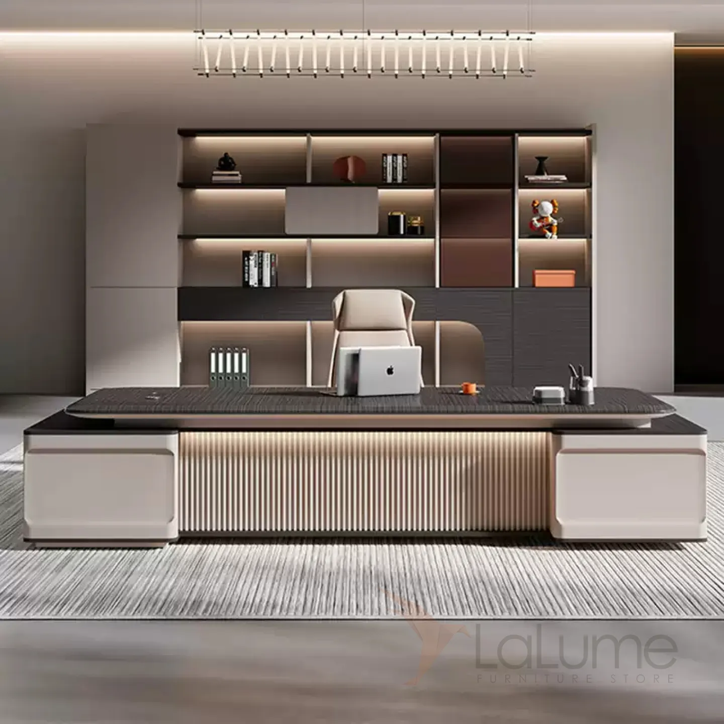 Современный стол руководителя с подсветкой, с отделением для проводов, шкафчиком с ящиками и дверкой. На выбор стол разной длины, есть вариант с кожаным креслом и шкафом.