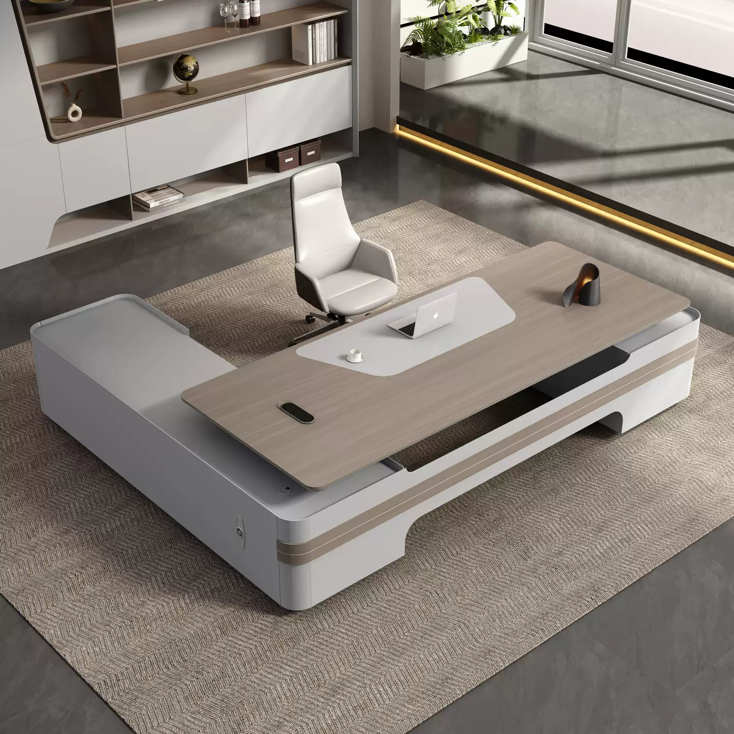 Современный стол руководителя из меламина с отделением для проводов, шкафчиком с ящиками и дверкой. На выбор стол разной длины, есть вариант с кожаным креслом и шкафом.
