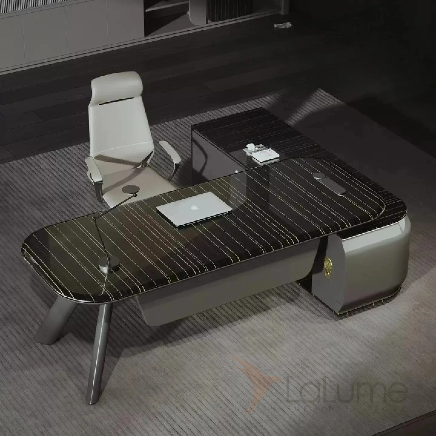 Современный стол руководителя из меламина, с отделением для проводов, с ящиками, дверками и полками для хранения. На выбор стол разной длины, есть вариант с кожаным креслом и шкафом, мягкой мебелью, чайным столиком.