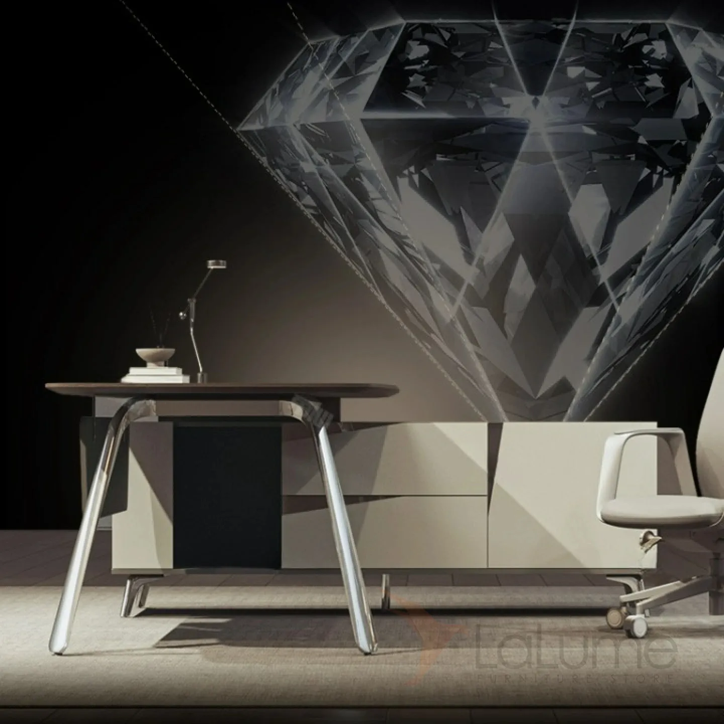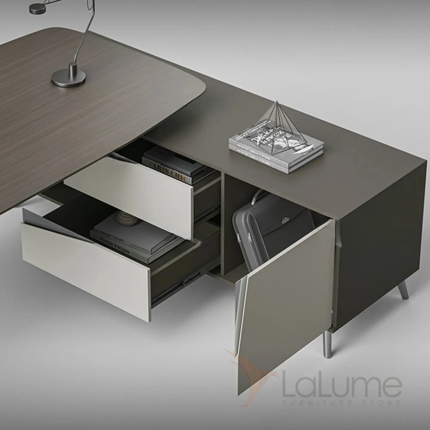Практичный стол руководителя из ДСП и металла, отделом для проводов, есть ящики, отделения с дверцами для хранения вещей. В комплекте можно приобрести шкаф, кресло.