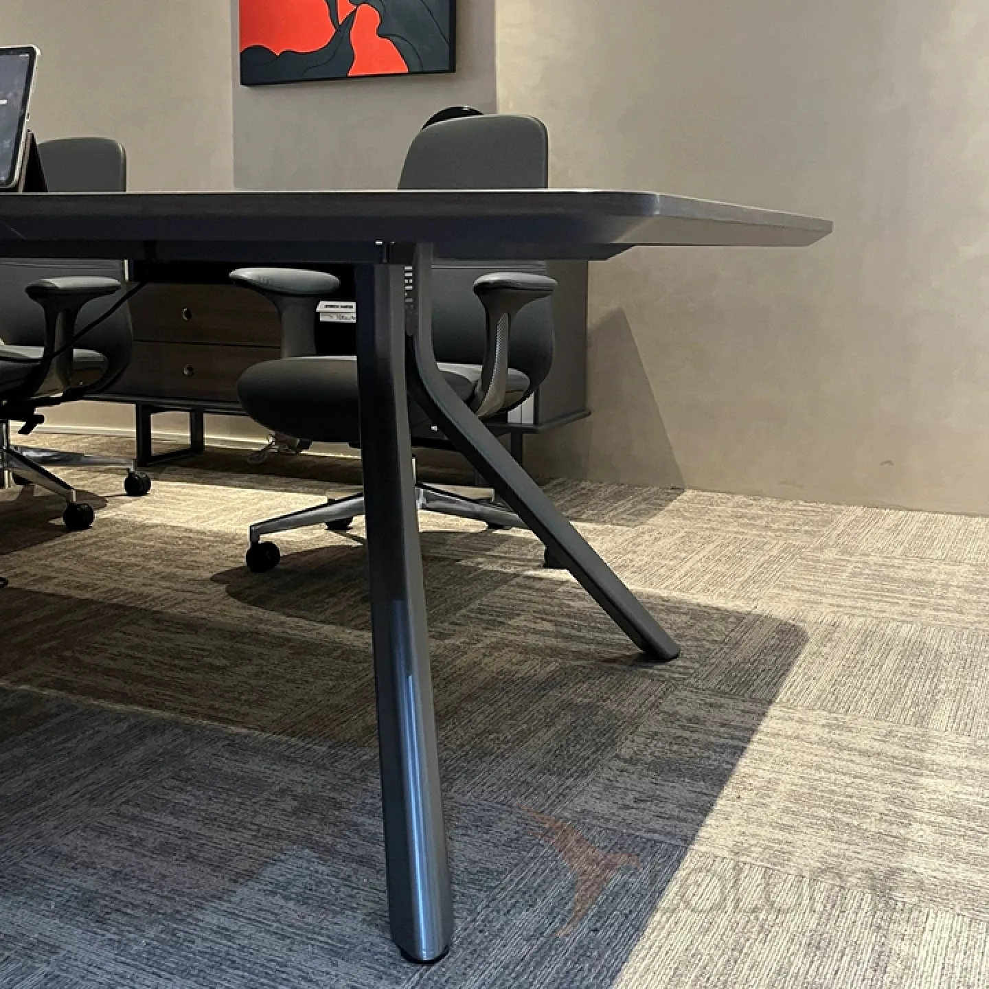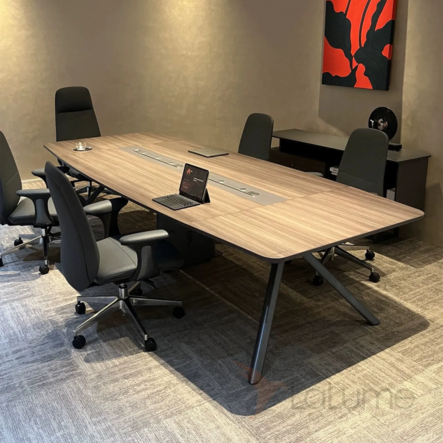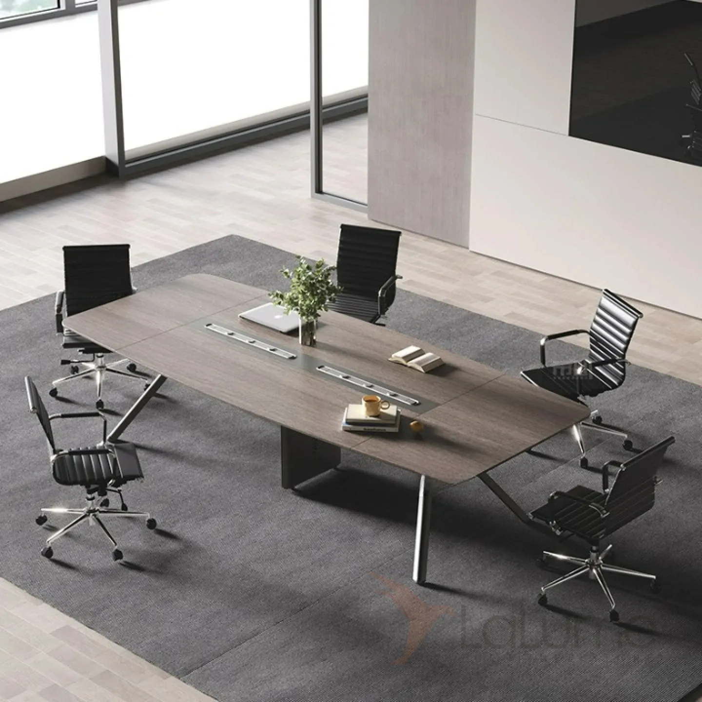 Стол для конференций из ДСП с отсеком для проводов, за ним могут комфортно разместит от 6 до 20 человек, в зависимости от длины. Есть вариант комплектации с креслами на колесиках.