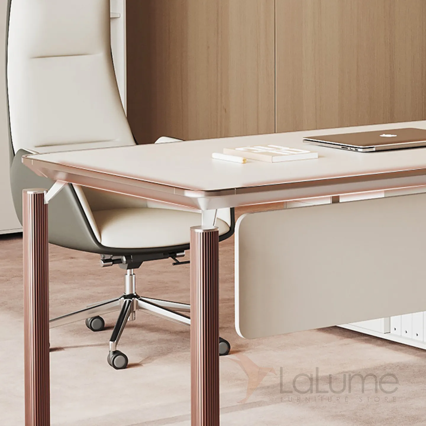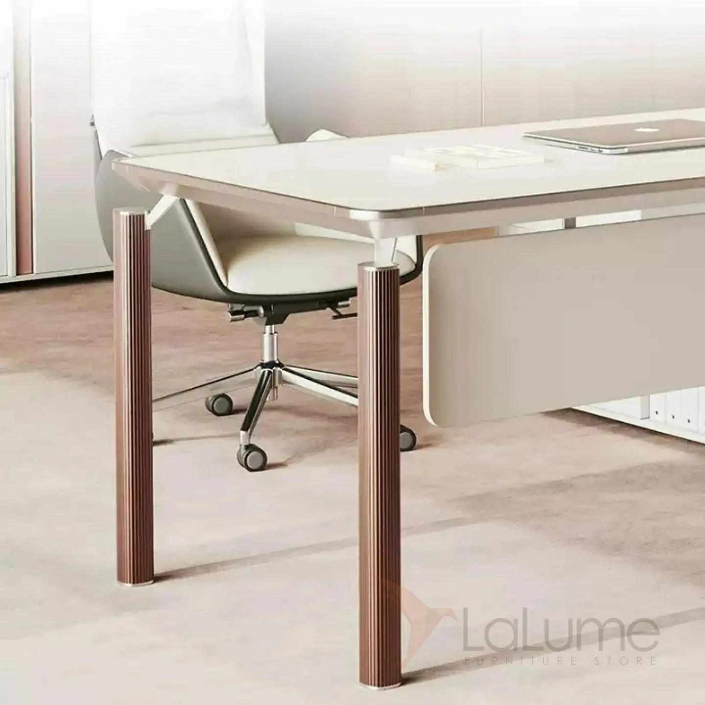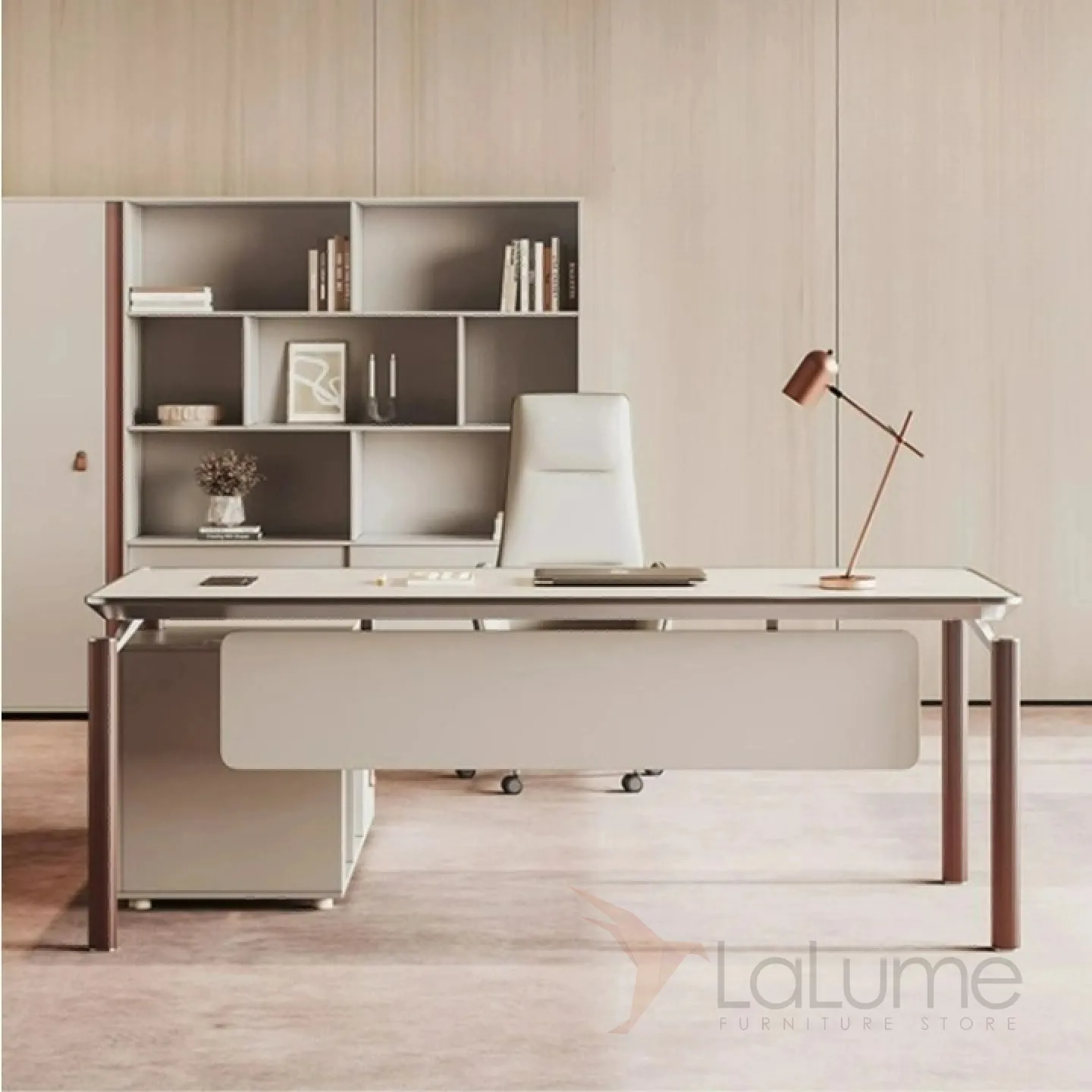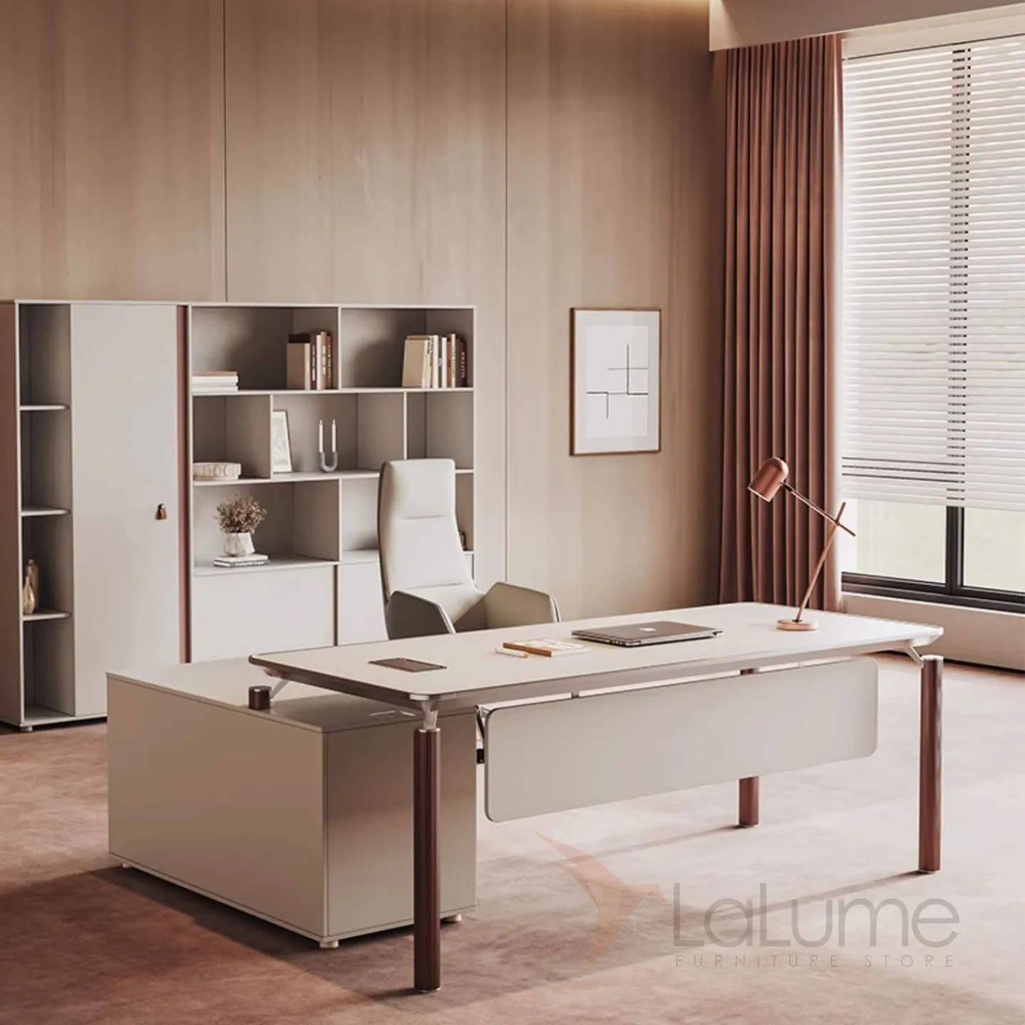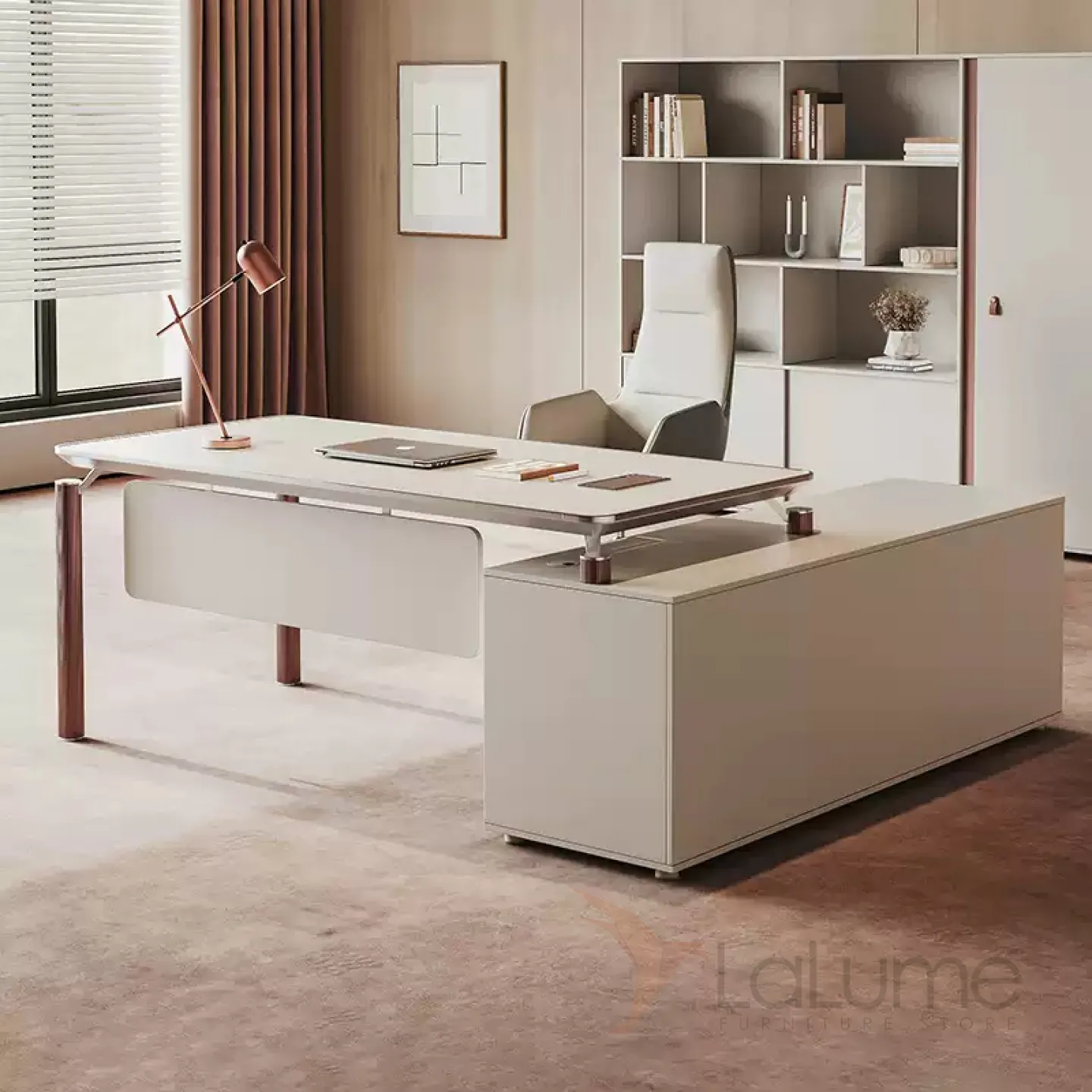 Роскошный стол руководителя из меламина с отделом для проводов, есть ящики для хранения вещей. В комплекте можно приобрести шкаф, кресло.