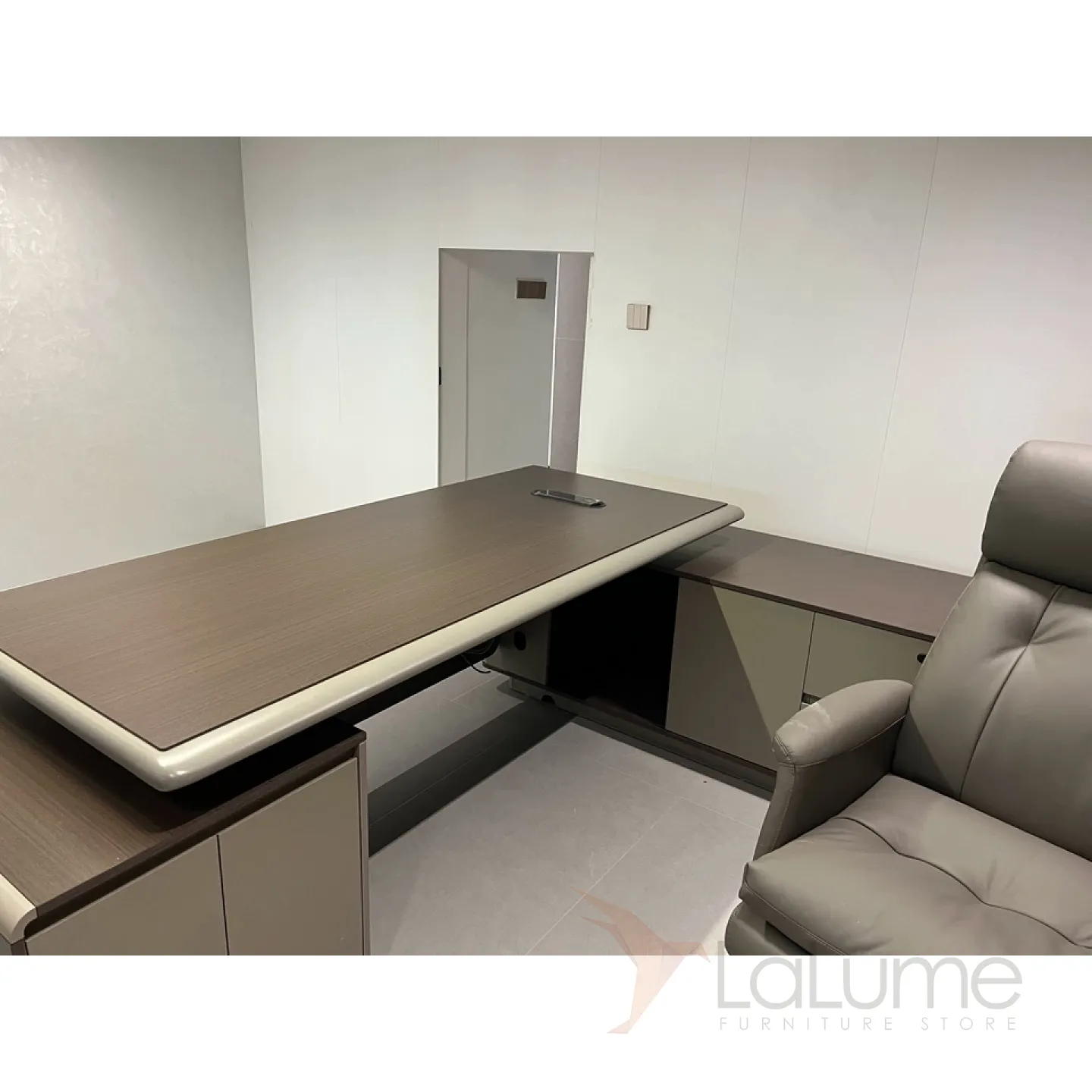 Практичный, светлый стол руководителя из ДСП, с подсветкой и с отделом для проводов, несколько ящиков и закрытых отделений для хранения вещей. В комплекте можно приобрести шкаф, кресло на колесиках.