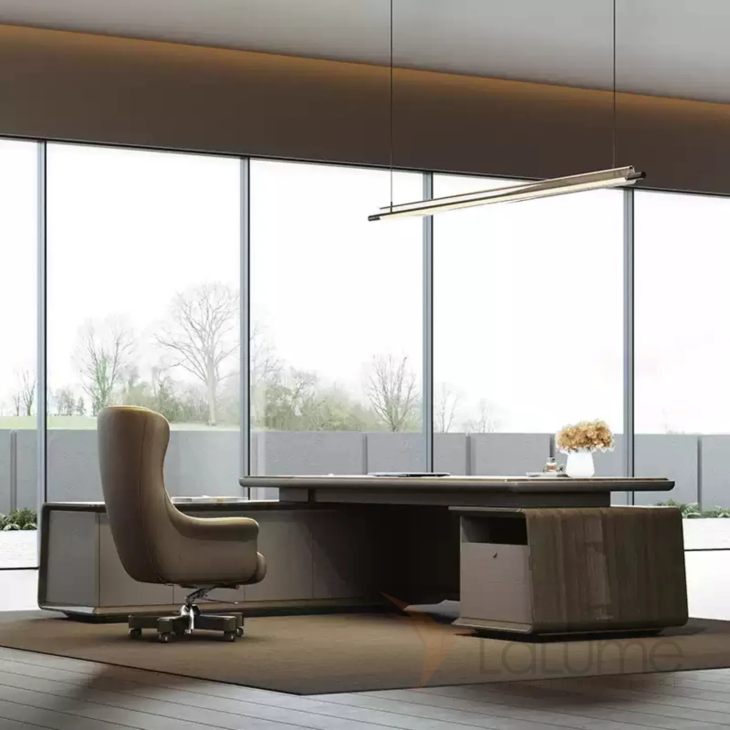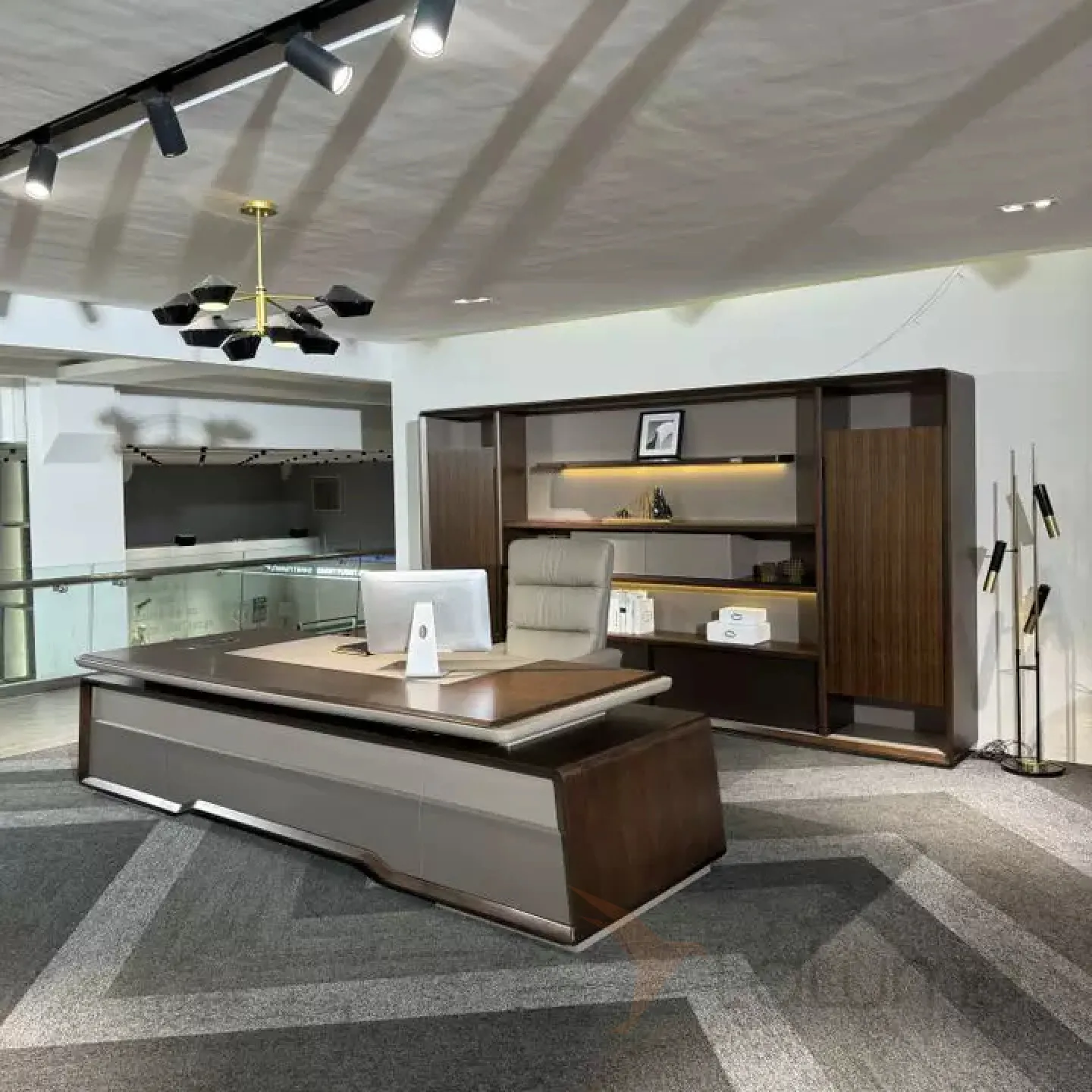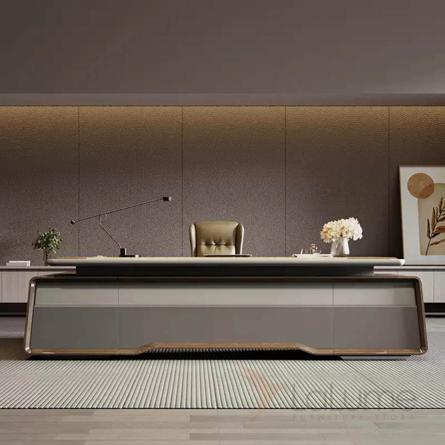 Практичный стол руководителя из МДФ на металлическом основании, удобной формы, с отделом для проводов, несколько ящиков для хранения вещей. В комплекте можно приобрести шкаф, кресло на колесиках.