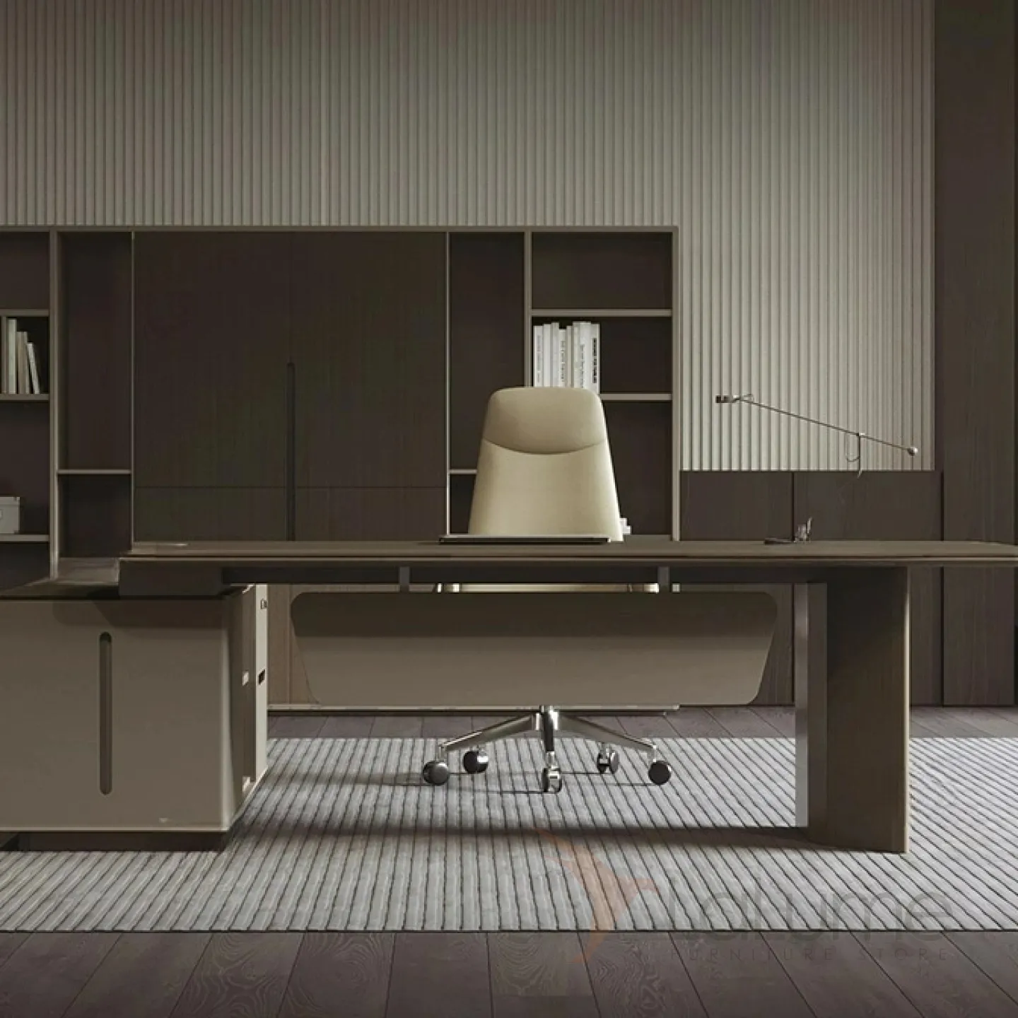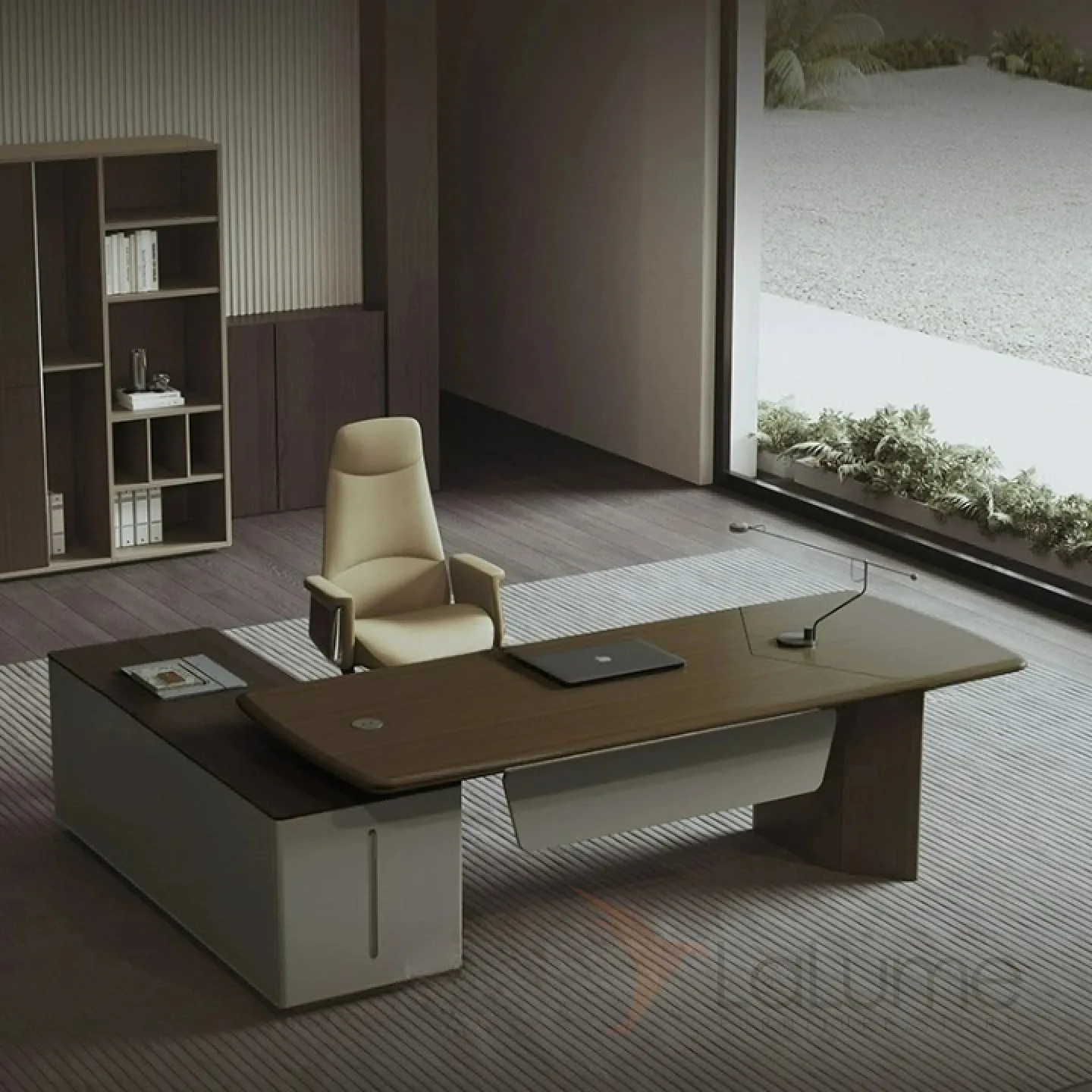 Роскошный стол руководителя из МДФ, удобной формы, с отделом для проводов, несколько ящиков для хранения вещей. В комплекте можно приобрести шкаф, кресло на колесиках.
