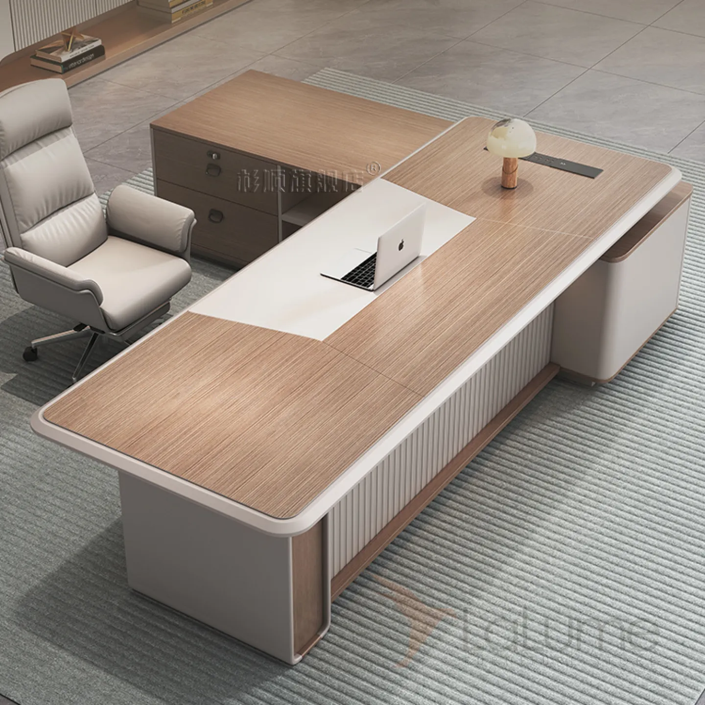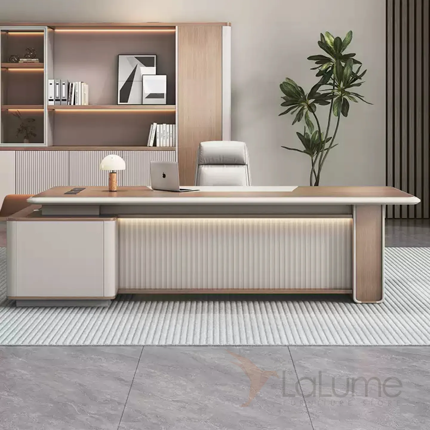 Роскошный стол руководителя из меламина с подсветкой, удобной угловой формы, с отделом для проводов, несколько ящиков для хранения вещей. В комплекте можно приобрести шкаф, кресло на колесиках.