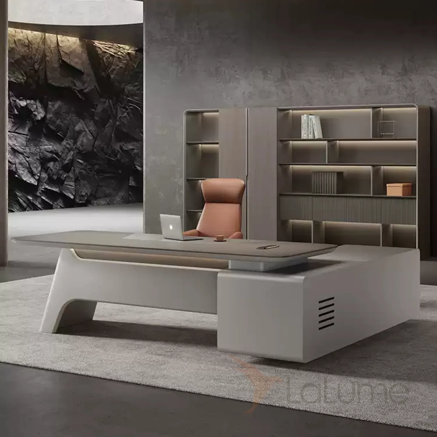 Роскошный стол руководителя из меламина удобной угловой формы, с отделом для проводов, несколько ящиков для хранения вещей. В комплекте можно приобрести шкаф, кресло на колесиках.
