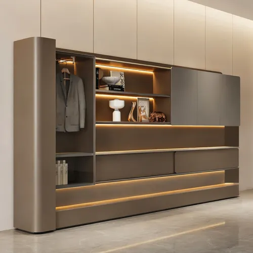 Роскошный офисный стол из меламина с подсветкой, отделением для проводов, дополнительными полками, ящиками для хранения вещей. В комплекте можно приобрести кресло на колесиках, шкаф, мягкую мебель