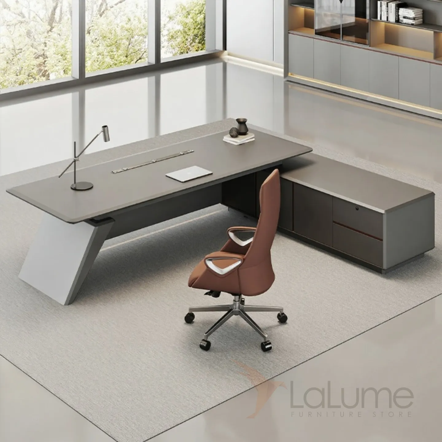 Роскошный офисный стол из меламина с подсветкой, отделением для проводов, дополнительными полками, ящиками для хранения вещей. В комплекте можно приобрести кресло на колесиках, шкаф.