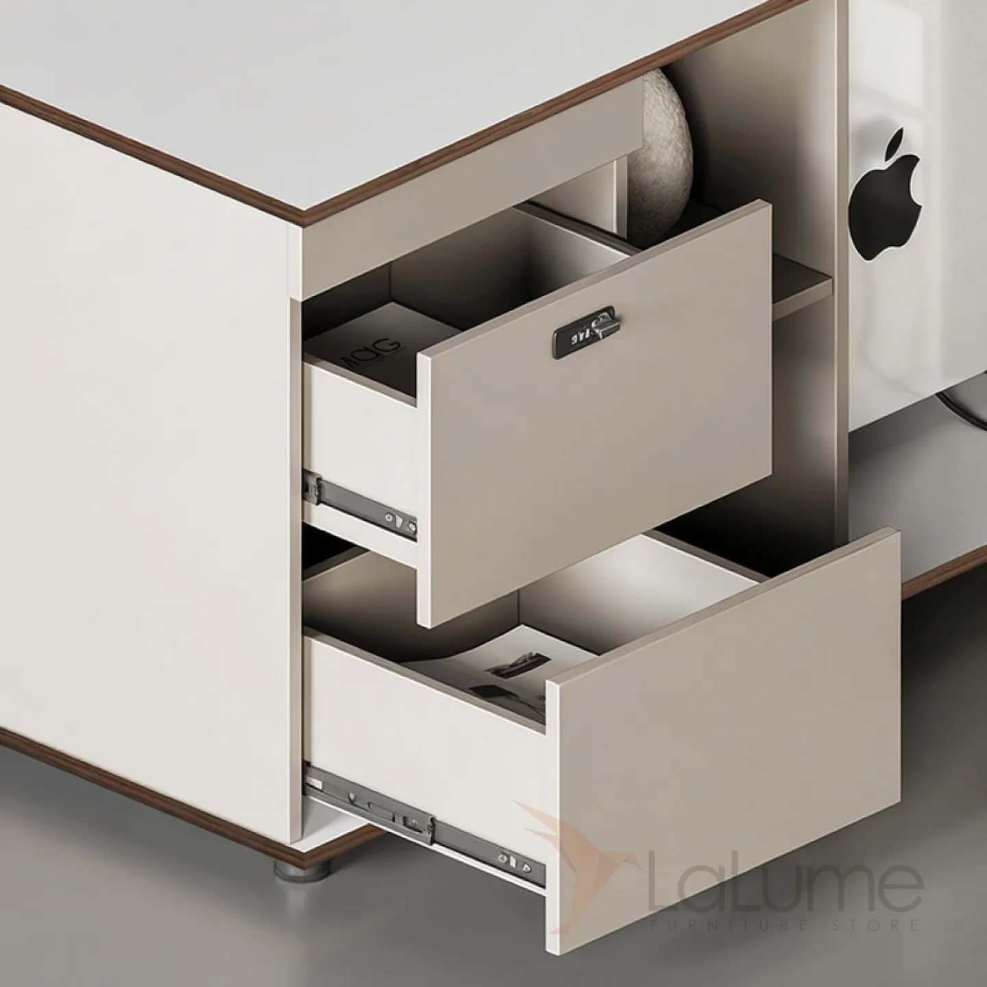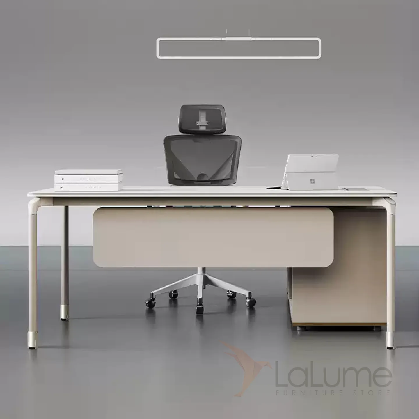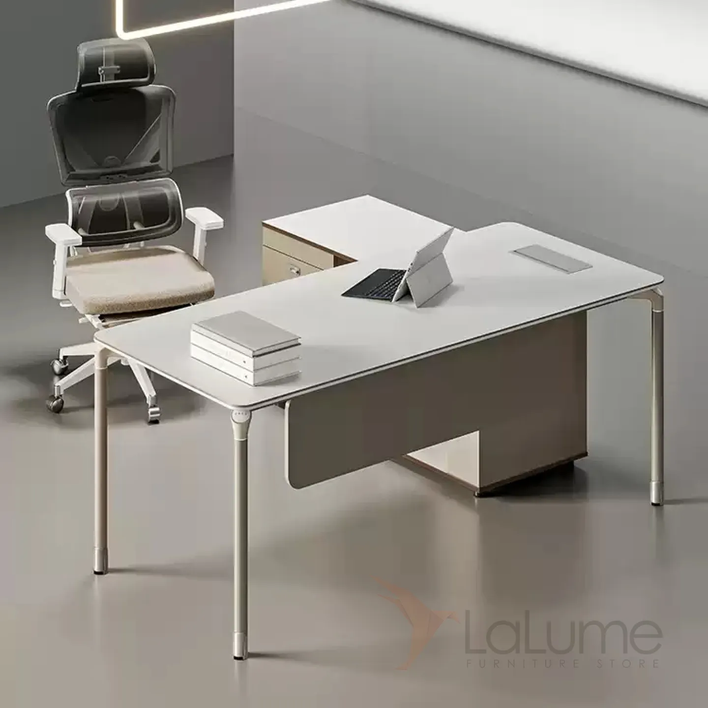 Роскошный офисный стол из меламина на ножках из нержавеющей стали с отделением для проводов, дополнительными полками, ящиками для хранения вещей. В комплекте можно приобрести кресло на колесиках.